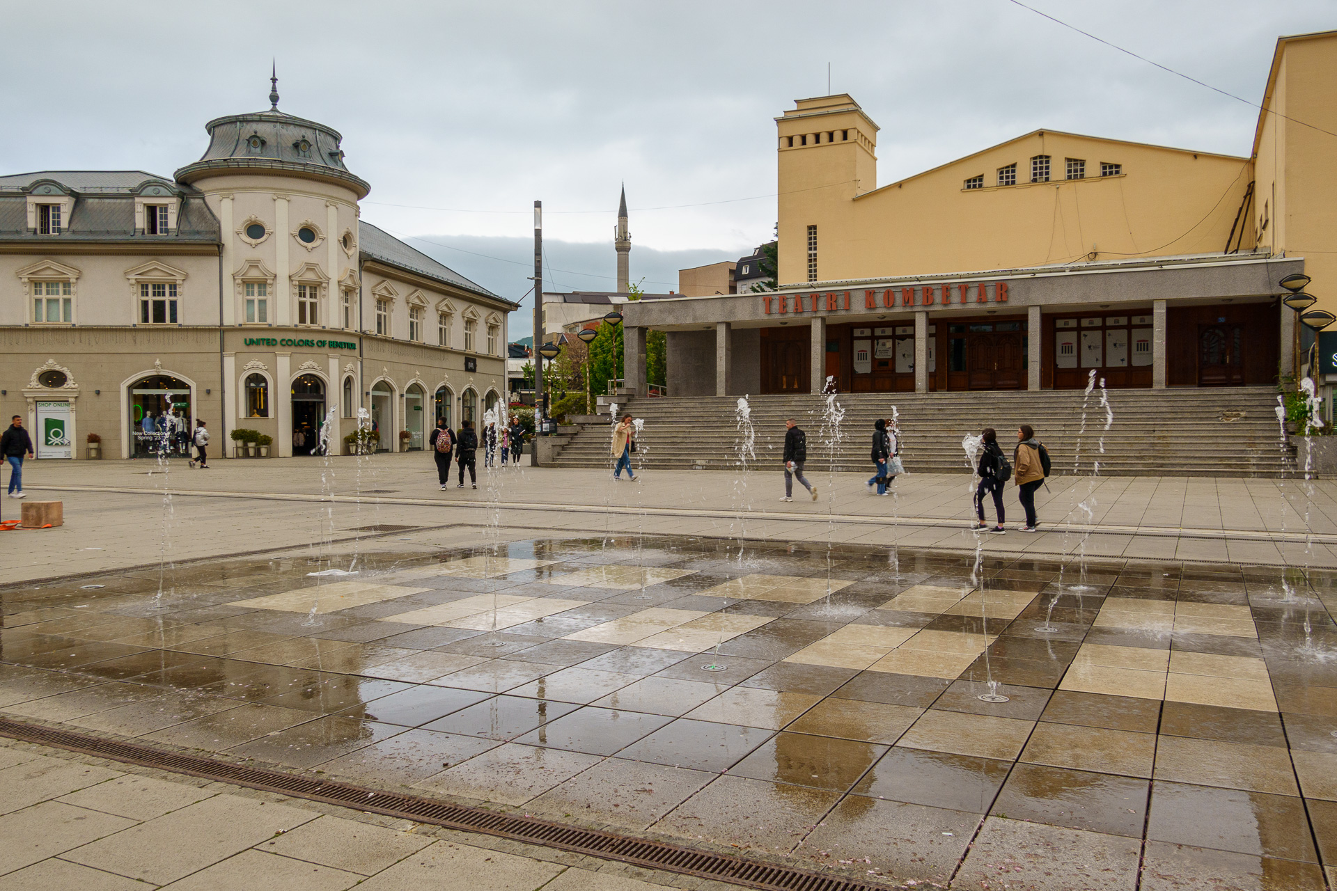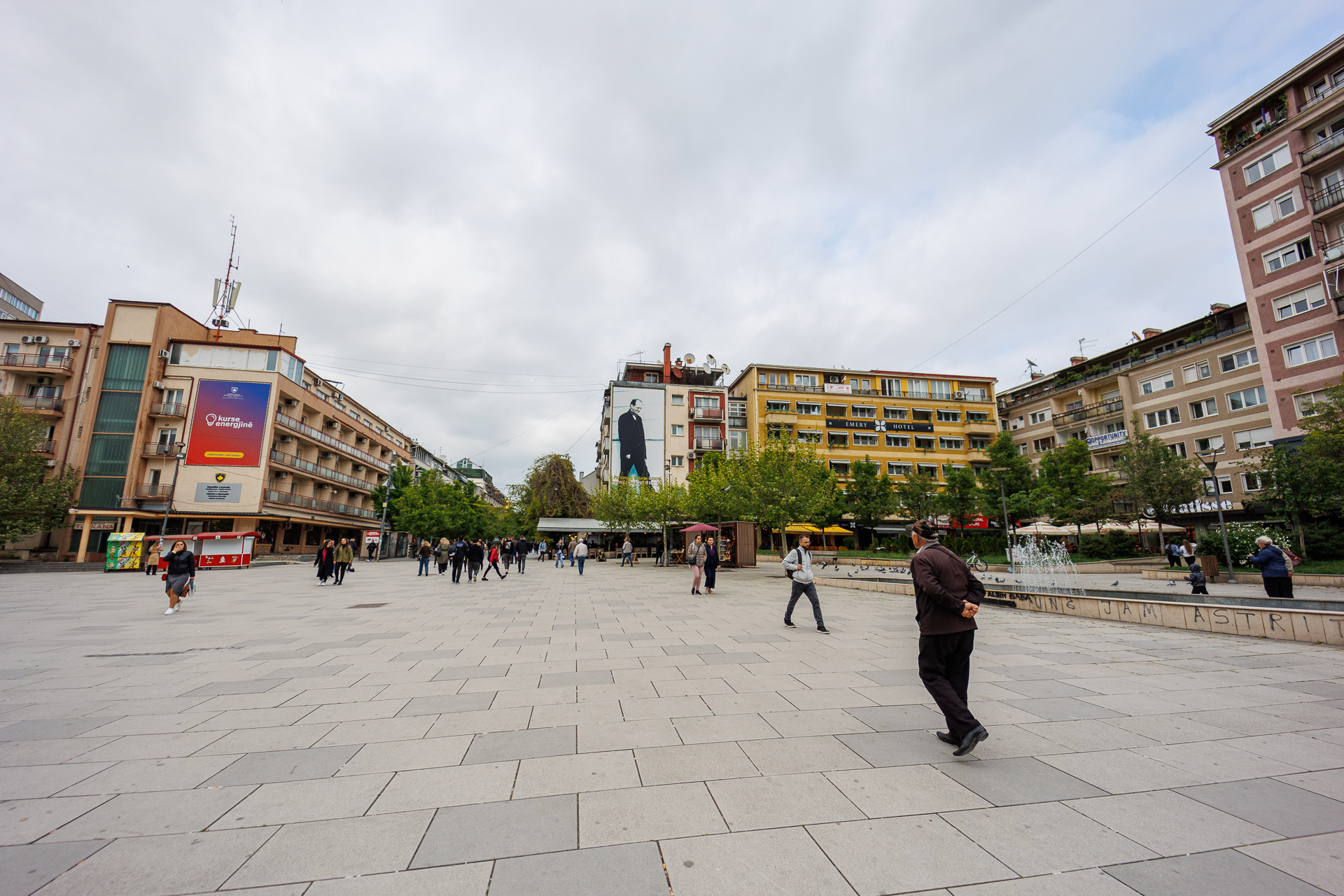 Au bout de la place, on aperçoit une grande affiche. Elle représente Ibrahim Rugova qui fut le président du parti de la Ligue démocratique du Kosovo de sa création le 23 décembre 1989 jusqu’à sa mort en 2006 et le président du Kosovo du 24 mai 1992 au 21 janvier 2006. Il incarne la lutte des albanophones pour leur indépendance vis-à-vis de la Serbie et gagne le surnom de « Gandhi des Balkans » dans une allusion à son choix de la non-violence pendant la répression sous le régime Milosevic.