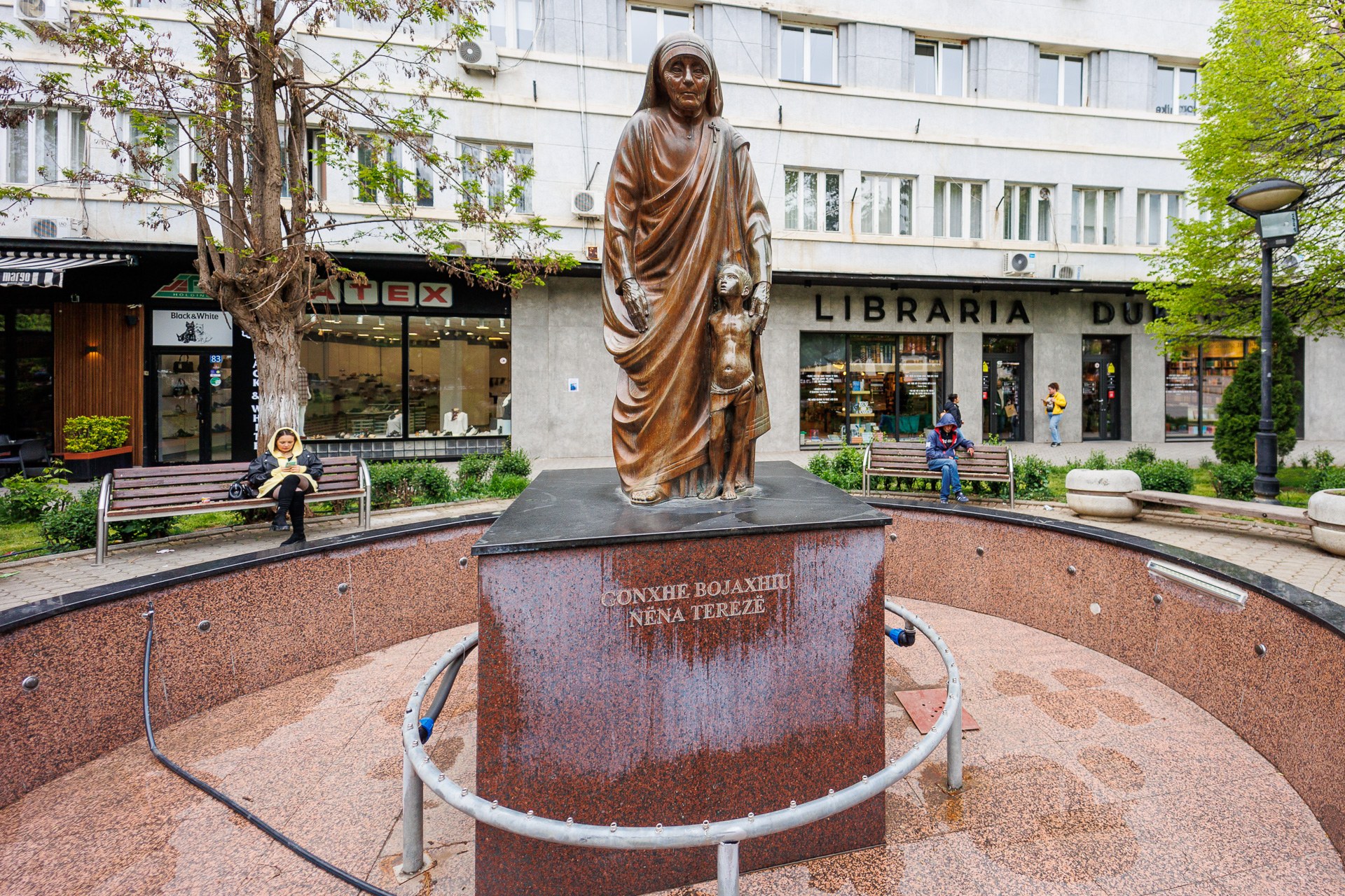 Sur le boulevard Mère-Theresa, nous trouvons sa statue joliment installée sur une petite placette (au premier plan, pas au second 😉)