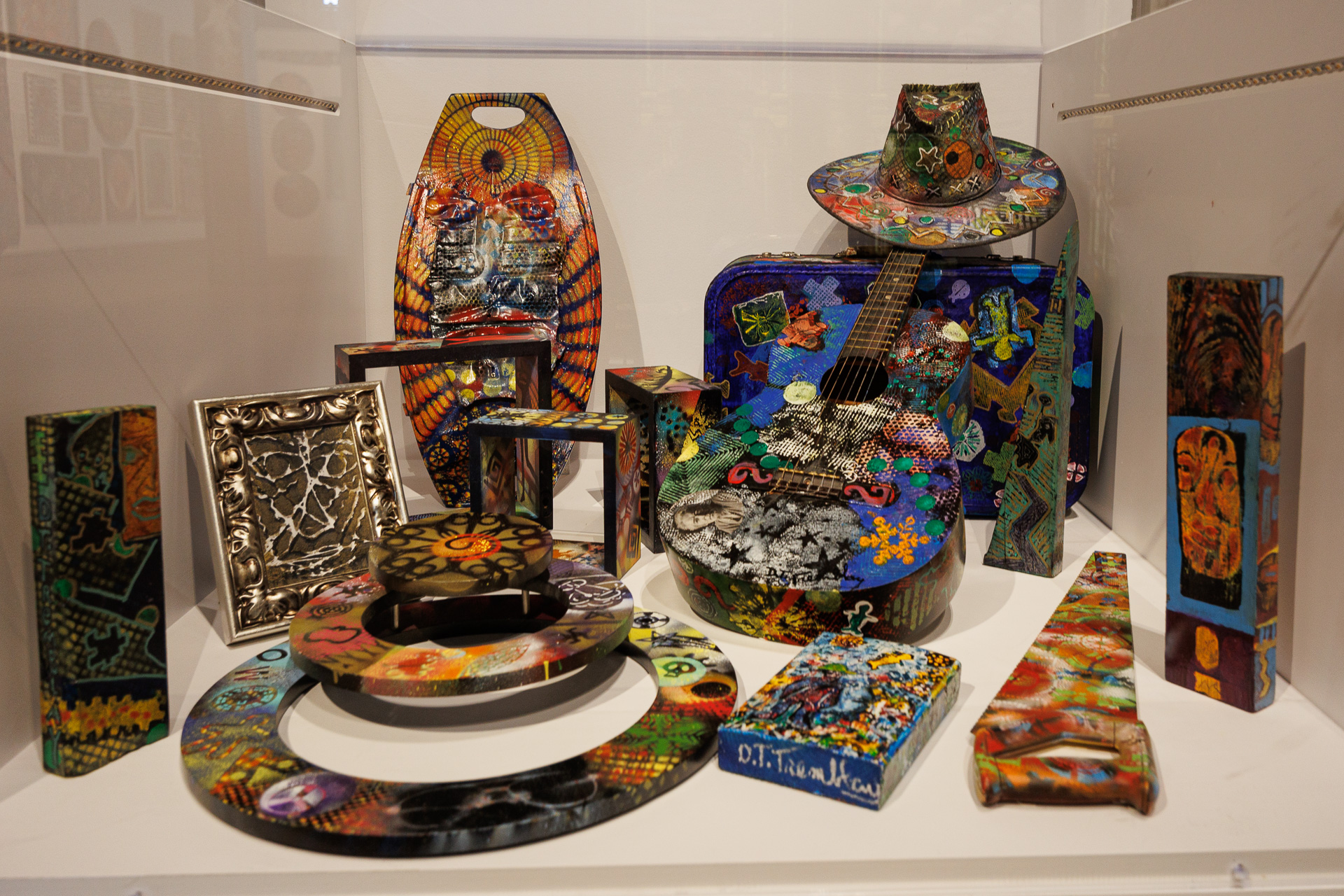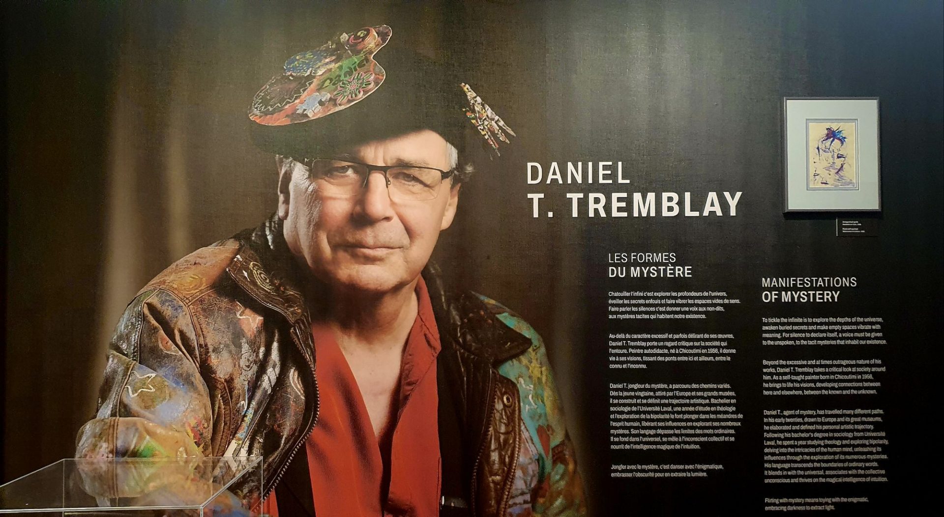 Notre visite du musée se poursuit avec l’exposition de Daniel T. Tremblay, artiste local. C’est un artiste original… il peint avec tout et il peint sur tout ! En effet, une des caractéristiques de cet artiste, c’est qu’il peint sur à peu près n’importe quels objets…