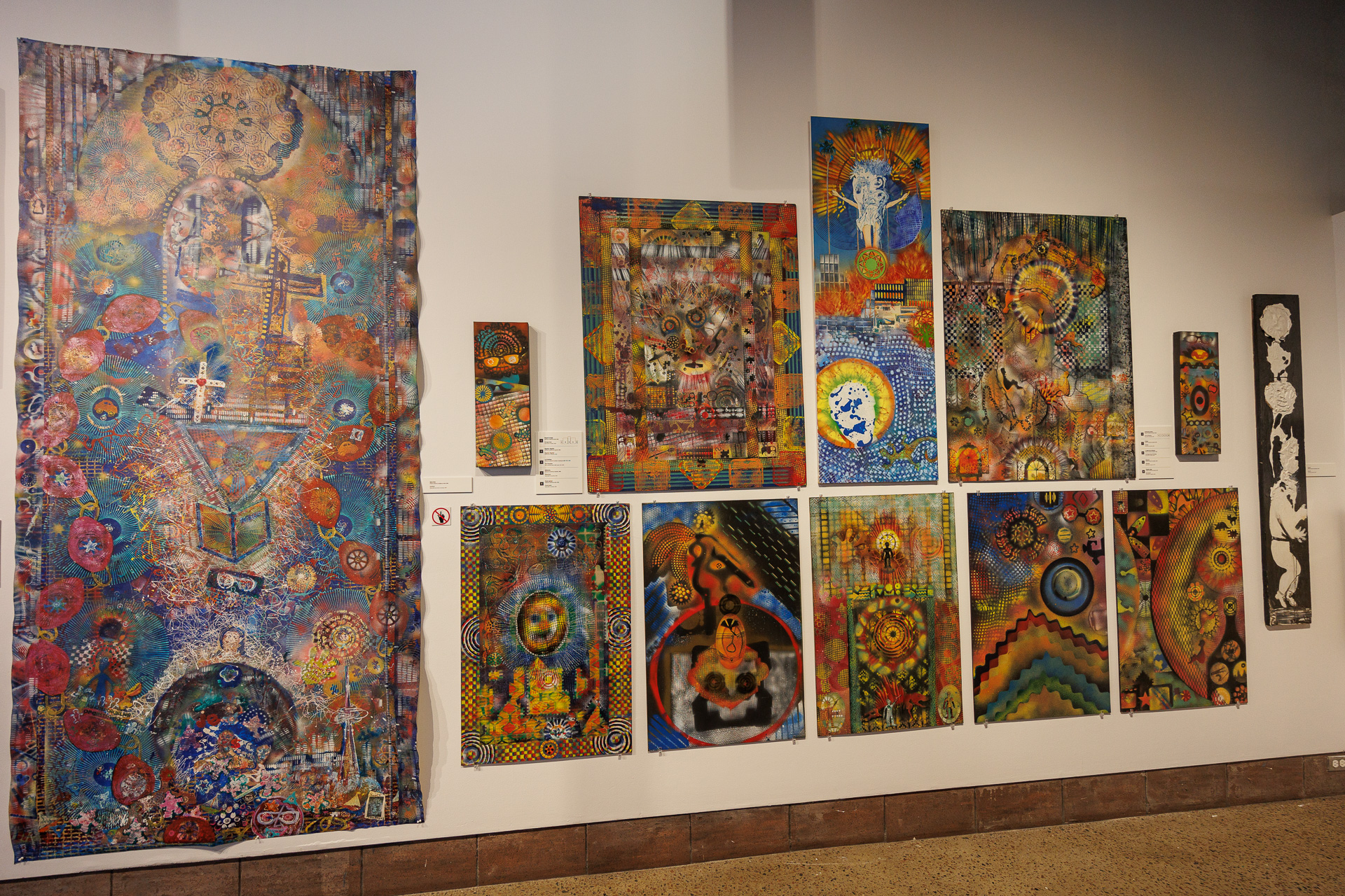 mais il peint également sur toiles. Les couleurs utilisées sont chatoyantes !