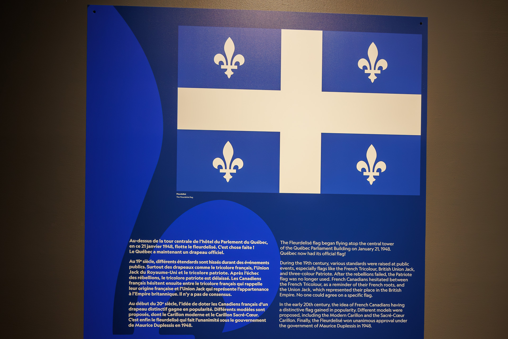 Puis une exposition sur l’origine du drapeau québécois : le Fleurdelisé… joli nom pour un drapeau ! Il est levé pour la première fois le 21 janvier 1948 au sommet de la tour centrale de l’Hôtel du Parlement, dans la ville de Québec. Le fleurdelisé flotte aujourd’hui sur tous les édifices publics et partout dans le monde sur les délégations et bureaux du Québec à l’étranger.