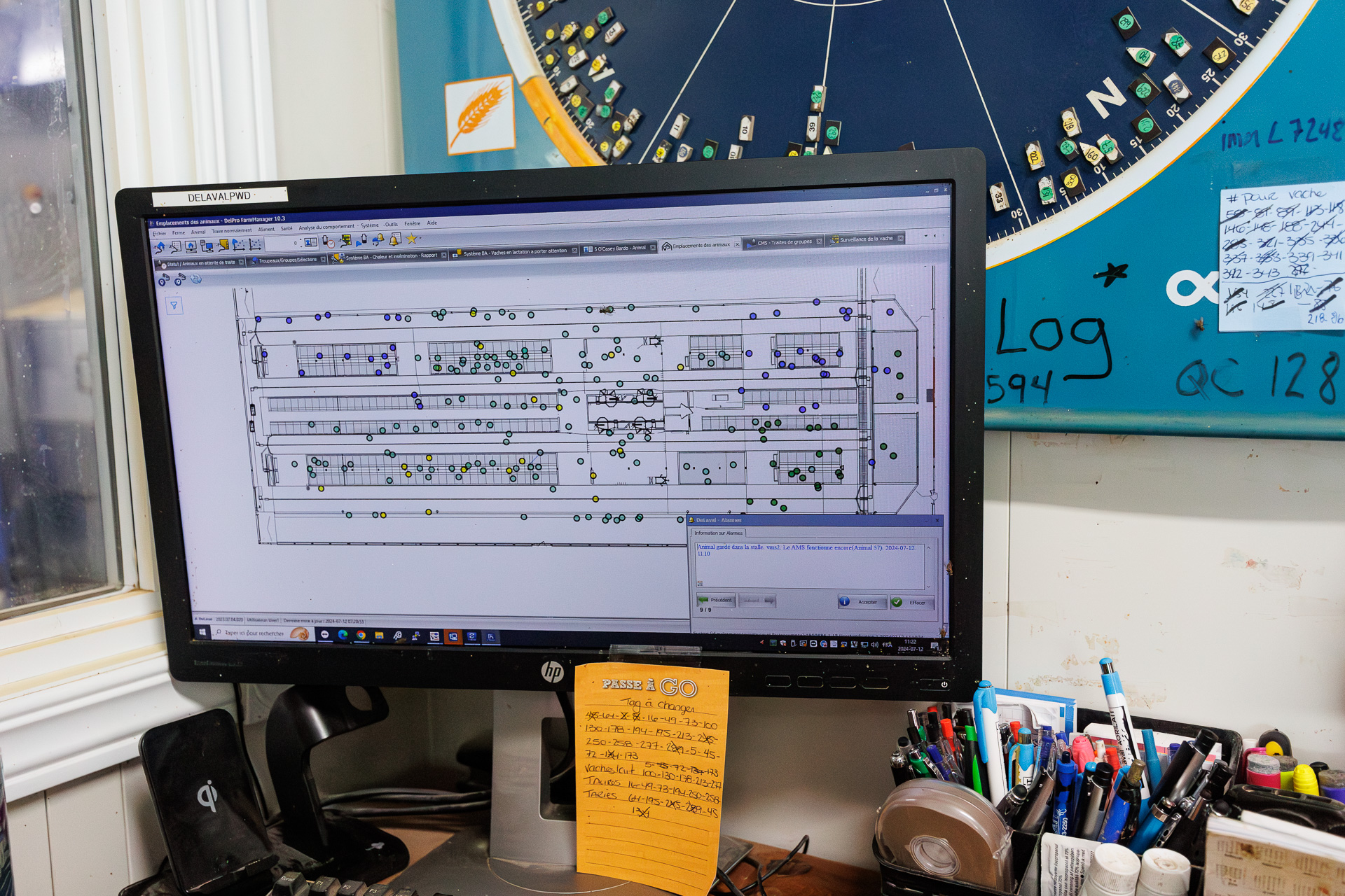 Chaque vache est pucée. Chaque petit point correspond à un animal. Il y a plus de 300 vaches !! On sait à tout moment ce qu’elle fait ou si elle est malade ! On sait même si elles montent l’une sur l’autre, ce qui est un signe 😉