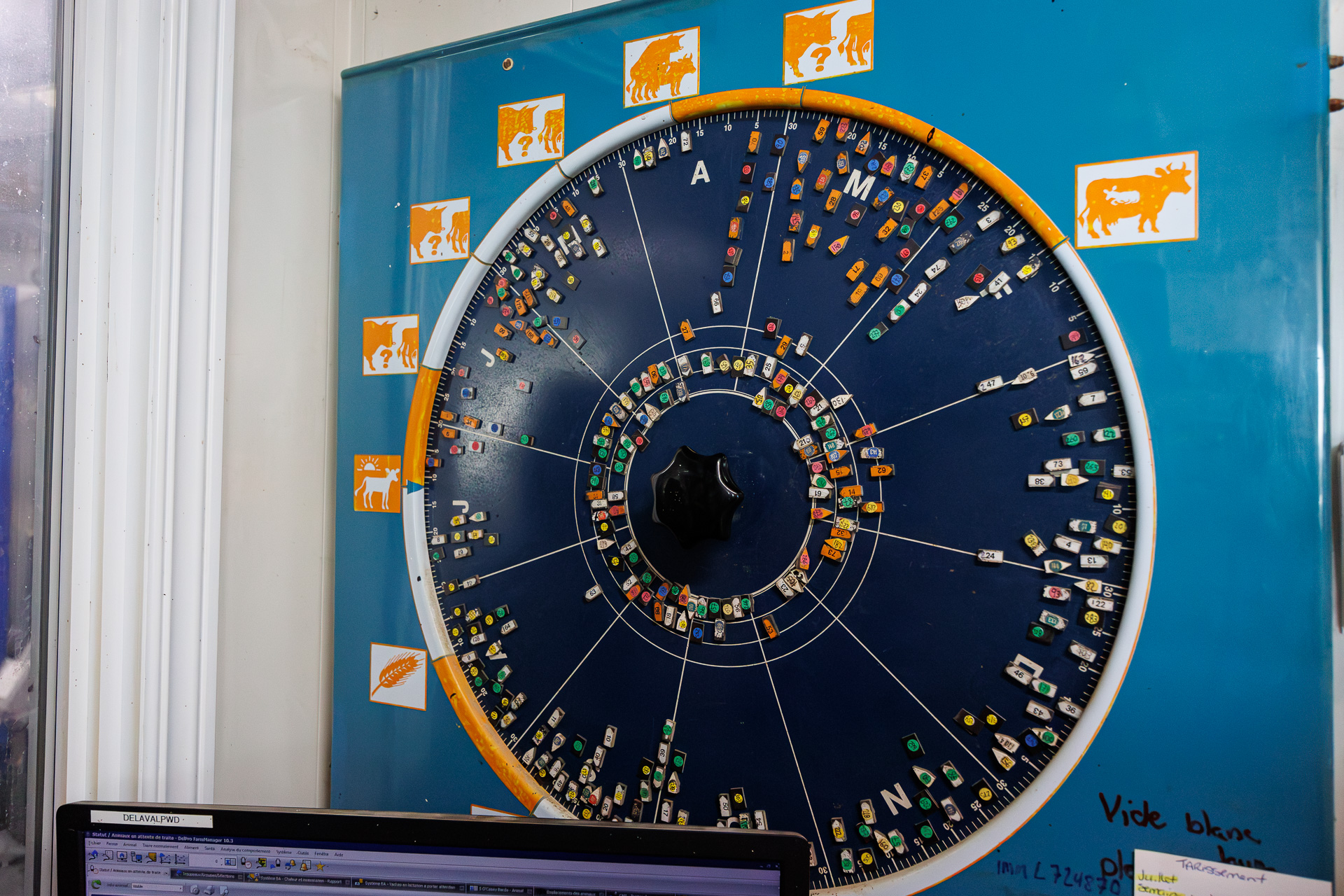 Ce panneau qui ressemble à un panneau de jeu de fléchettes représente la méthode de suivi annuel du cycle des vaches avant la mise en place de l’informatique. Tous les petits signets de couleurs correspondent à un animal précis… quel travail de suivi ! L’informatique a bien soulagé tout cela 😜.