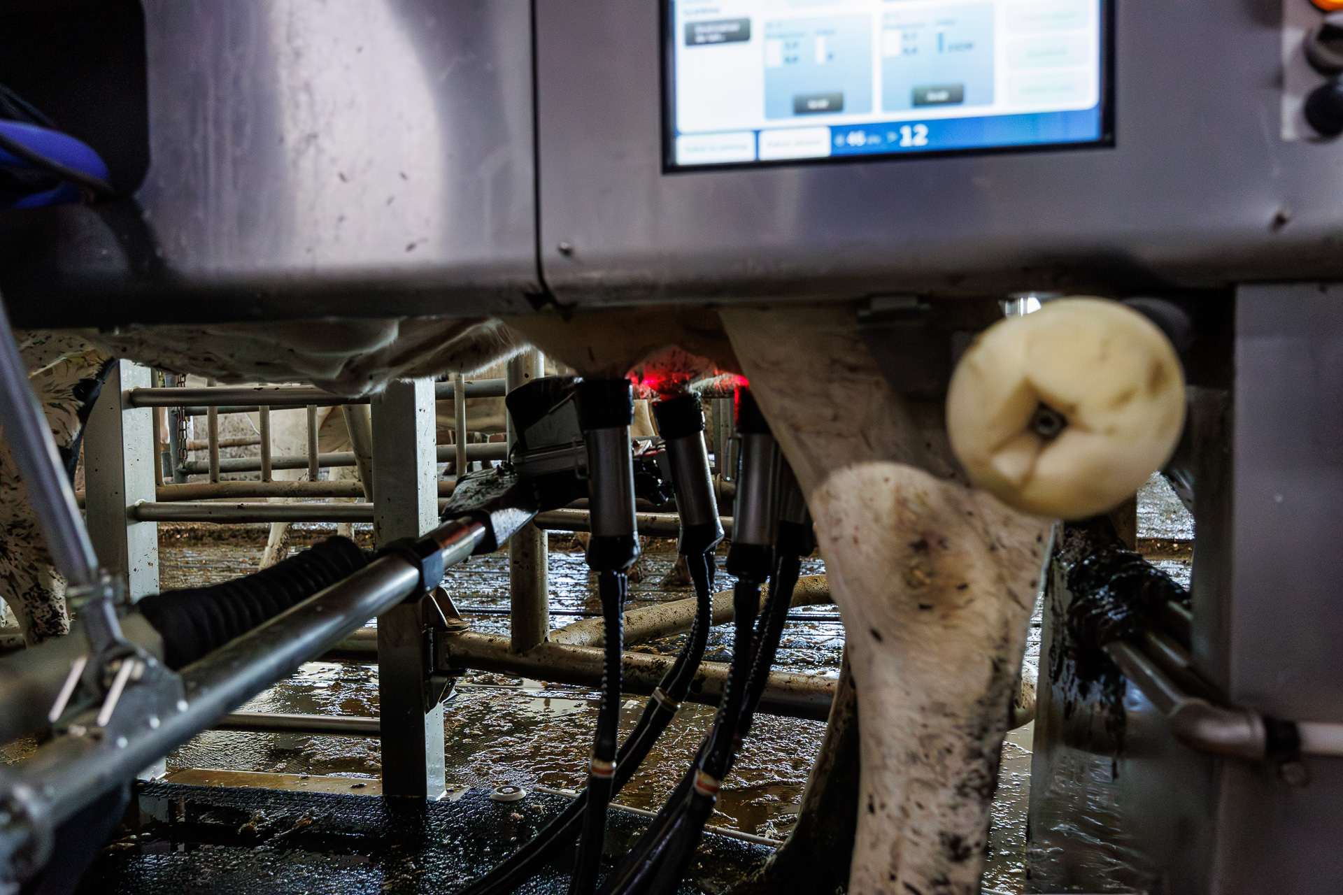 Une machine effectue le nettoyage des pis et procède à la traite…