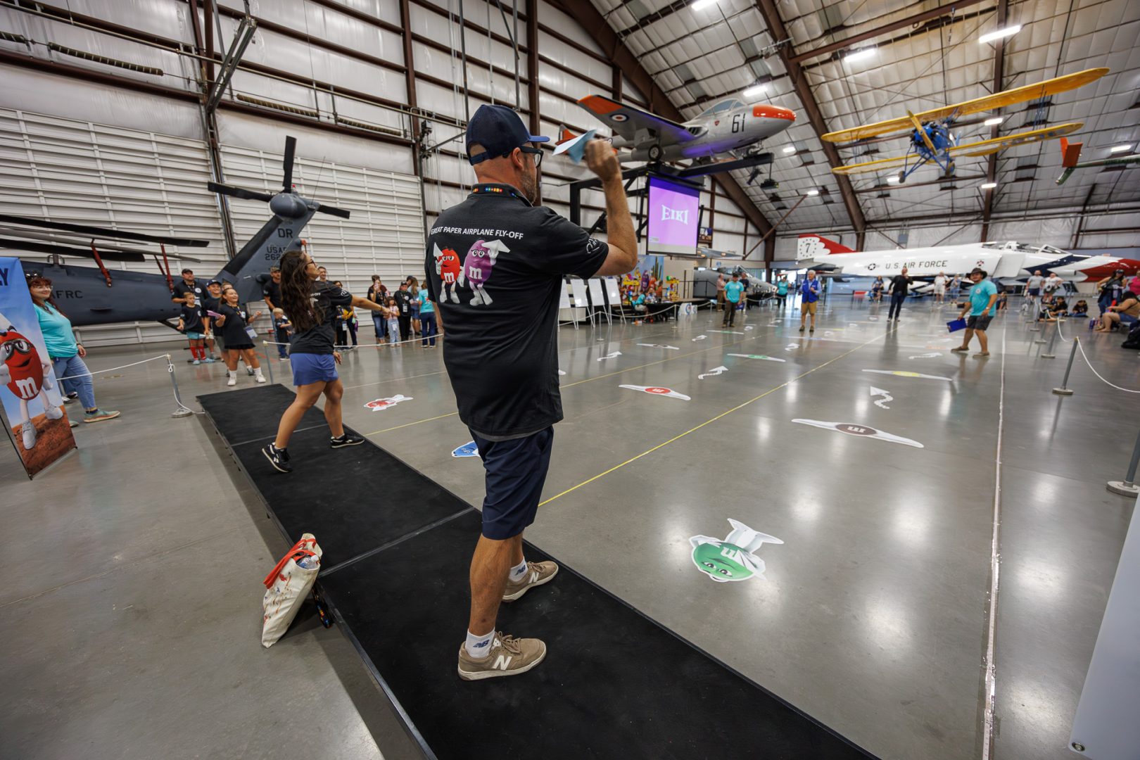 Une petite animation aéronautique nous attend : le vol le plus long (en distance) d’un avion en papier. Les concurrents sont motivés et le match est rude 💪. Certains avions traversent le hangar et il faut faire attention de ne pas se faire percuter par un avion en vol… mais la collision n’est pas douloureuse 🤣 !