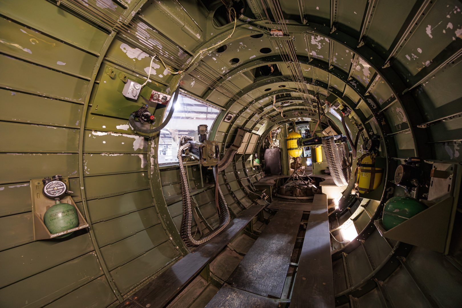 On aperçoit sur la photo ci-dessous la tourelle à bille Sperry située sous le bombardier B-17 Flying Fortress. Ces tourelles étaient des postes de tir rotatifs, contrôlés à distance ou occupés par un mitrailleur, utilisés pour défendre le dessous de l’avion pendant la Seconde Guerre mondiale. Le mitrailleur y était confiné dans un espace très restreint en position fœtale pour opérer les mitrailleuses. La tourelle pouvait pivoter à 360 degrés pour couvrir un large champ de tir. Un système de palans permettait de rentrer entièrement la tourelle dans la carlingue afin que le mitrailleur puisse s’y installer et en ressortir avant l’atterrissage.