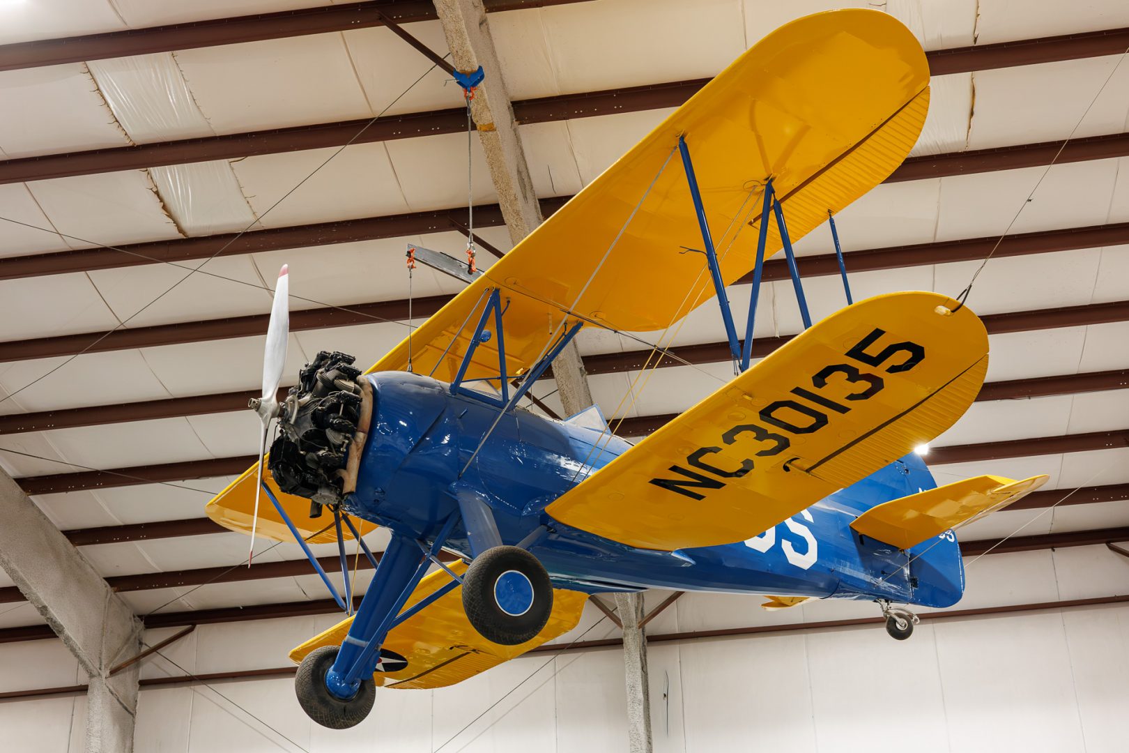 Cet avion est un Boeing-Stearman Model 75, également connu sous le nom de PT-17 Kaydet. Il s’agit d’un avion biplan d’entraînement primaire emblématique utilisé par l’armée américaine, notamment l’US Army Air Forces et la Navy, pendant la Seconde Guerre mondiale. Il est réputé pour sa construction robuste avec un fuselage en acier soudé et des ailes en bois recouvertes de tissu. La version PT-17 est équipée d’un moteur en étoile Continental R-670. Après le conflit, des milliers d’exemplaires ont été vendus sur le marché civil pour des usages variés, notamment comme avions agricoles pour l’épandage, avions de sport ou pour la voltige aérienne. Marc adore det avion qui ressemble beaucoup au WACO de ses rêves 😉.