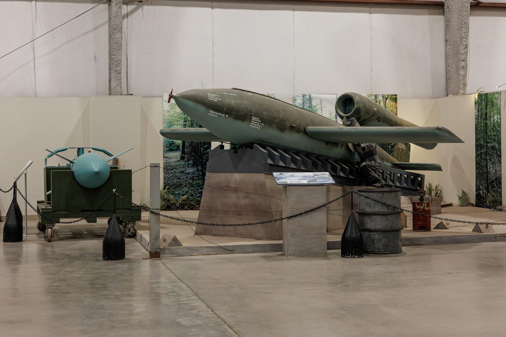Nous voilà devant le premier missile de croisière opérationnel au monde, le FI103 ou V1. Il fut la première des « armes miracles » que les dirigeants allemands pensaient capables de transformer la défaite en victoire. Le concept d’une bombe volante autoguidée propulsée par un pulsoréacteur remonte à 1942 et intéressa rapidement la Luftwaffe, qui subissait de lourdes pertes en bombardiers et en équipages. Le FI103 effectua son premier vol en décembre 1942, mais des problèmes de production et d’exploitation de cette nouvelle arme retardèrent sa première utilisation opérationnelle jusqu’au 12 juin 1944, date à laquelle les premiers V1 furent tirés sur Londres. Finalement, plus de 5800 de ces missiles atterrirent en Angleterre, tuant plus de 8000 personnes