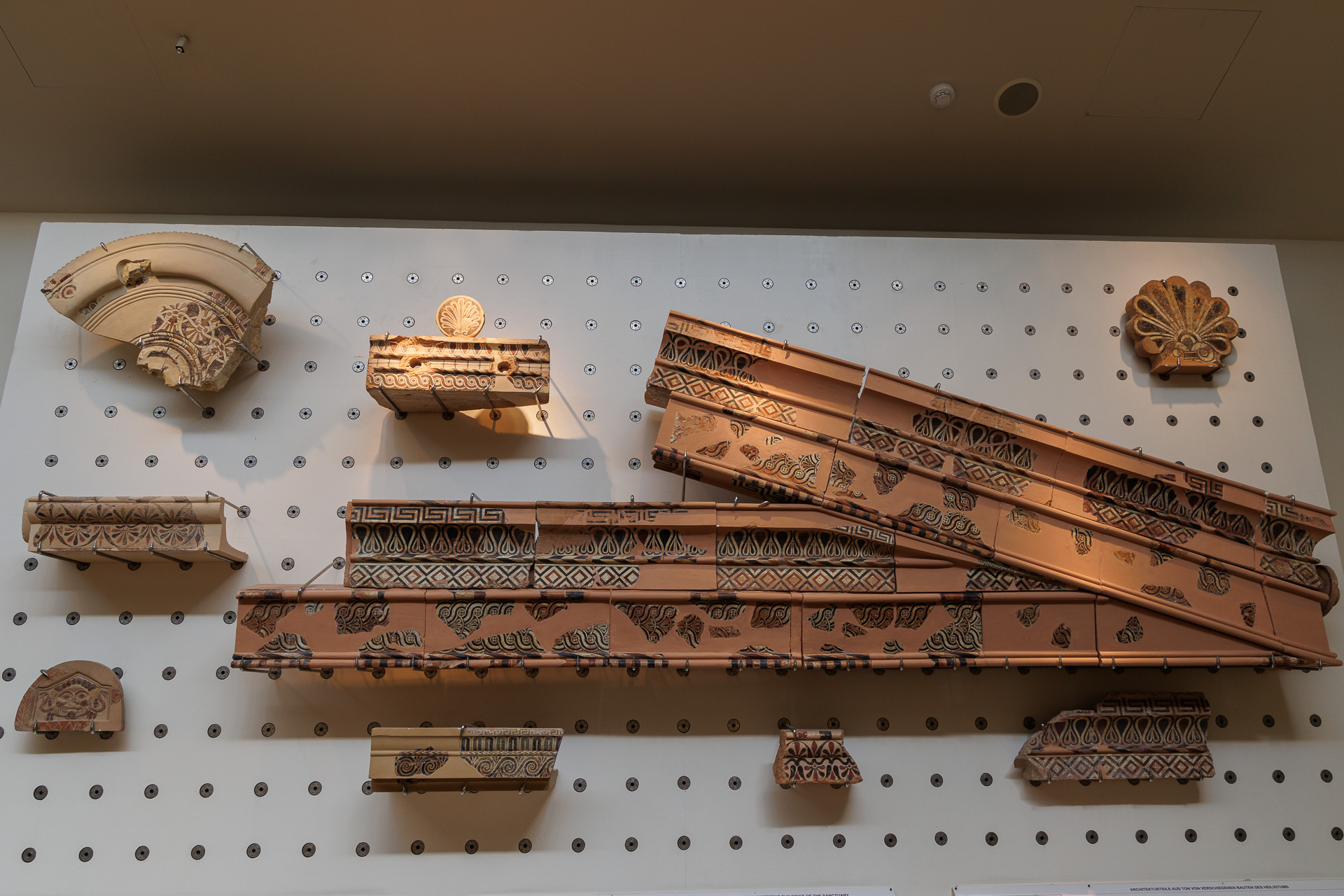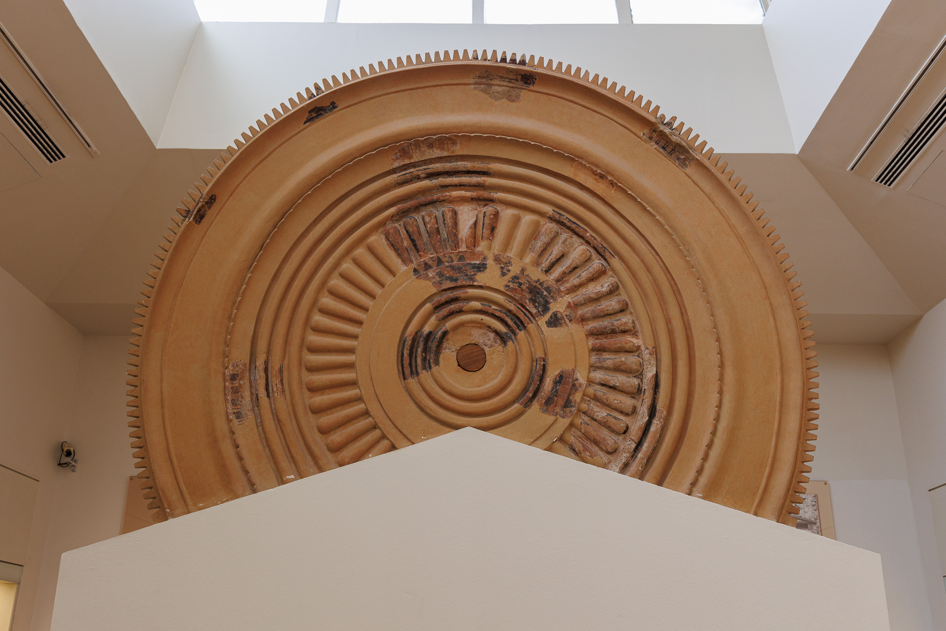 Cet acrotère discoïde en terre cuite couronnait le fronton Est du Temple d’Hera. Il est unique par sa taille. On pense que les acrotères représentaient le soleil ou un autre corps céleste.
