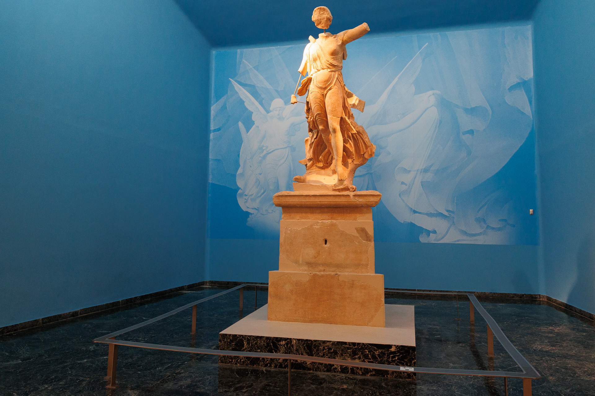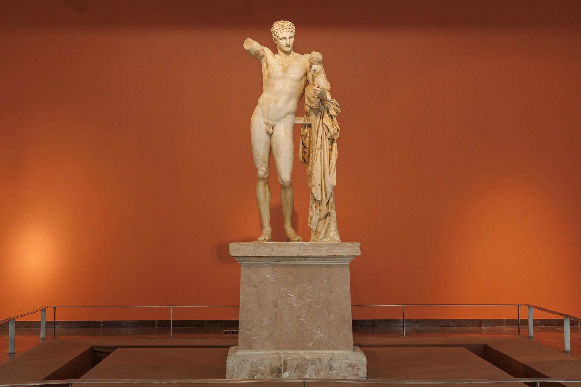 Une salle du musée a été spécialement conçue pour accueillir l’Hermès portant Dionysos, enfant de Praxitèle. La statue en marbre de Paros et haute de 2,13 m dispose en effet d’une base antisismique et d’un éclairage spécifique à base de lumière naturelle.