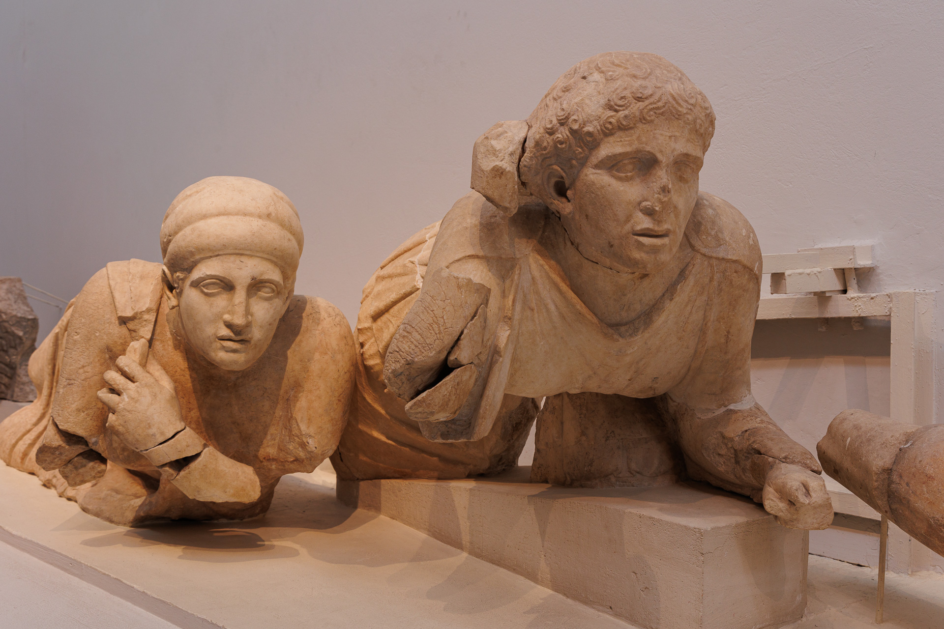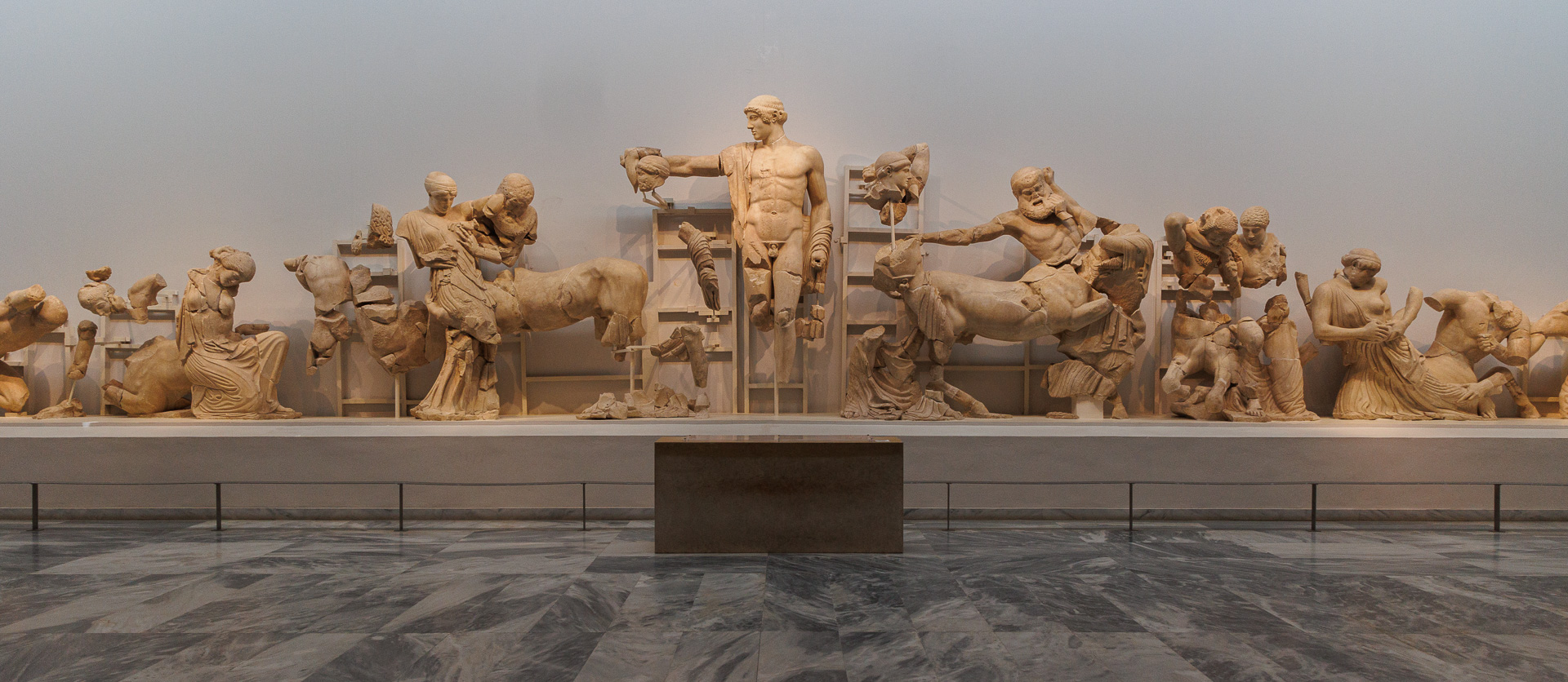 Reconstitution, avec les statues d’origine remises en état, du fronton du temple de Zeus. Le dieu Apollon, figure centrale, semble au-dessus de la mêlée. Le côté droit, le mieux préservé, présente d’abord Hippodamie agressée par Eurytion que Pirithoos s’apprête à frapper. Ensuite, un jeune homme est saisi par un centaure. Plus loin, une femme lapithe, le vêtement déchiré, se libère d’un centaure blessé par l’épée d’un Lapithe agenouillé. Le côté gauche propose un décor similaire, mais en moins bon état.