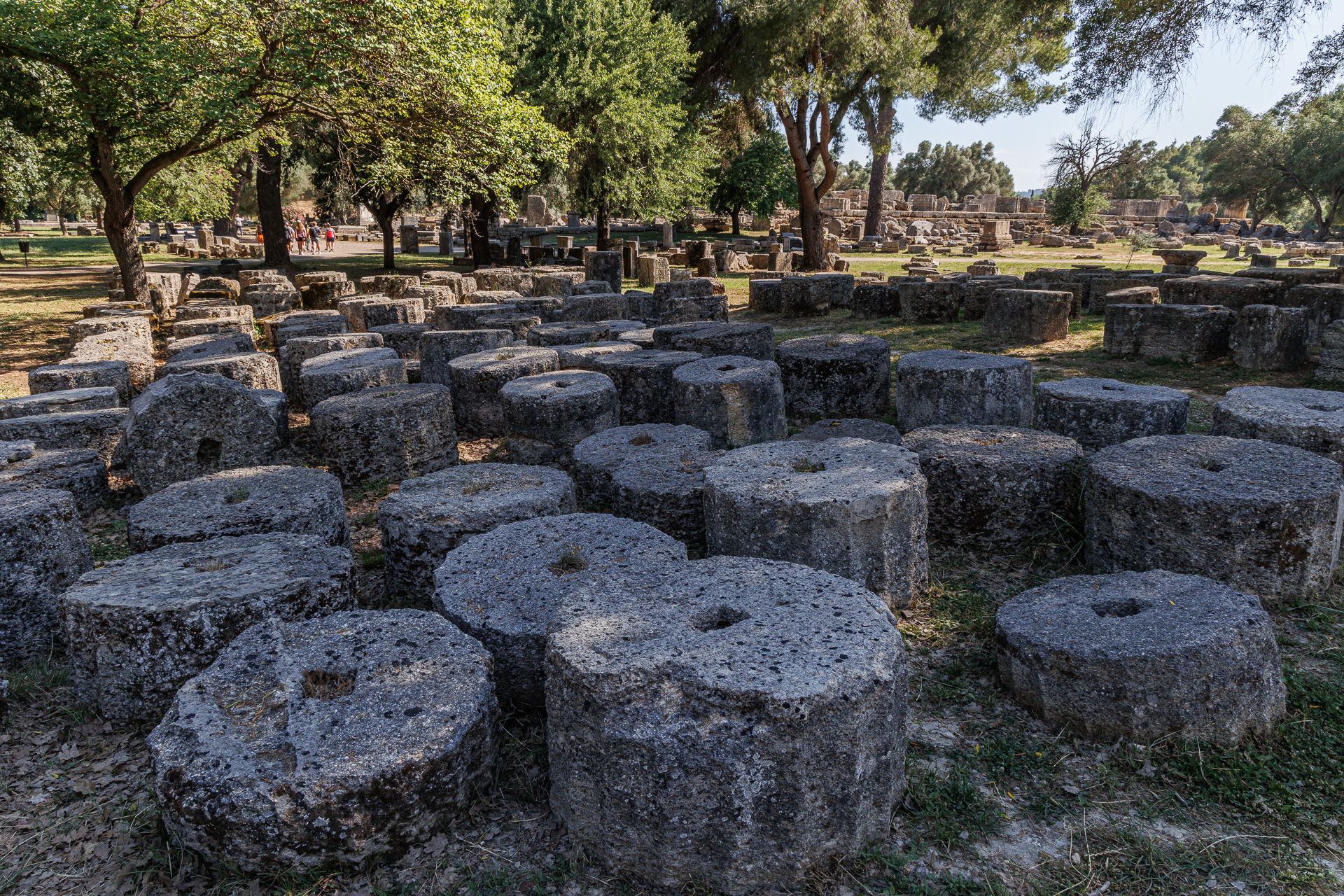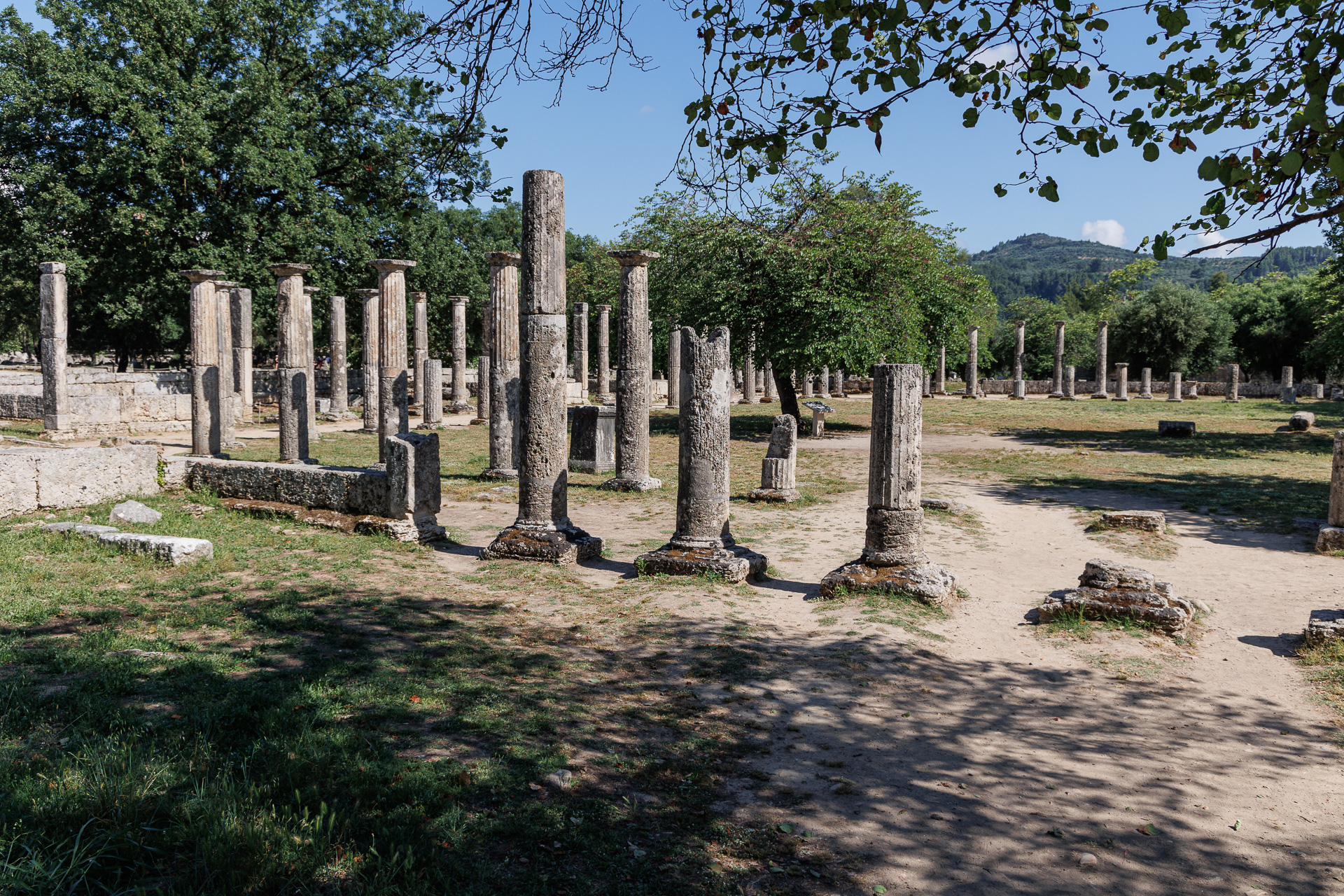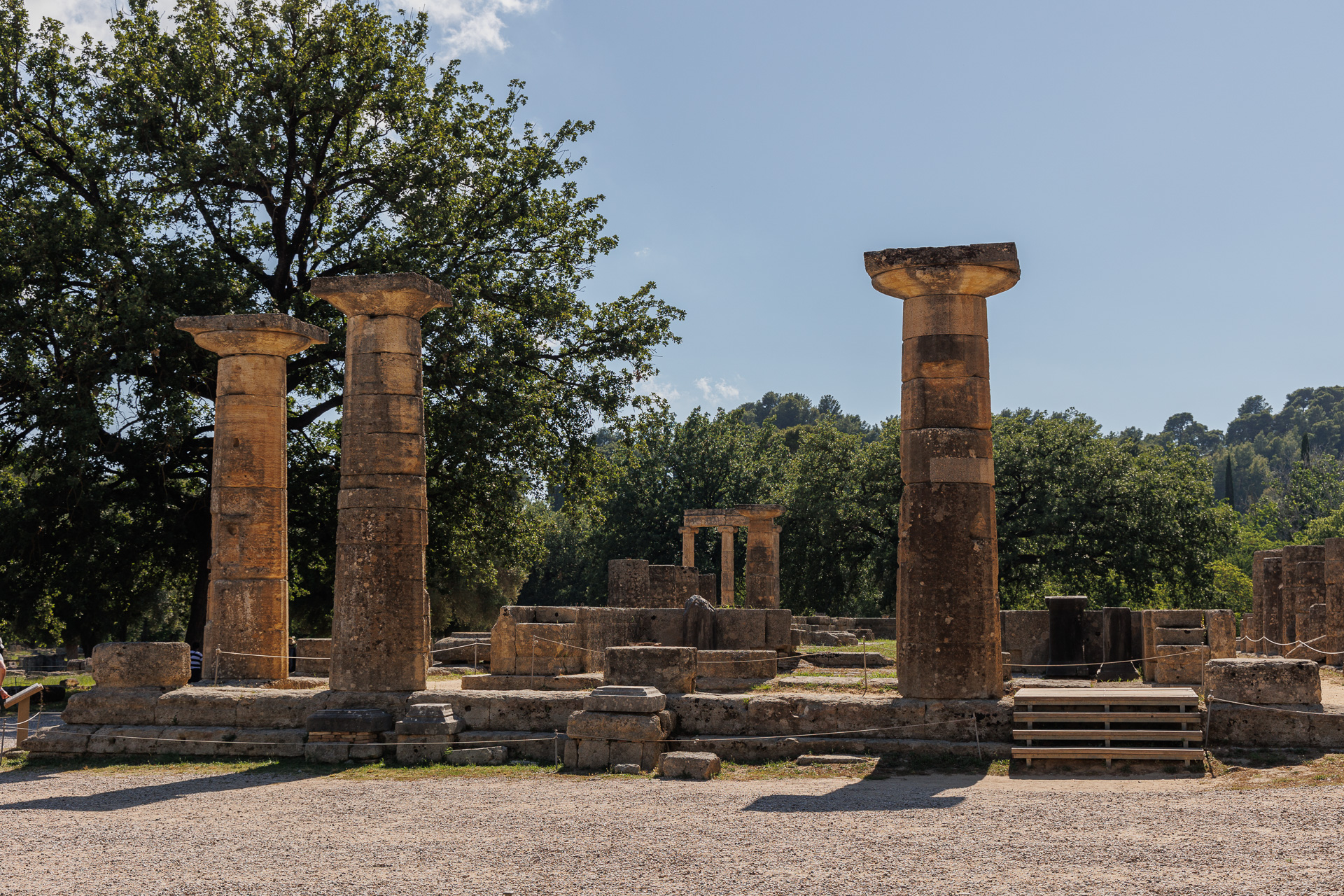 Colonnes assemblées et encore debout avec l’Héraion, le temple d’Héra, utilisé aussi à l’origine pour le culte de Zeus. Il est probablement le premier édifice dorique connu du Péloponnèse. Il date des environs de 600 avant JC.