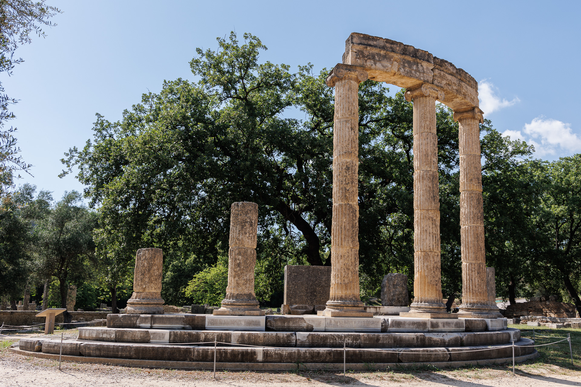 Le Philippéion fut érigé sur l’ordre de Philippe II de Macédoine après sa victoire à la Bataille de Chéronée (338 avant JC) Ce bâtiment rond abritait les statues chryséléphantines de Philippe, de son épouse Olympias, de son père Amyntas III, de sa mère Eurydice et de son fils Alexandre le grand. Un monument familial donc…