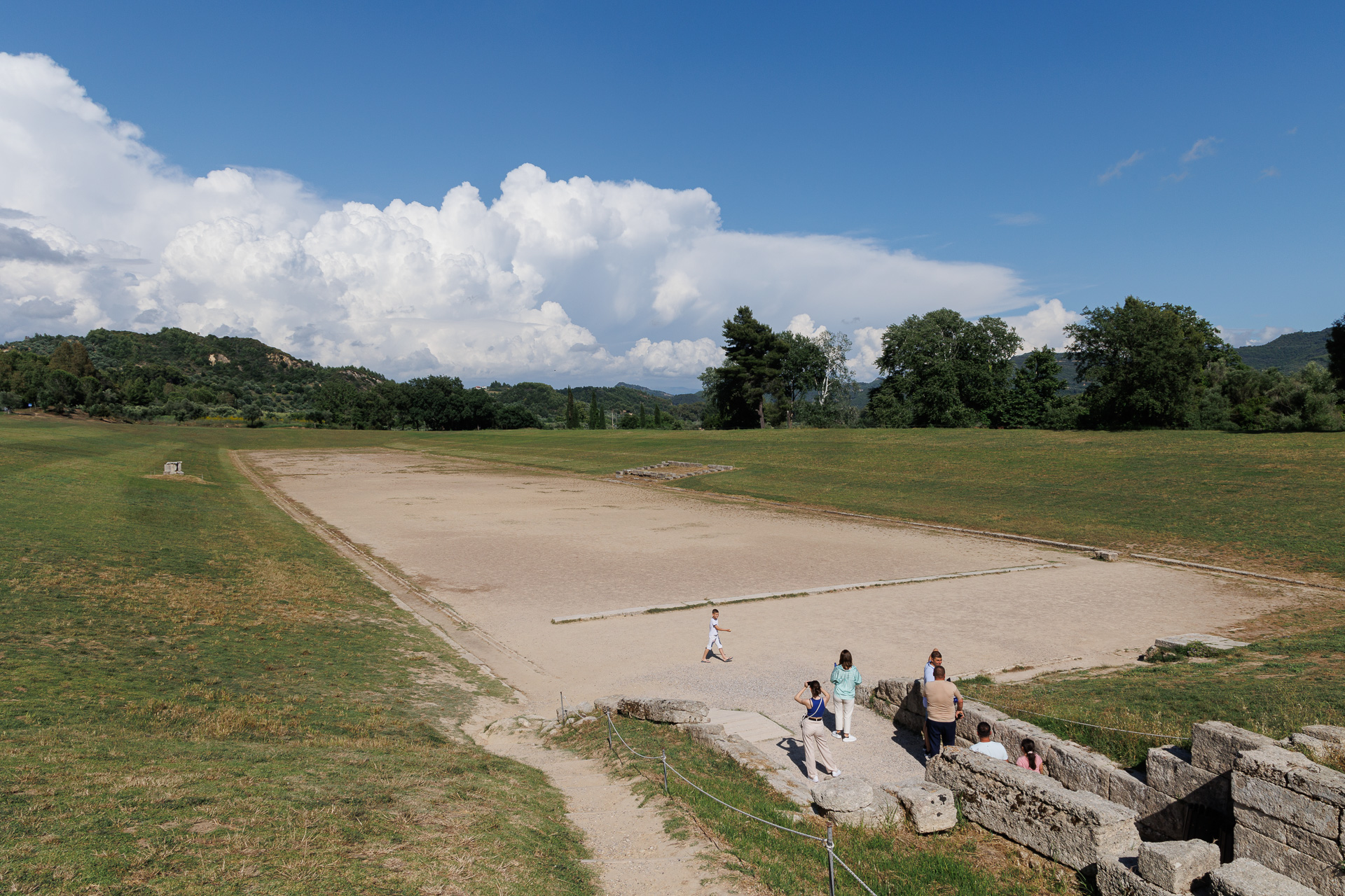 Le stade lui même, qui ne comportait pas de gradins en pierre en dehors de ceux destinés aux juges, mais des pentes herbeuses pour le public. Rectangulaire, il a une piste de course de 192 m. La pierre de départ, la ligne d’arrivée de la piste de vitesse et les sièges des juges existent encore. Ce stade pouvait contenir au moins 45 000 spectateurs mais esclaves et femmes devaient toutefois se contenter d’assister aux épreuves à l’extérieur depuis le mont Cronion. Le stade a de nouveau servi en 2004 pour le tournage d’un film projeté lors des Jeux olympiques d’Athènes.