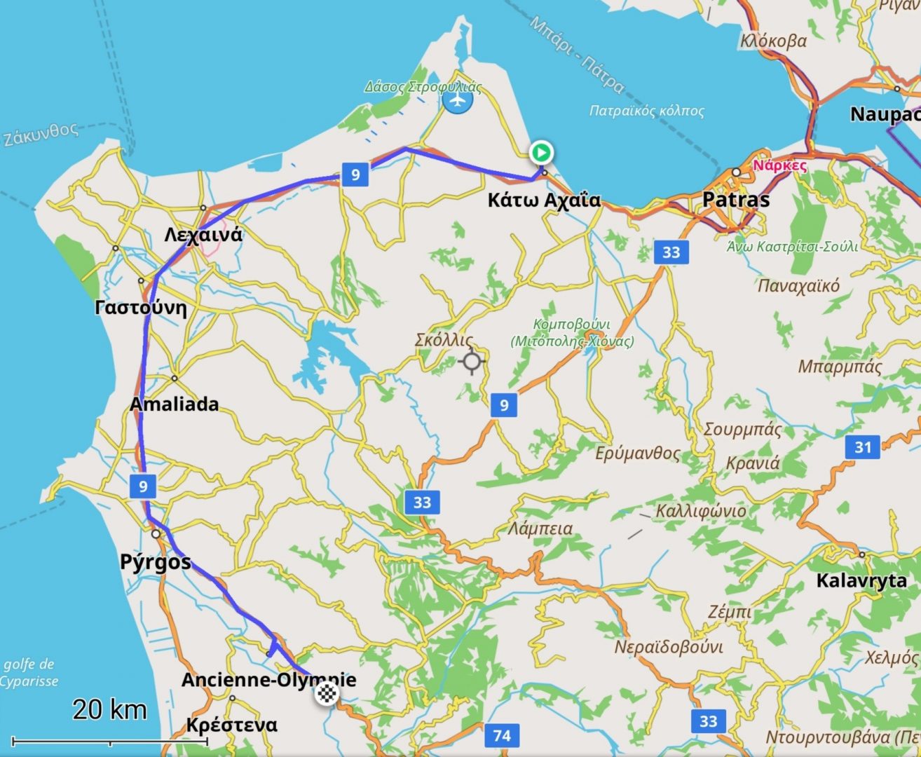 Notre parcours de ce jour (carte ci-dessous) va nous mener à Olympie, ville que nous ne pouvions louper bien sûr.