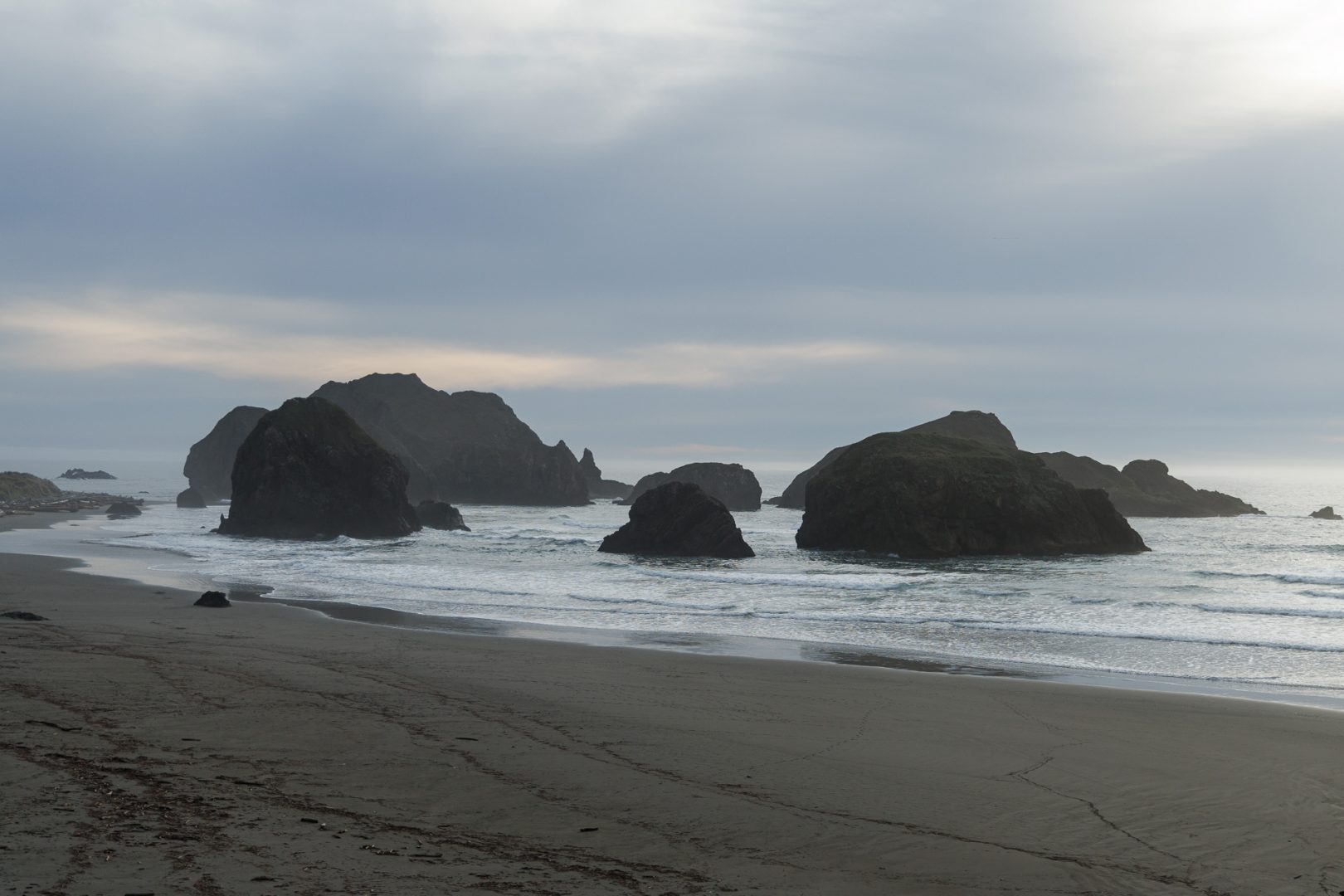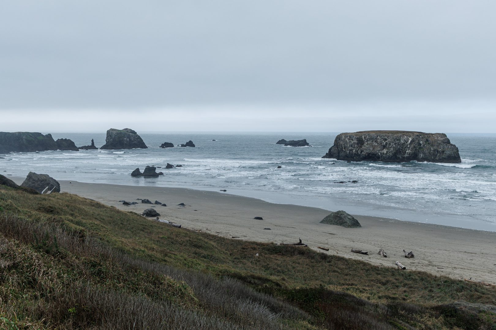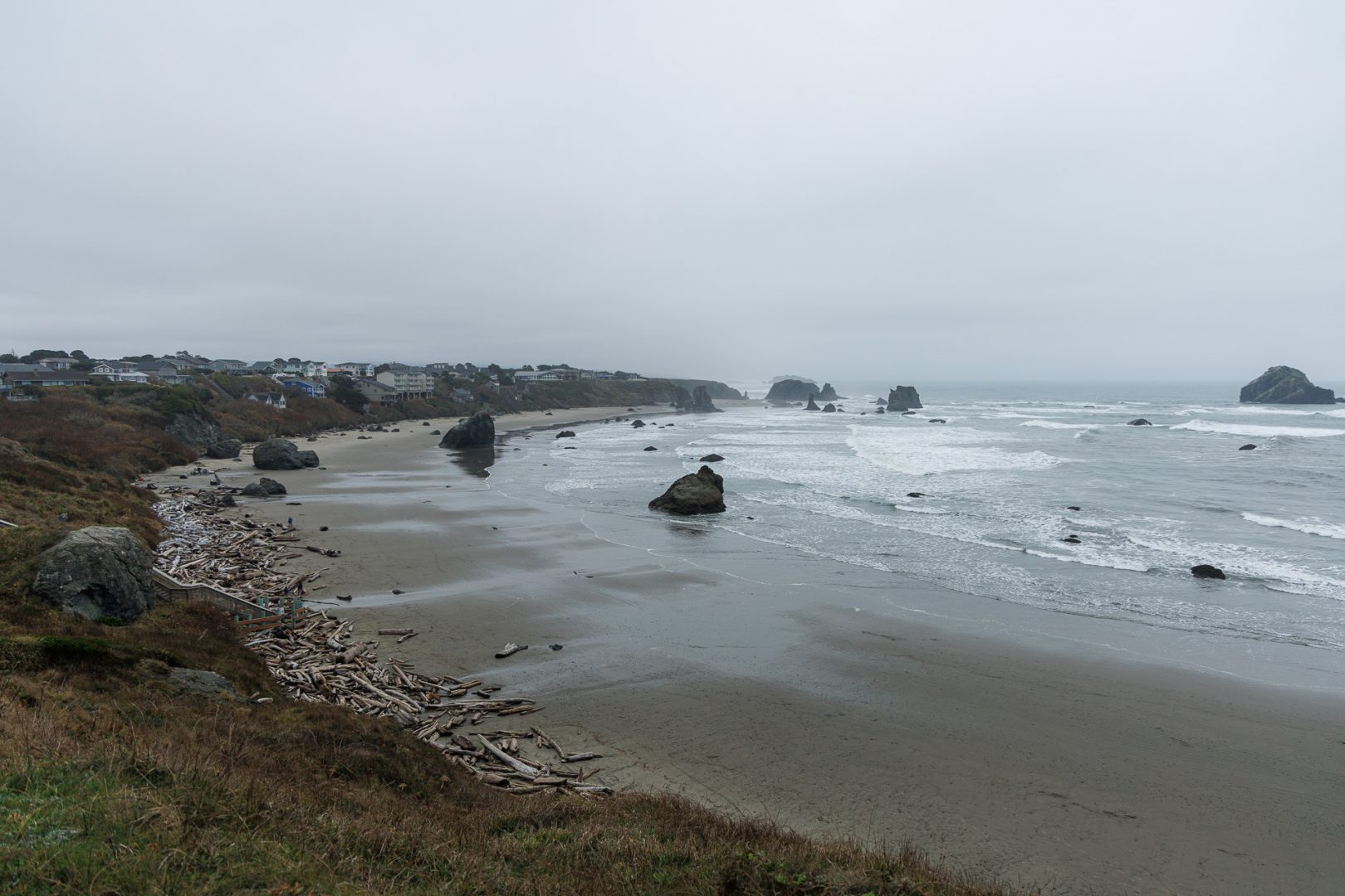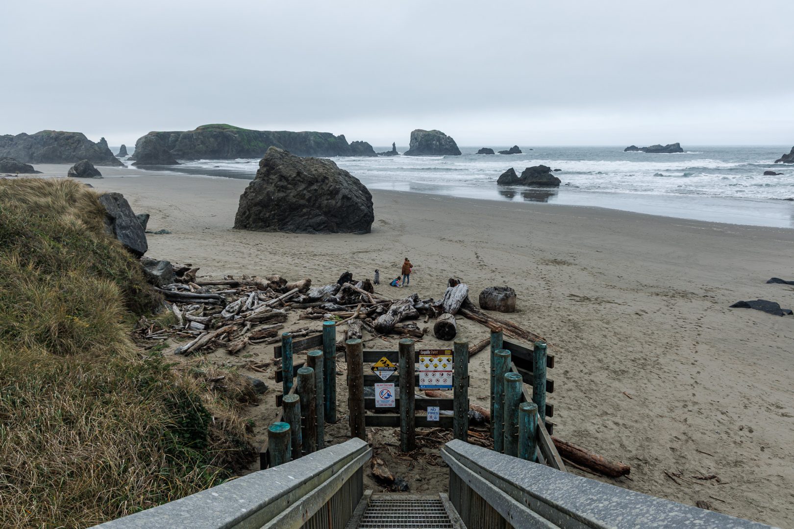218613 km : La nuit fut très calme dans notre petite rue et surtout… Nous n’avons pas été délogés 🙂. Avant de quitter Bandon, nous allons faire un tour sur la plage. Comme tous les matins, le temps est couvert à cause de la brume marine. La plage est réputée pour ses rochers.