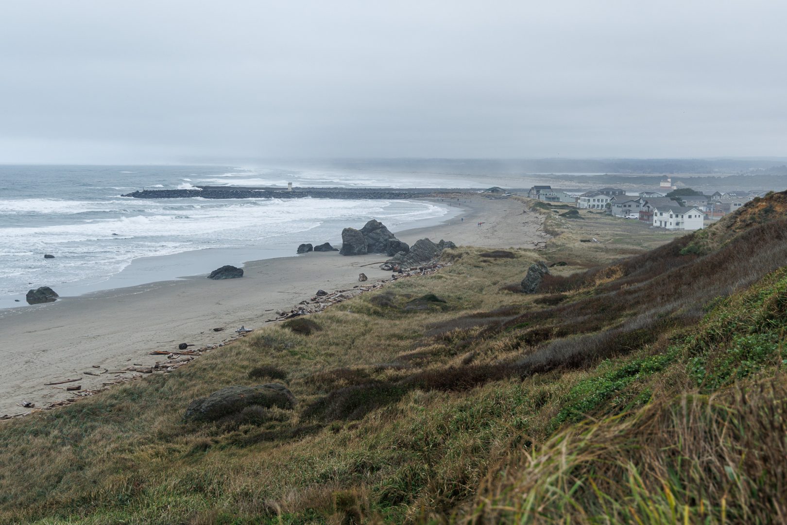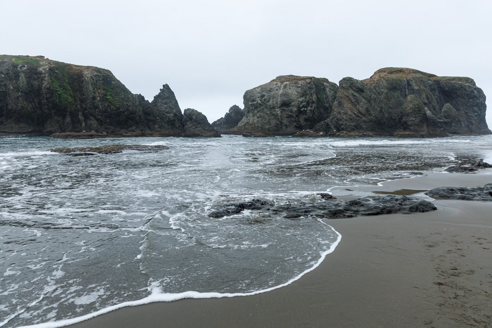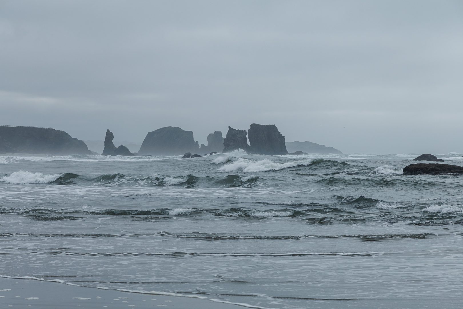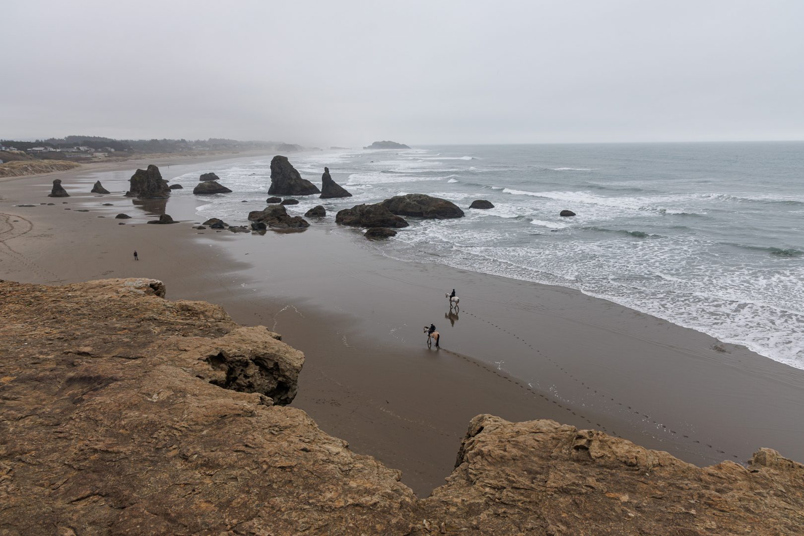 218613 km : La nuit fut très calme dans notre petite rue et surtout… Nous n’avons pas été délogés 🙂. Avant de quitter Bandon, nous allons faire un tour sur la plage. Comme tous les matins, le temps est couvert à cause de la brume marine. La plage est réputée pour ses rochers.