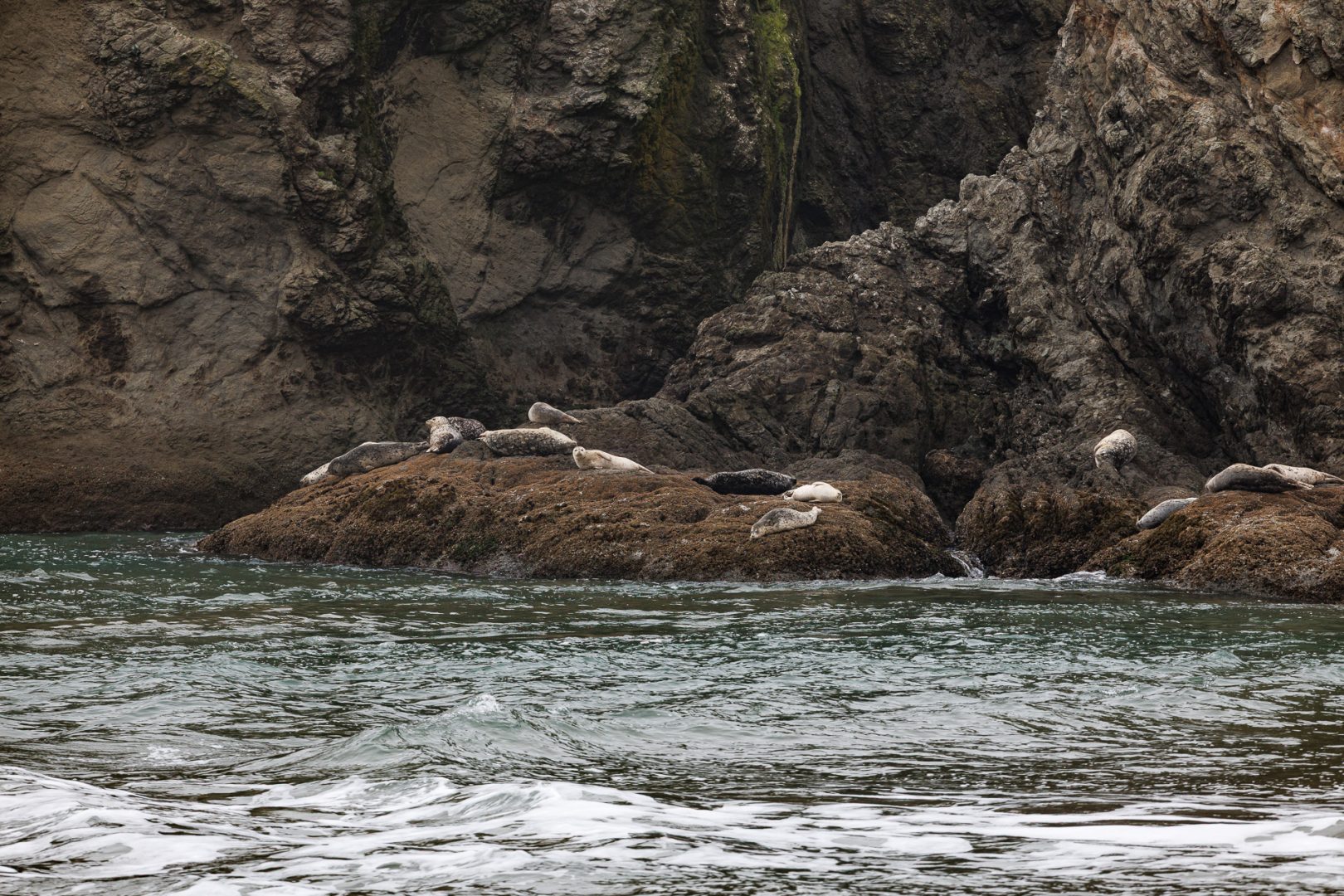 Au loin, une colonie de lions de mer se repose tranquillement sur les rochers.