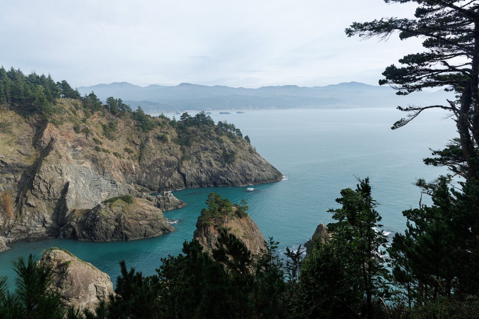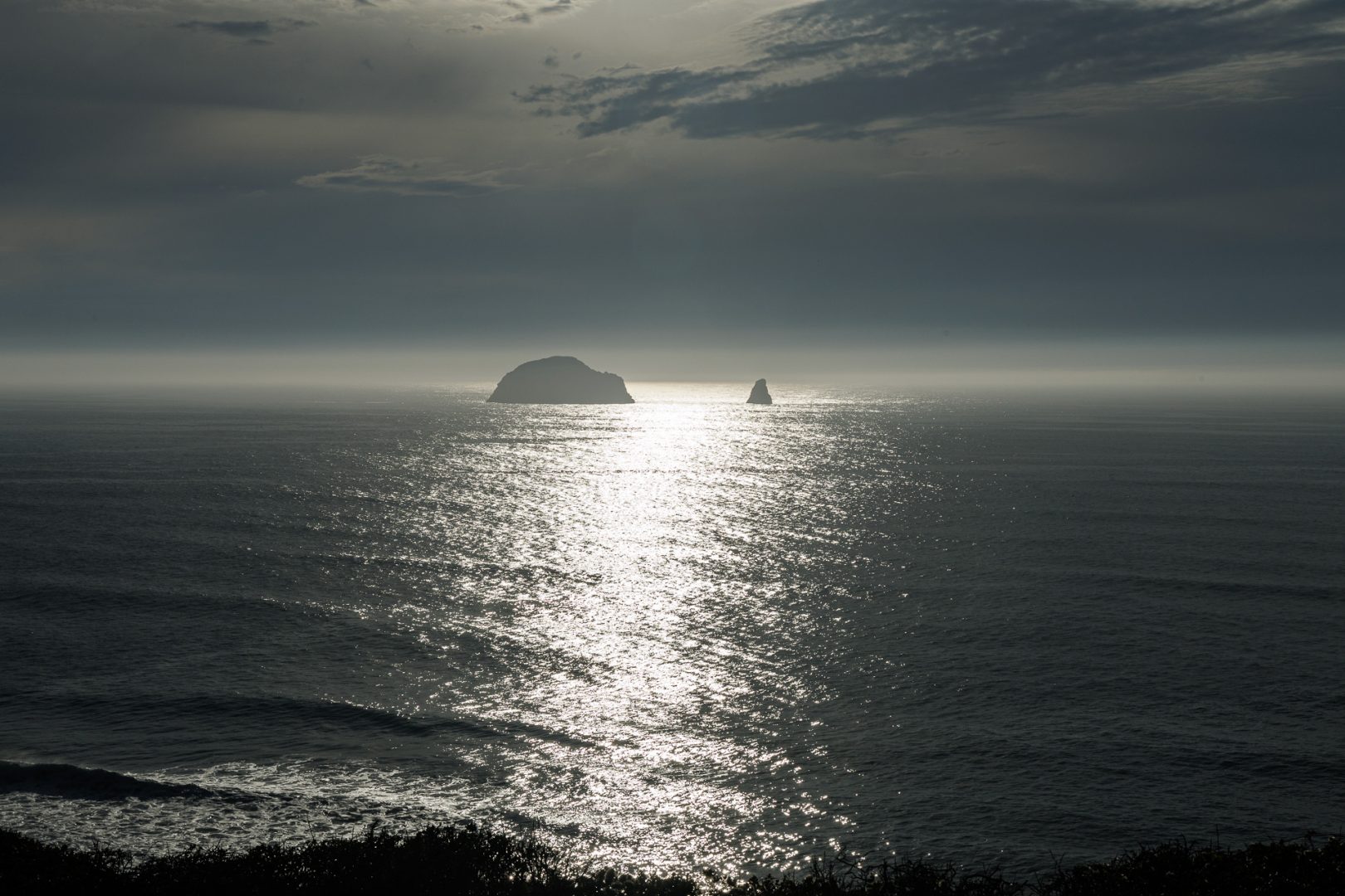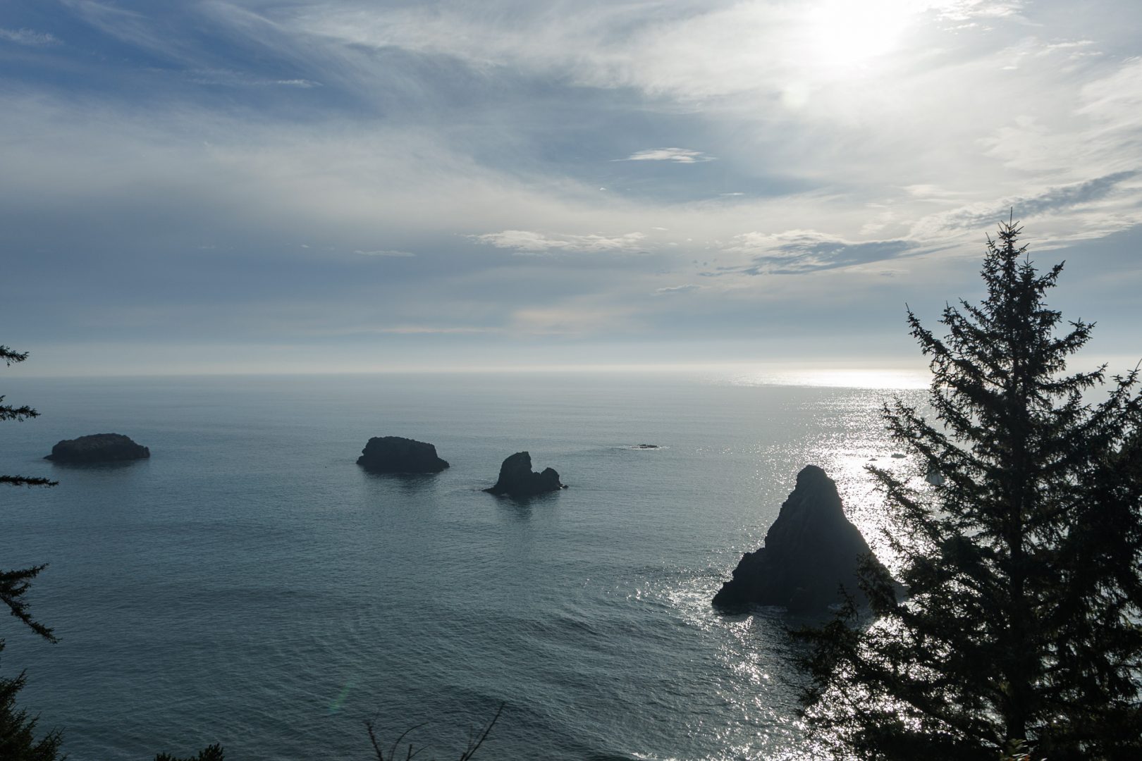 Nous poursuivons notre route en direction de Port Orford Heads State Park. La brume commence à se lever… Dans peu de temps. Le soleil sera là 🌞. Après avoir emprunté un petit sentier, nous voilà arrivés au point de vue. Aucune vague ici… Que c’est étrange 🧐 et surtout, nous pouvons admirer la belle couleur émeraude de l’océan 😎
