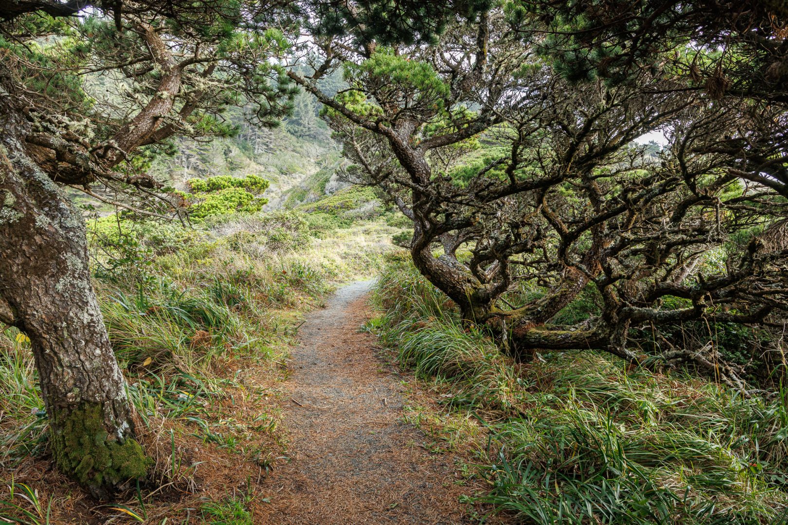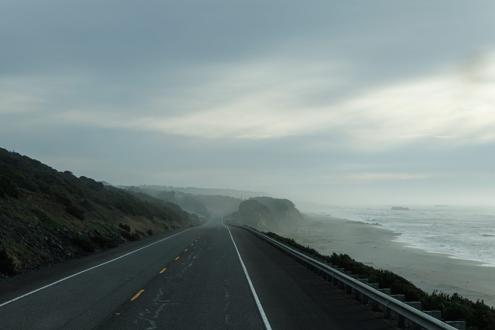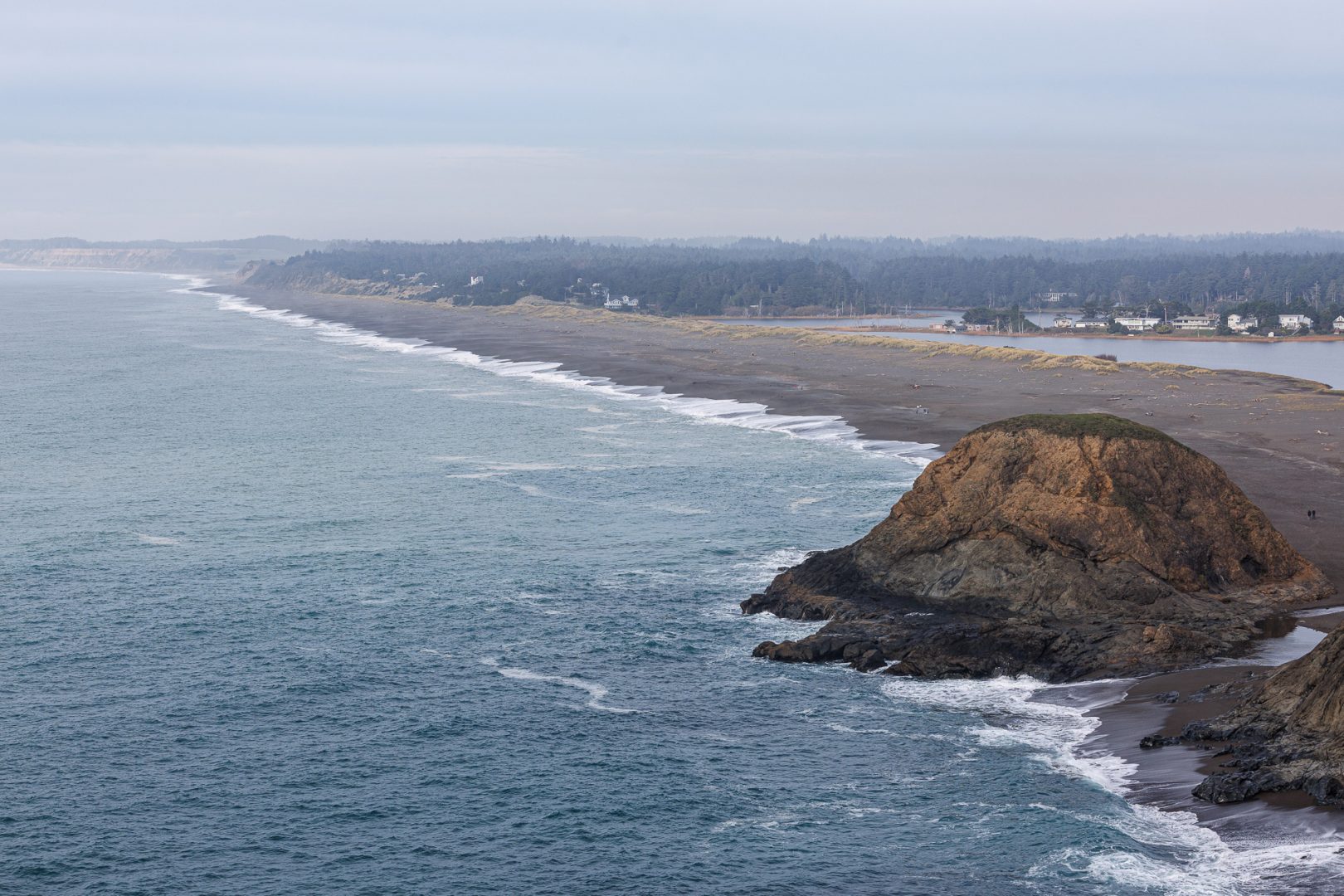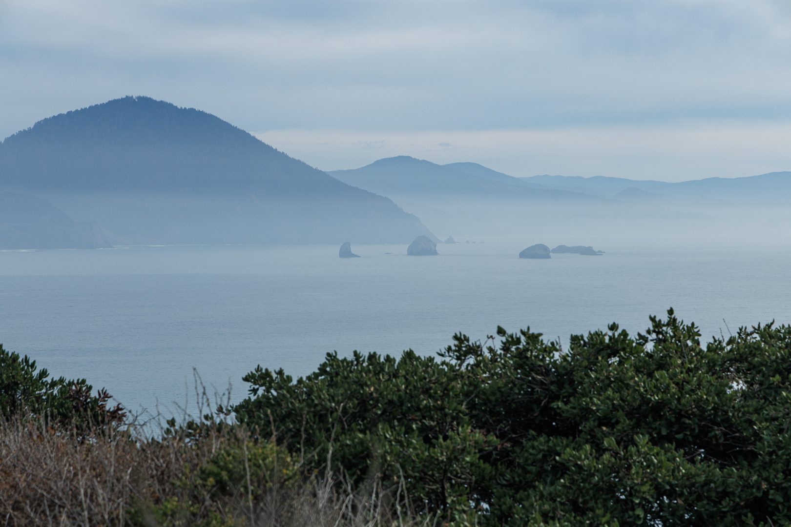 Nous poursuivons notre route en direction de Port Orford Heads State Park. La brume commence à se lever… Dans peu de temps. Le soleil sera là 🌞. Après avoir emprunté un petit sentier, nous voilà arrivés au point de vue. Aucune vague ici… Que c’est étrange 🧐 et surtout, nous pouvons admirer la belle couleur émeraude de l’océan 😎