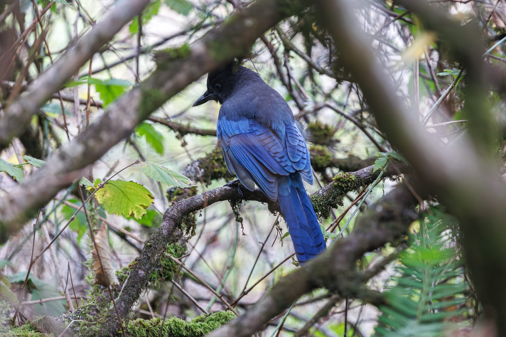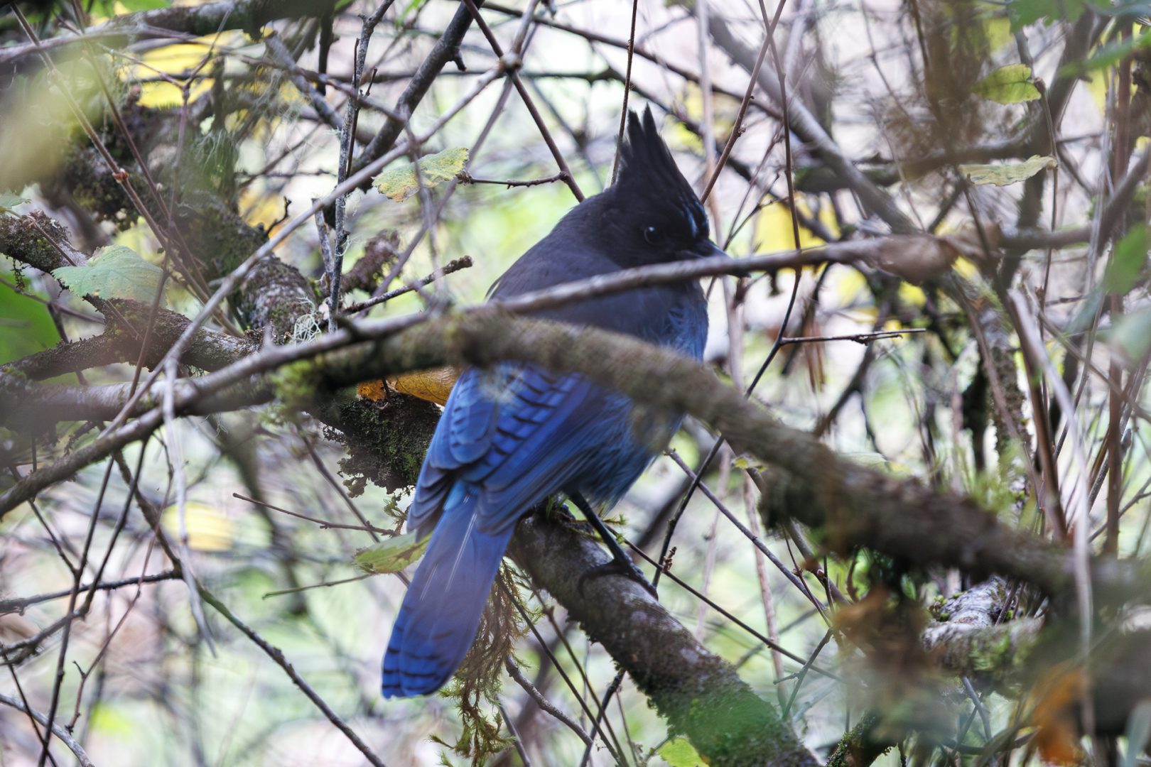 Bien caché derrière les branches, un geai de Steller. Il est beau avec sa petite crête. C’est l’une des 2 espèces de geais bleus d’Amérique du Nord. Le geai de Steller et le geai bleu sont les seuls geais à posséder une crête. Il est mignon, non ? Cela valait la peine de faire ces petits exercices musculaires pour trouver un angle de vue un peu dégagé 🤣.