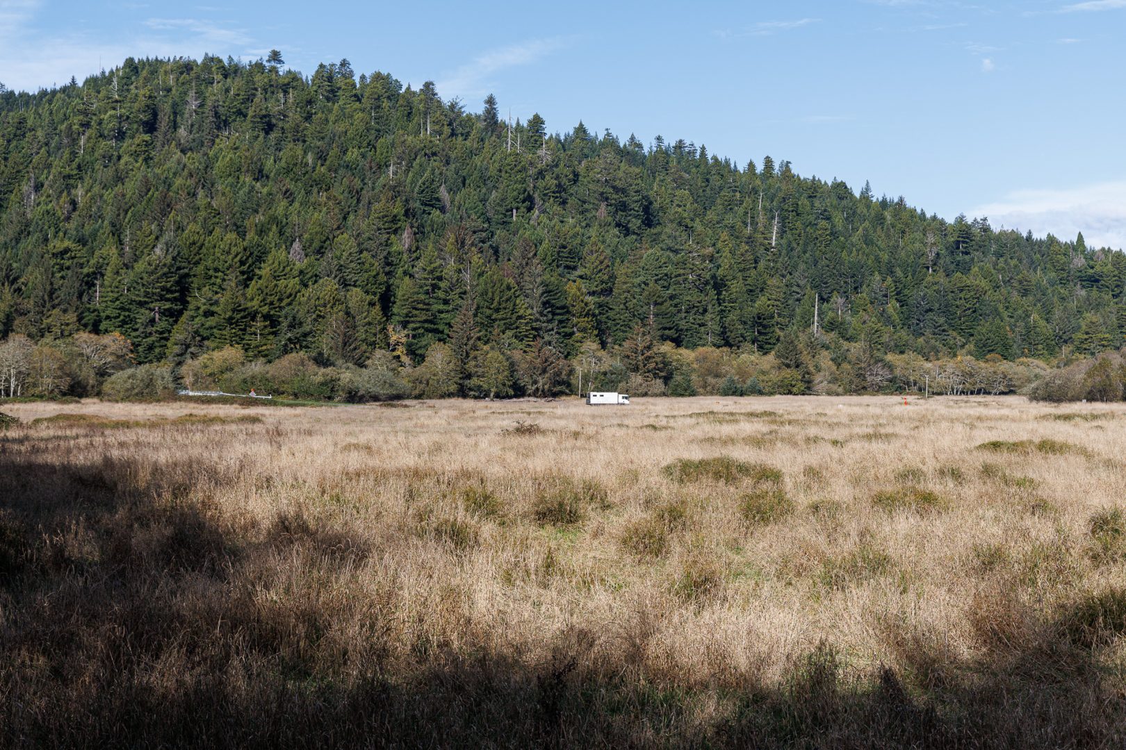 Nous irons nous poser sur un parking en bord de route près du Trillium falls trail (le parking du trail est interdit la nuit 😭) et juste à côté de l’Elk Meadow (la prairie des wapitis) dans le parc national de Redwood. Nous avons guetté jusqu’à la nuit tombée les wapitis mais aucun n’est venu se promener près du camion… dommage. Peut-être demain matin 🤔 ? Un petit programme de randonnée nous attend au milieu des redwoods (séquoias) plus que centenaires !