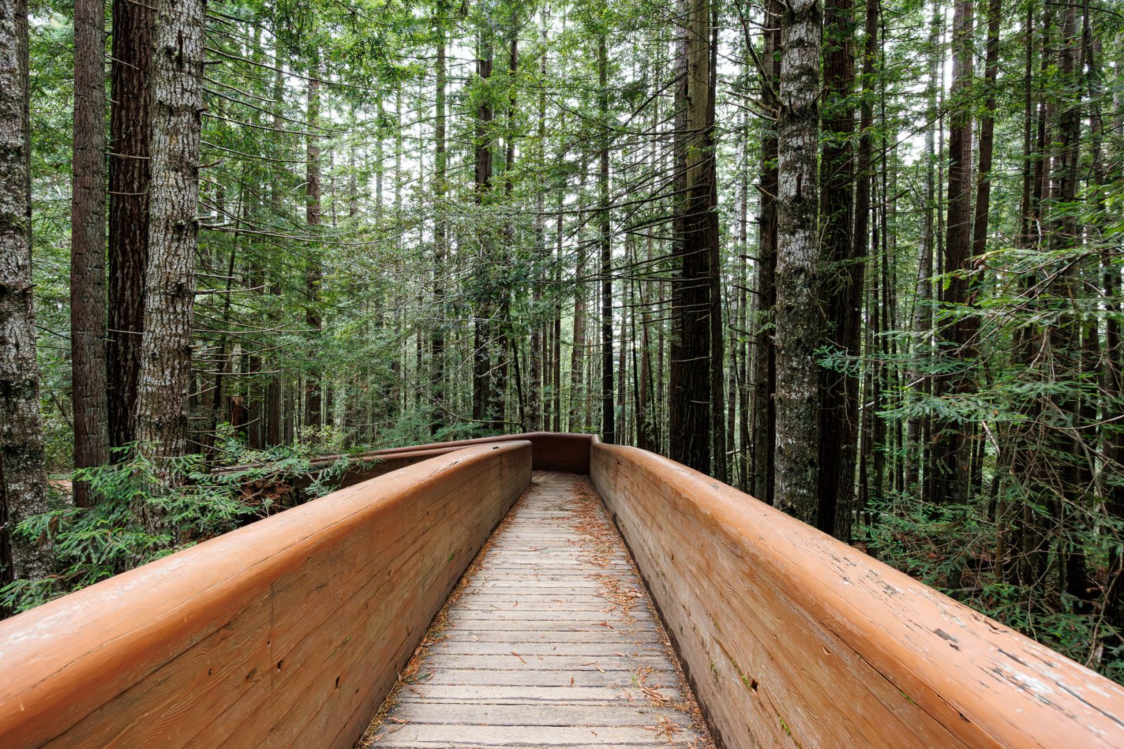 La passerelle qui nous ramène au parking se faufile au milieu de ces géants de la forêt.