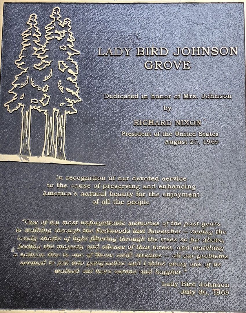 Nous partons ensuite faire le Lady Bird Johnson Grove Trail. Ce sentier porte le nom de Claudia Alta « Lady Bird » Johnson (1912- 2007) qui fut l’épouse de Lyndon B. Johnson, 36ème Président des États-Unis de 1963 à 1969. En août 1969, le président Richard Nixon a inauguré ce sentier en l’honneur de Lady Bird Johnson et en sa présence.
