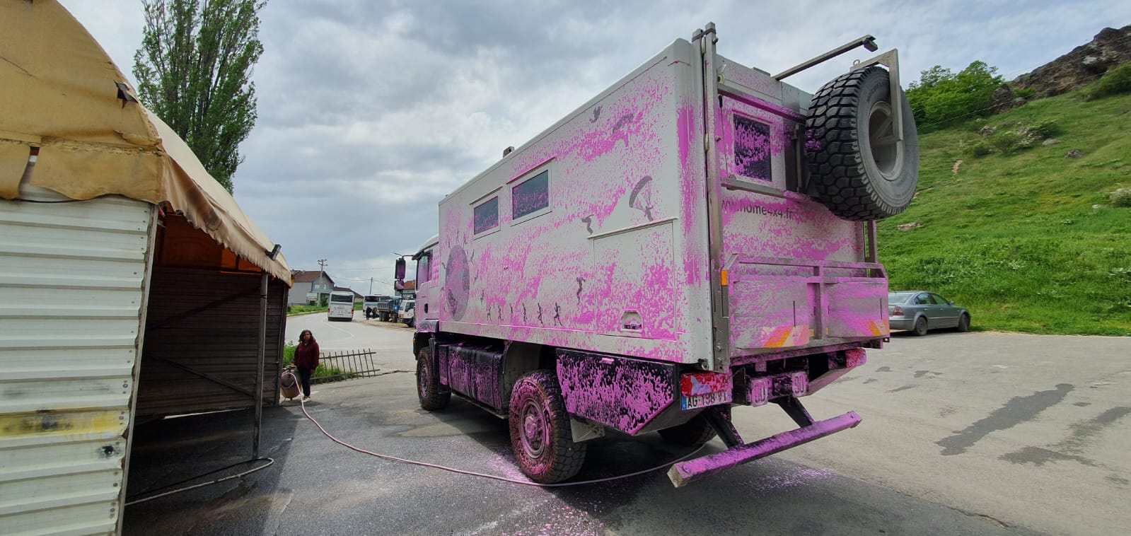 Avant de partir en direction de Rahovec (la capitale viticole du Kosovo), nous ferons faire un petit toilettage au camion auprès d’un laveur de voiture. Je vous rassure cette belle couleur rose ne restera pas 😜 ! Nous reprendrons la route avec un camion tout propre et tout ça pour la modique somme de 10 €. Malheureusement, le bonheur de rouler dans un camion tout propre sera de courte durée… quelques kilomètres plus loin, nous avons essuyé un bel orage 🤪 !