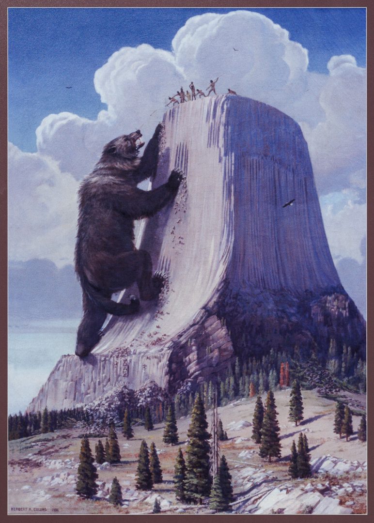 Elle est considérée comme sacrée par les Indiens des Plaines du Nord et les peuples autochtones. Une légende indienne raconte que sept jeunes sioux jouaient dans la forêt, lorsqu’elles furent prises en chasse par un ours. Poursuivies, « les filles grimpèrent sur un rocher et prièrent le Grand Esprit de les aider. Immédiatement le rocher se mit à grandir. Pour tenter d’atteindre ses proies, l’ours affamé sauta sur le rocher qui s’élevait vers le ciel, mais glissa et laissa la marque de ses griffes sur le rocher (sous la forme des prismes verticaux qui strient Devils Tower). Le rocher continua à croître, poussant les filles vers le ciel, où elles furent transformées en sept étoiles: les Pléiades ». Les prismes des orgues phonolithiques de ce monolithe ont inspirer le géomythe des marques des griffes d’un ours. La légende est belle 🤩 !