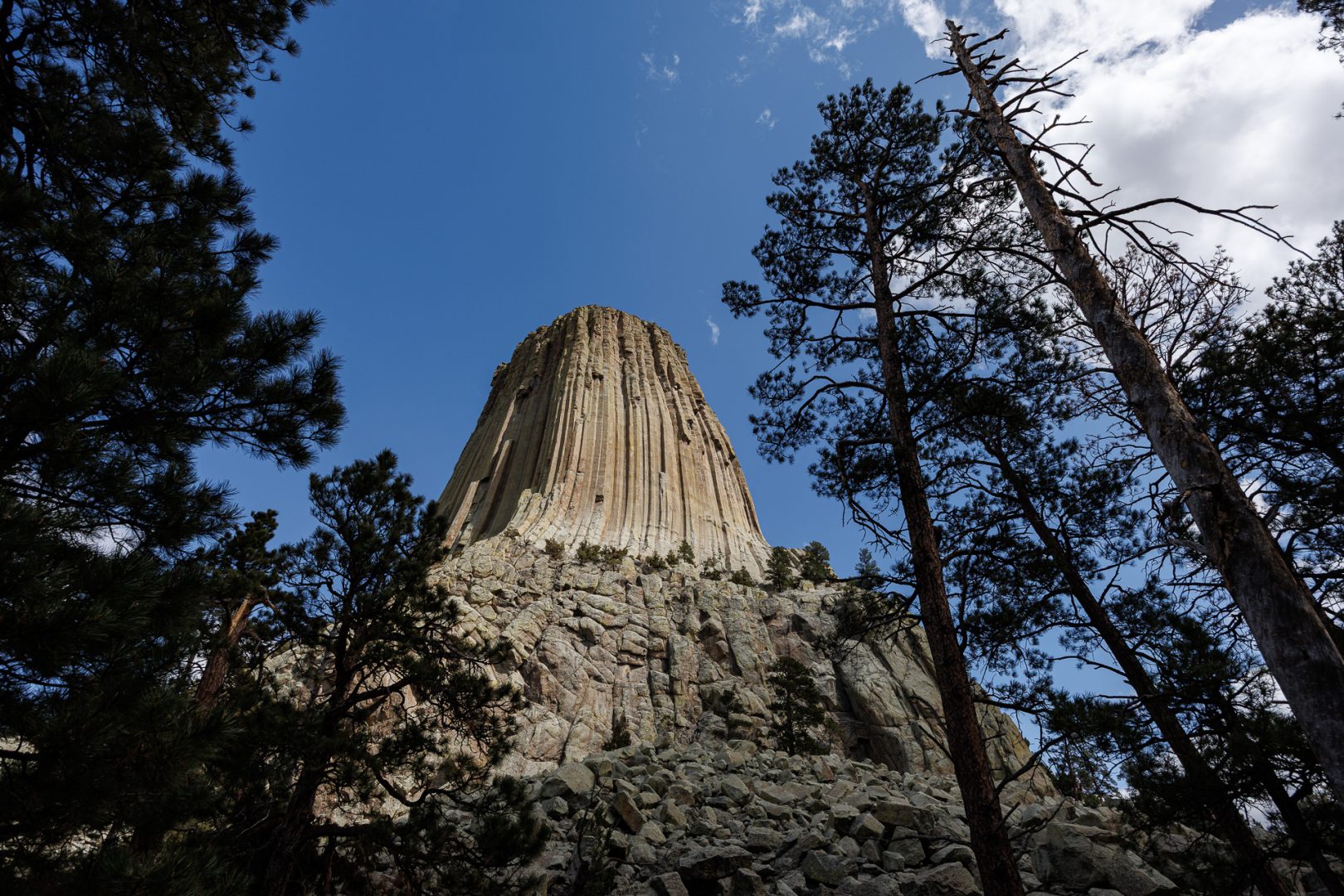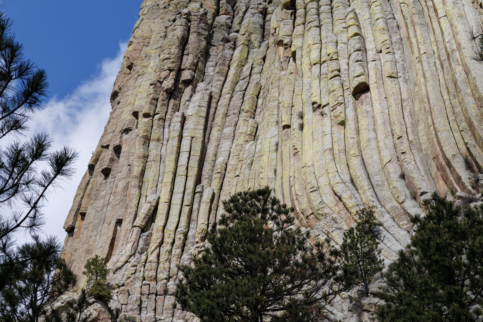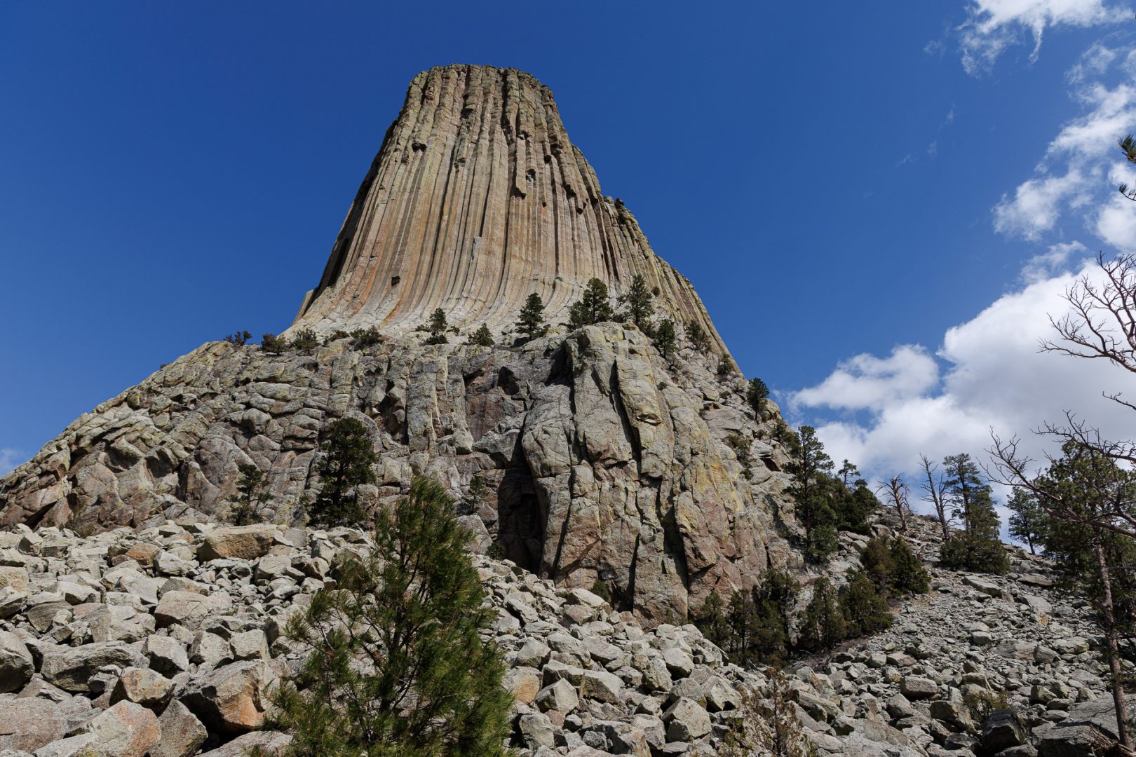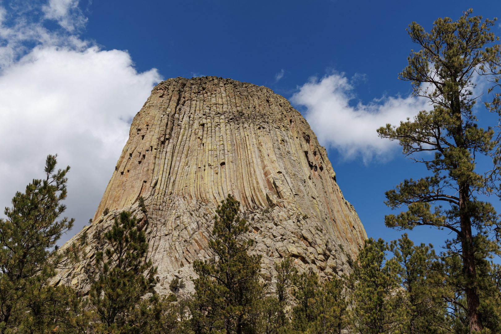 200002 km : Nous quittons notre bivouac et nous nous dirigeons vers Devil’s Tower National Monument. Devil’s Tower (la Tour du Diable) est une formation géologique étonnante qui surgit de la prairie entourant les Black Hills. C’est un monolithe naturel dont le sommet est à 1558 m. La hauteur du surplomb volcanique est de 386 m au-dessus des terres environnantes.
