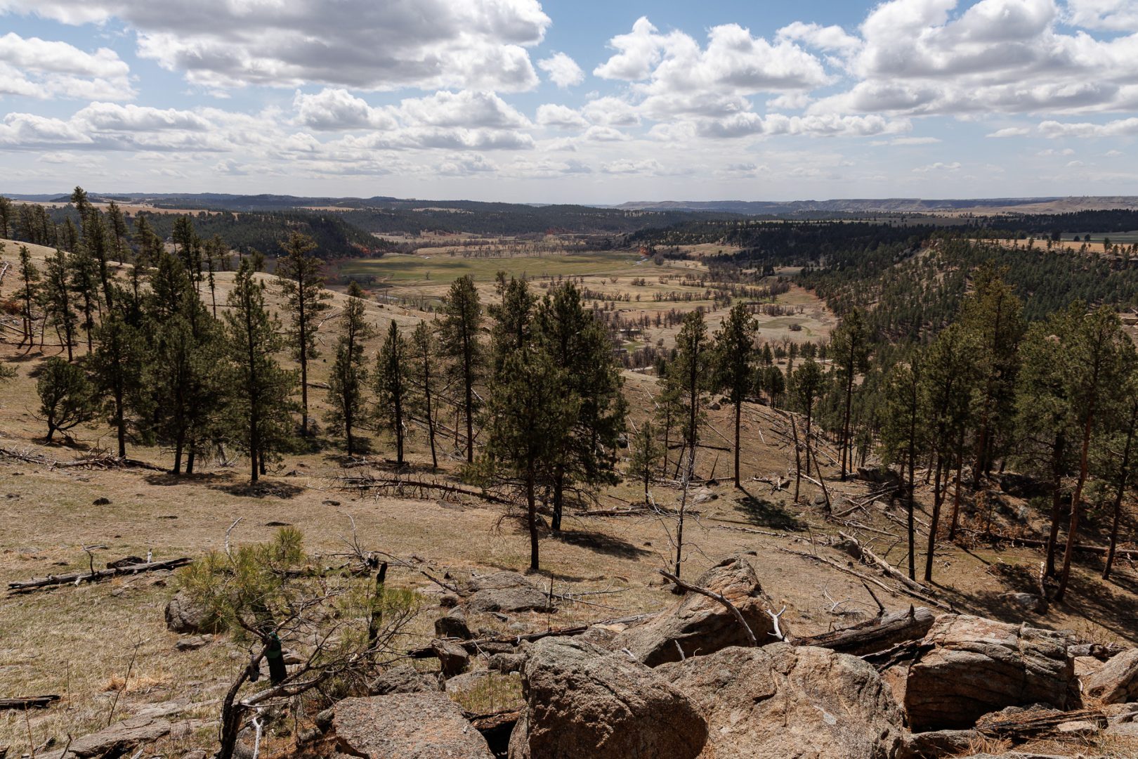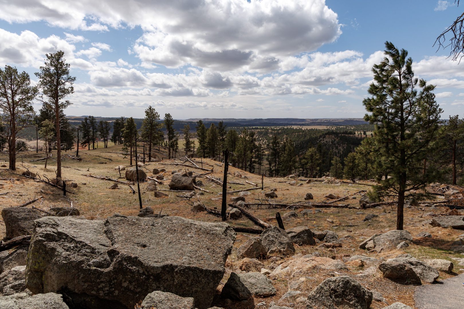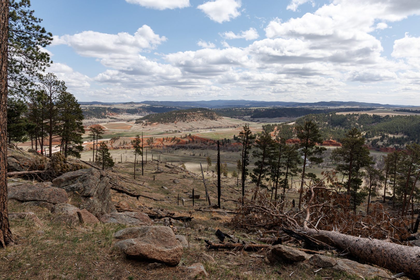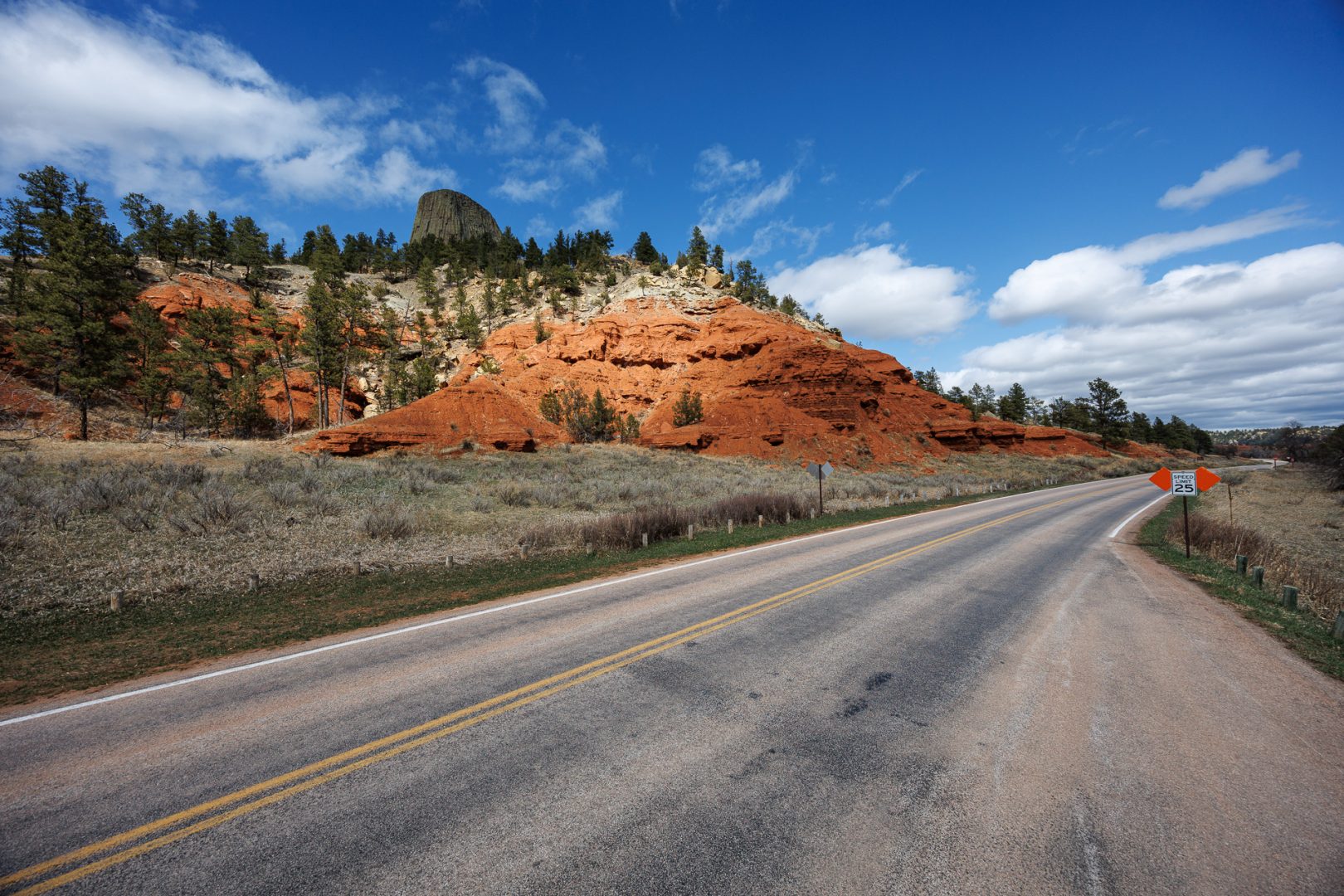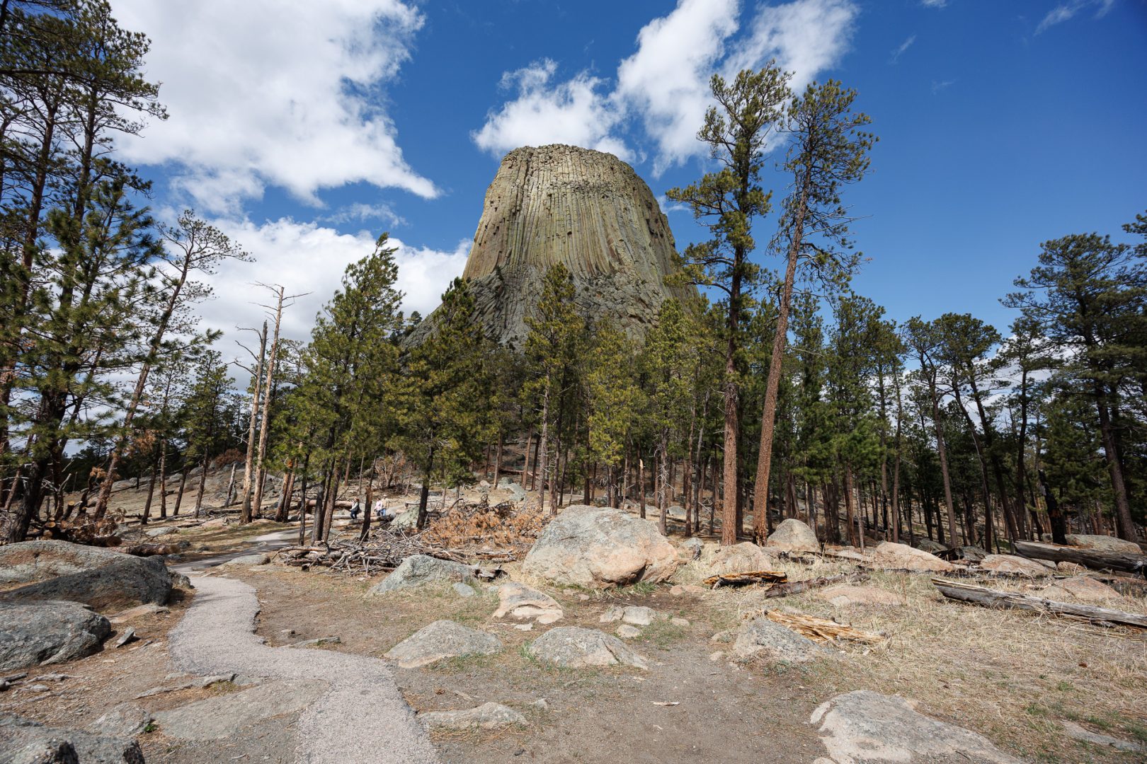 200002 km : Nous quittons notre bivouac et nous nous dirigeons vers Devil’s Tower National Monument. Devil’s Tower (la Tour du Diable) est une formation géologique étonnante qui surgit de la prairie entourant les Black Hills. C’est un monolithe naturel dont le sommet est à 1558 m. La hauteur du surplomb volcanique est de 386 m au-dessus des terres environnantes.