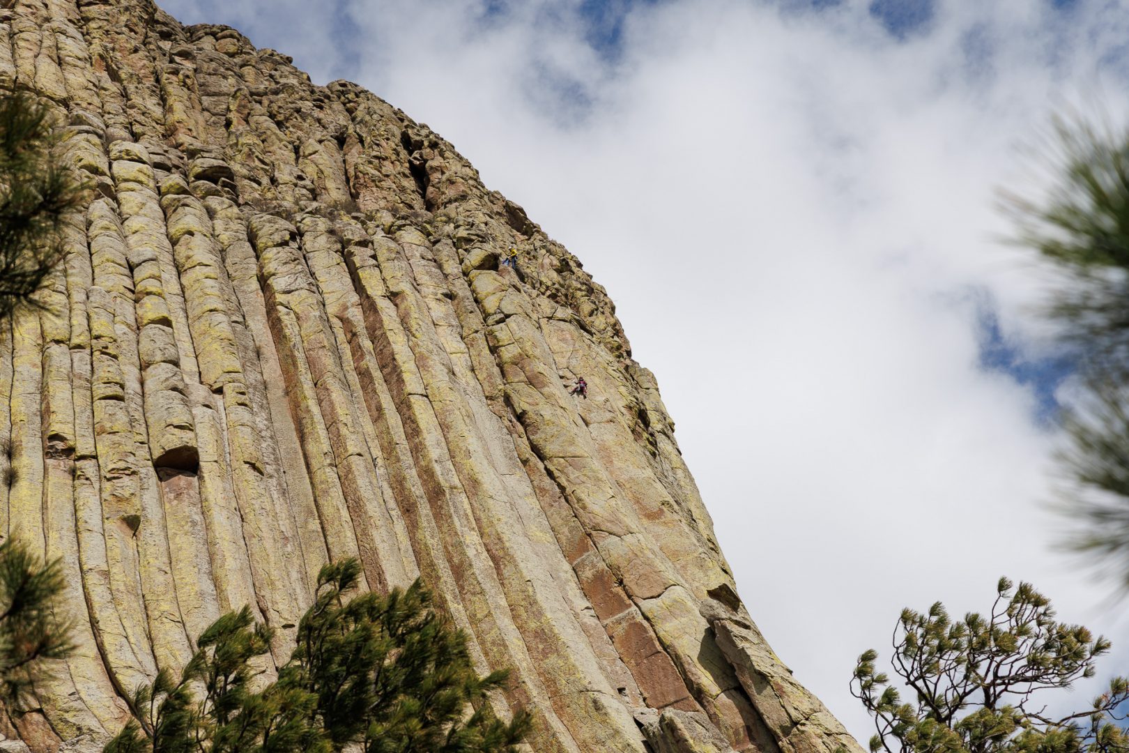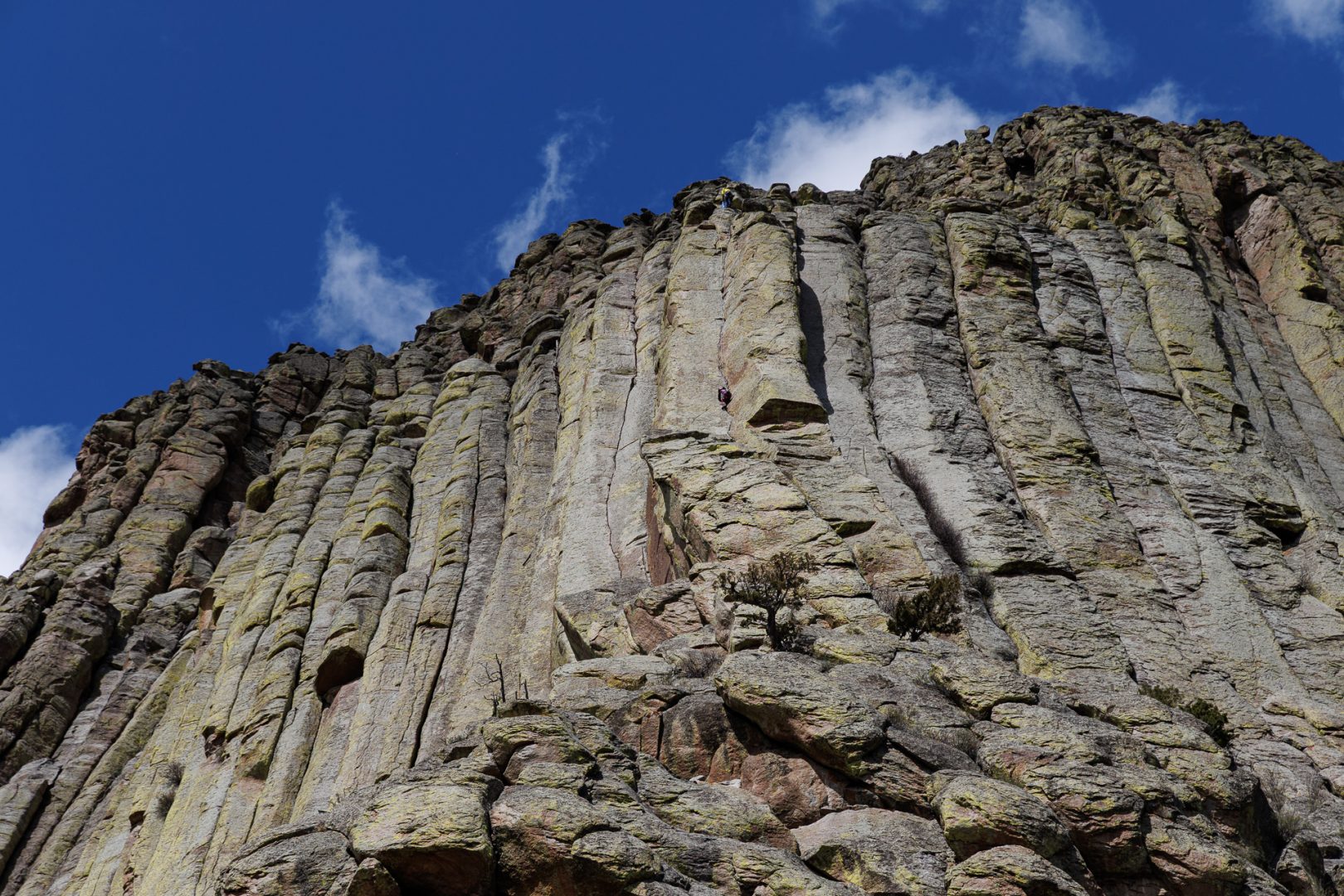 La première ascension « technique », c’est-à-dire en ayant recours à un grand nombre de pitons, fut réussie en 1937 par Fritz Wiessner, William P. House et Lawrence Coveney. Aujourd’hui, des centaines de grimpeurs escaladent la paroi chaque été. Chaque colonne hexagonale définit une voie particulière, dont la difficulté varie de «facile» à «extrêmement difficile». Tous les grimpeurs doivent se signaler aux rangers avant et après leur ascension. Sur la photo ci-dessous à droite, on voit le grimpeur en pleine ascension. Son coéquipier est légèrement plus haut. Le jour de notre visite, il y avait beaucoup de vent avec de fortes rafales. L’avantage de ces fissures est qu’elles vous protègent du vent lors de l’ascension si vous vous orientez bien, et les grimpeurs ne semblaient pas être gênés. Par contre l’arrivée au sommet a dû être sportive 🥴 ! Et si vous regardez bien, dans la sixième fissure à gauche des grimpeurs, on aperçoit, coincés dans la fissure, les restes des échelles en bois utilisées en 1893 par un éleveur local à des fins commerciales