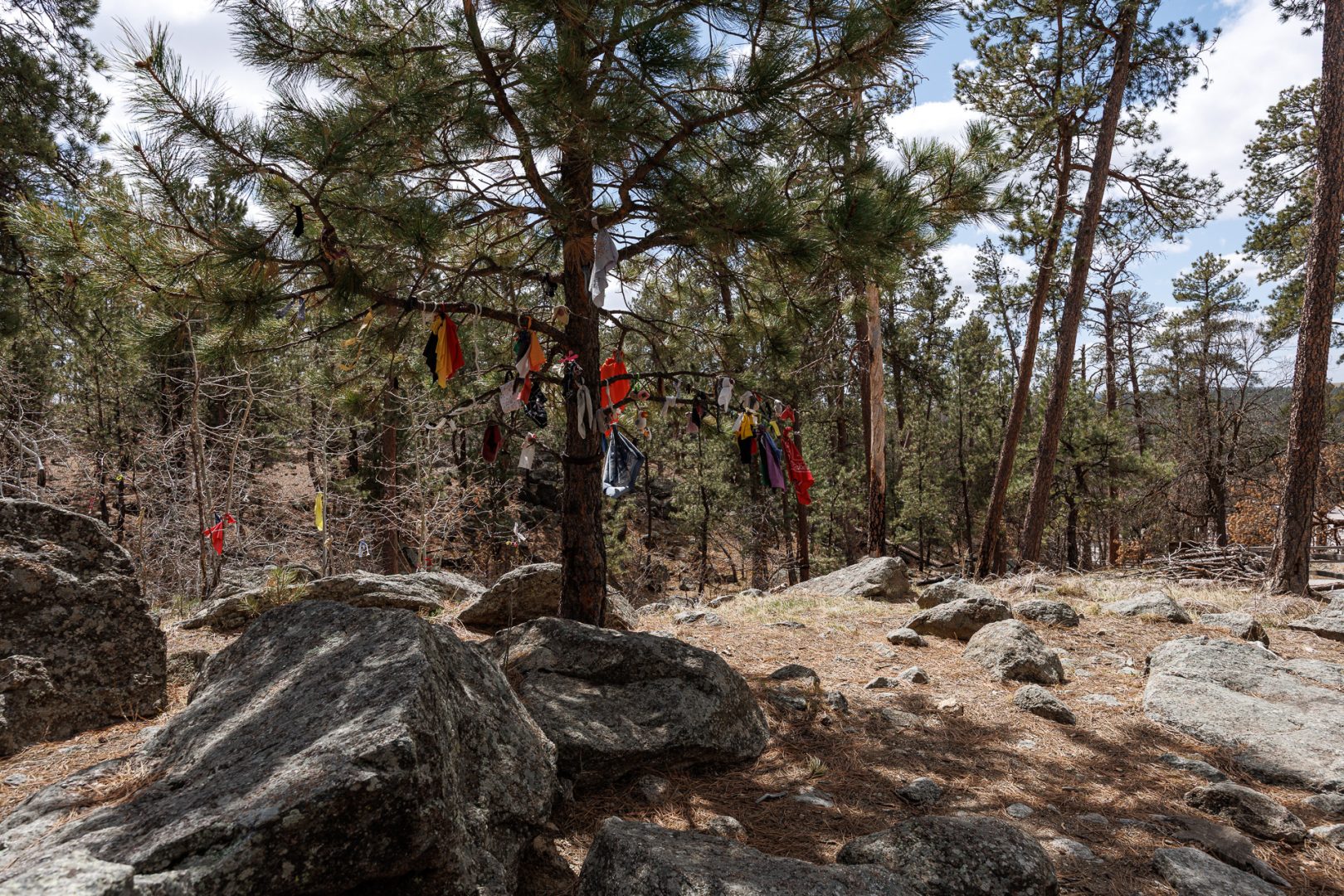 Cet endroit est resté sacré pour certaines tribus d’où ces arbres décorés de tissus. Pendant le mois de juin, elles y procèdent à des cérémonies. Il est alors demandé aux visiteurs de ne pas escalader le rocher, ce qui serait considéré comme une profanation par les Amérindiens. Cela nous rappelle les ovoos de Mongolie. Les ovoos sont des lieux de cérémonies où les fidèles placent une branche d’arbre ou un bâton et y attachent un foulard de soie cérémoniel symbolisant le ciel ouvert et l’esprit céleste.