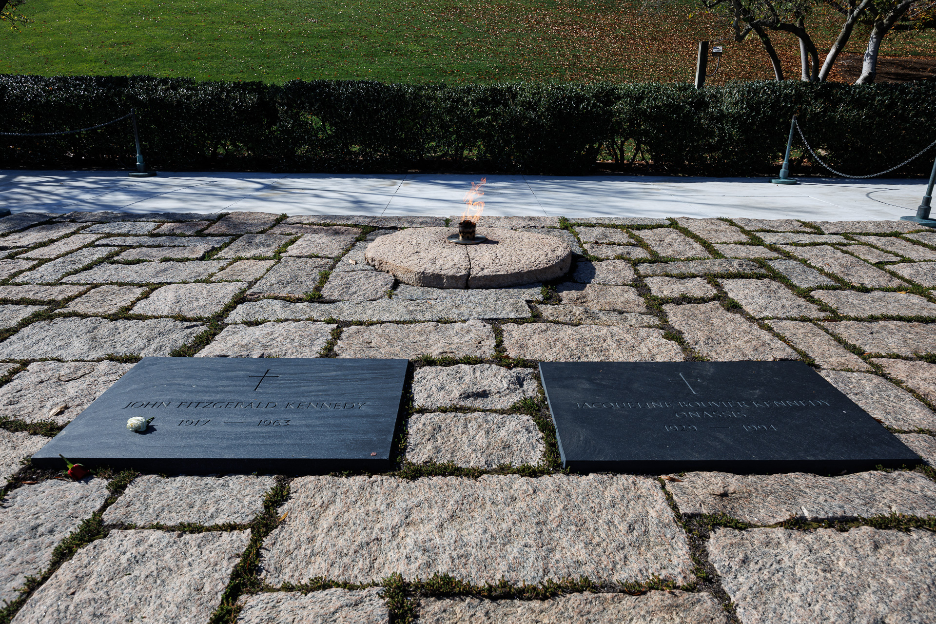 et John Fitzgerald Kennedy, 35ème Président des États-Unis de 1961 à 1963. Jacky Kennedy repose à ses côtés ainsi que 2 de leurs enfants morts en bas âge. Concernant les deux autres enfants du couple, les cendres de John Kennedy Jr, décédé lors d’un accident d’avion, ont été dispersées dans la mer, et Caroline Kennedy est actuellement ambassadrice des États-Unis en Australie.