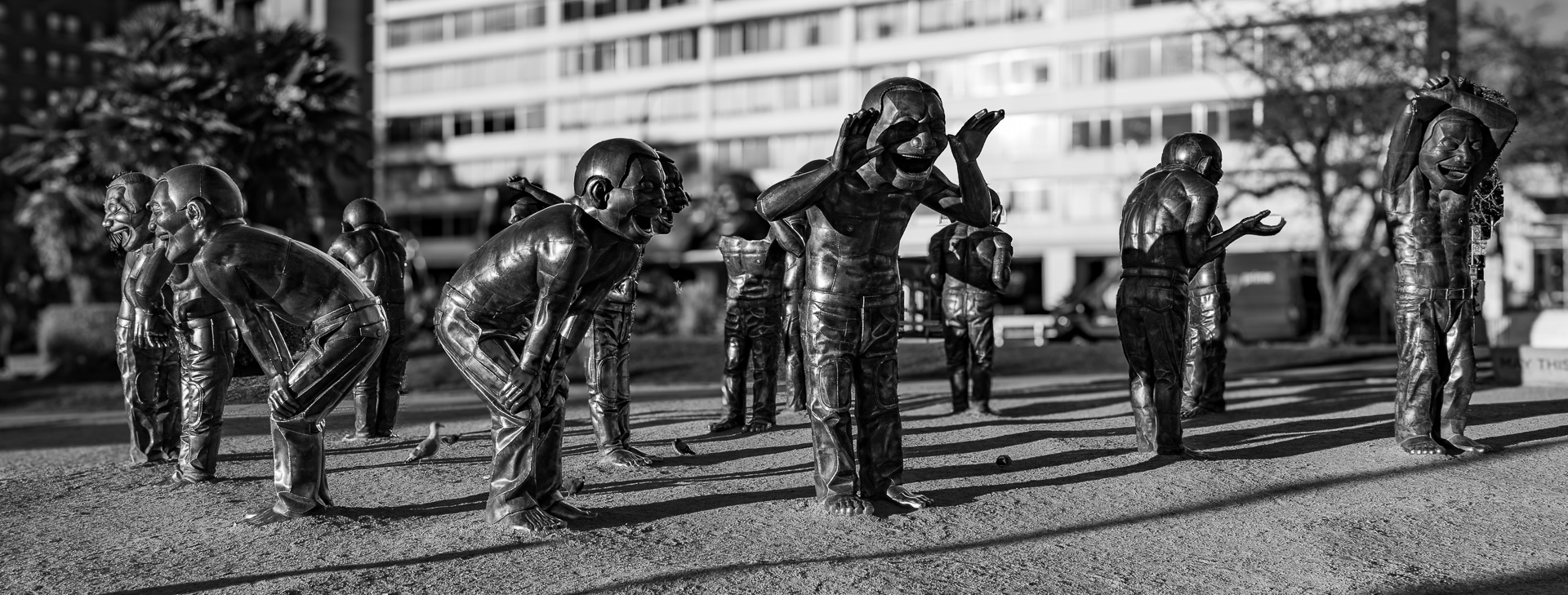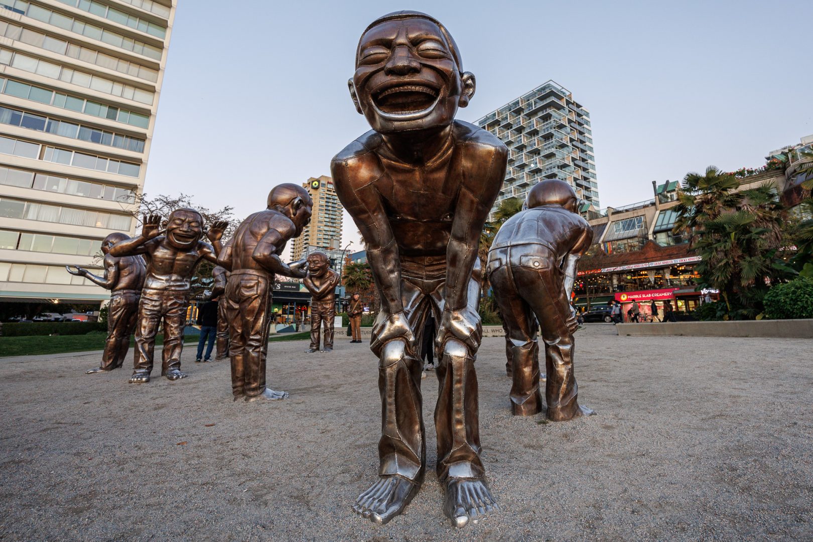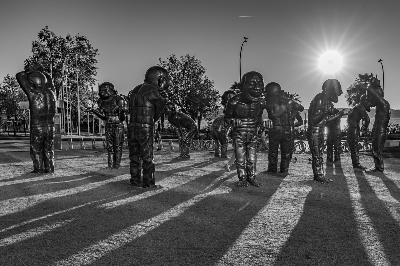 Encore une fois 😜, nous passons devant A-maze-Ing Laughter. Ces statues sont belles au soleil couchant 🤩 ! Autre couleur, autre ambiance… Le noir et blanc leur va bien aussi 😉