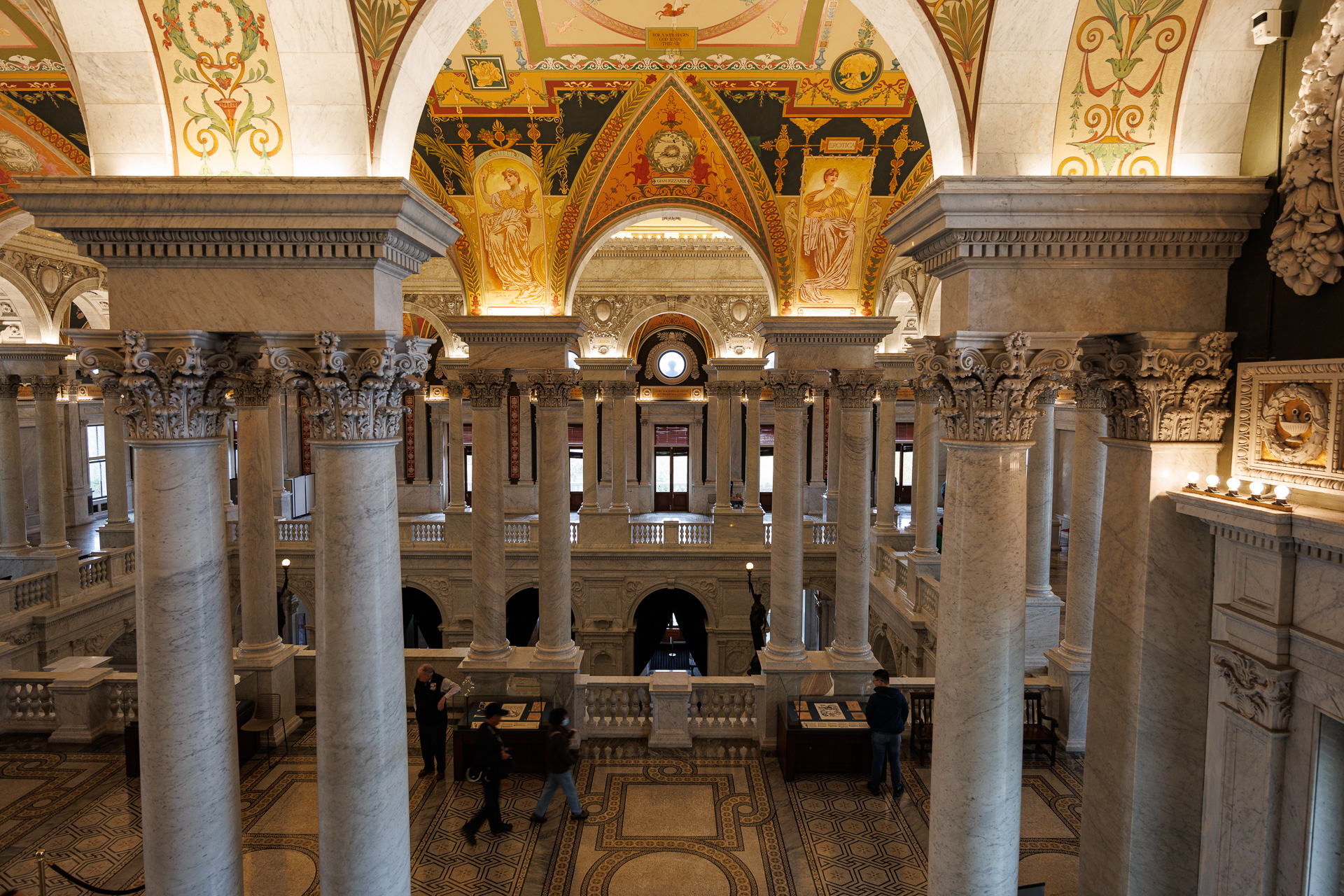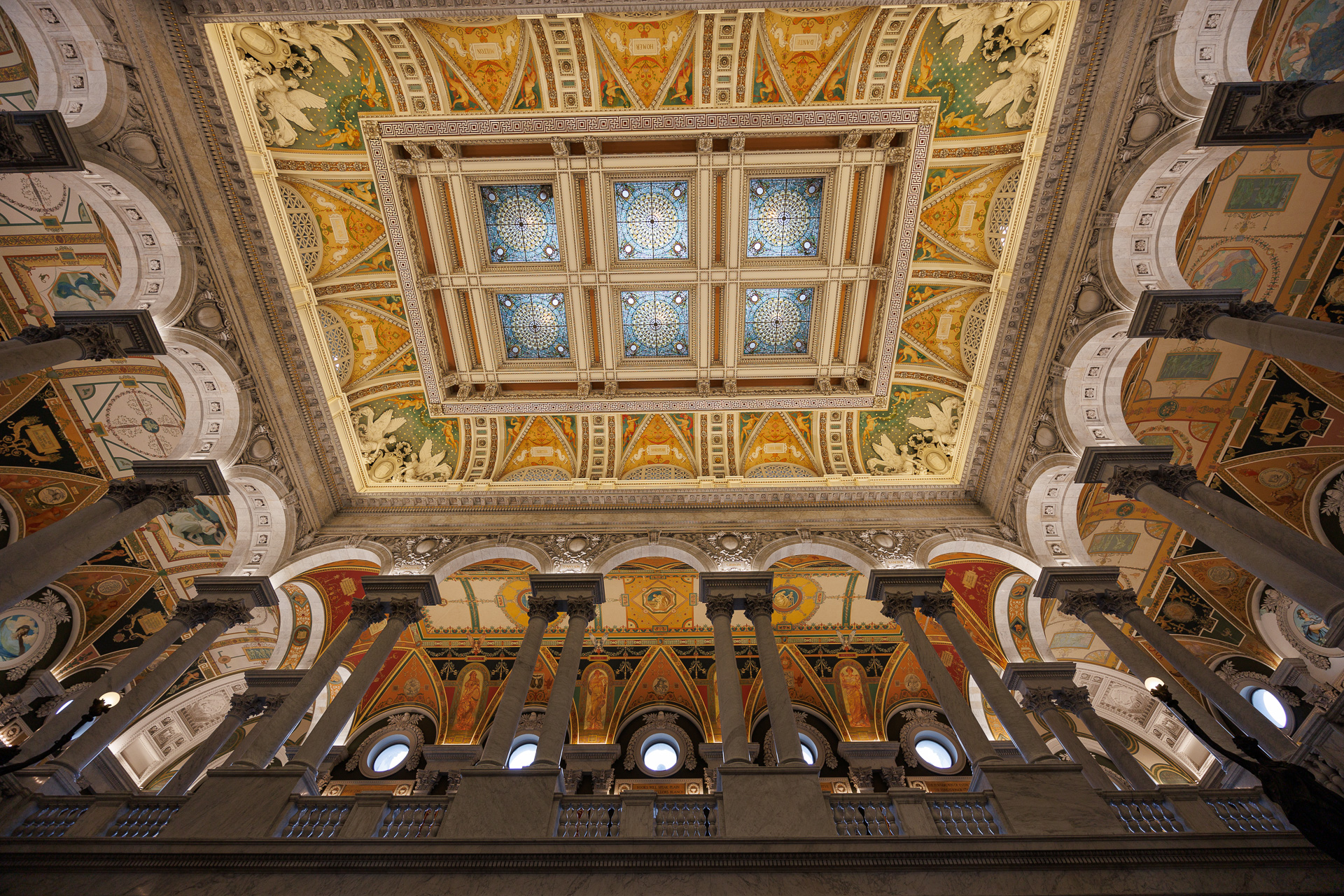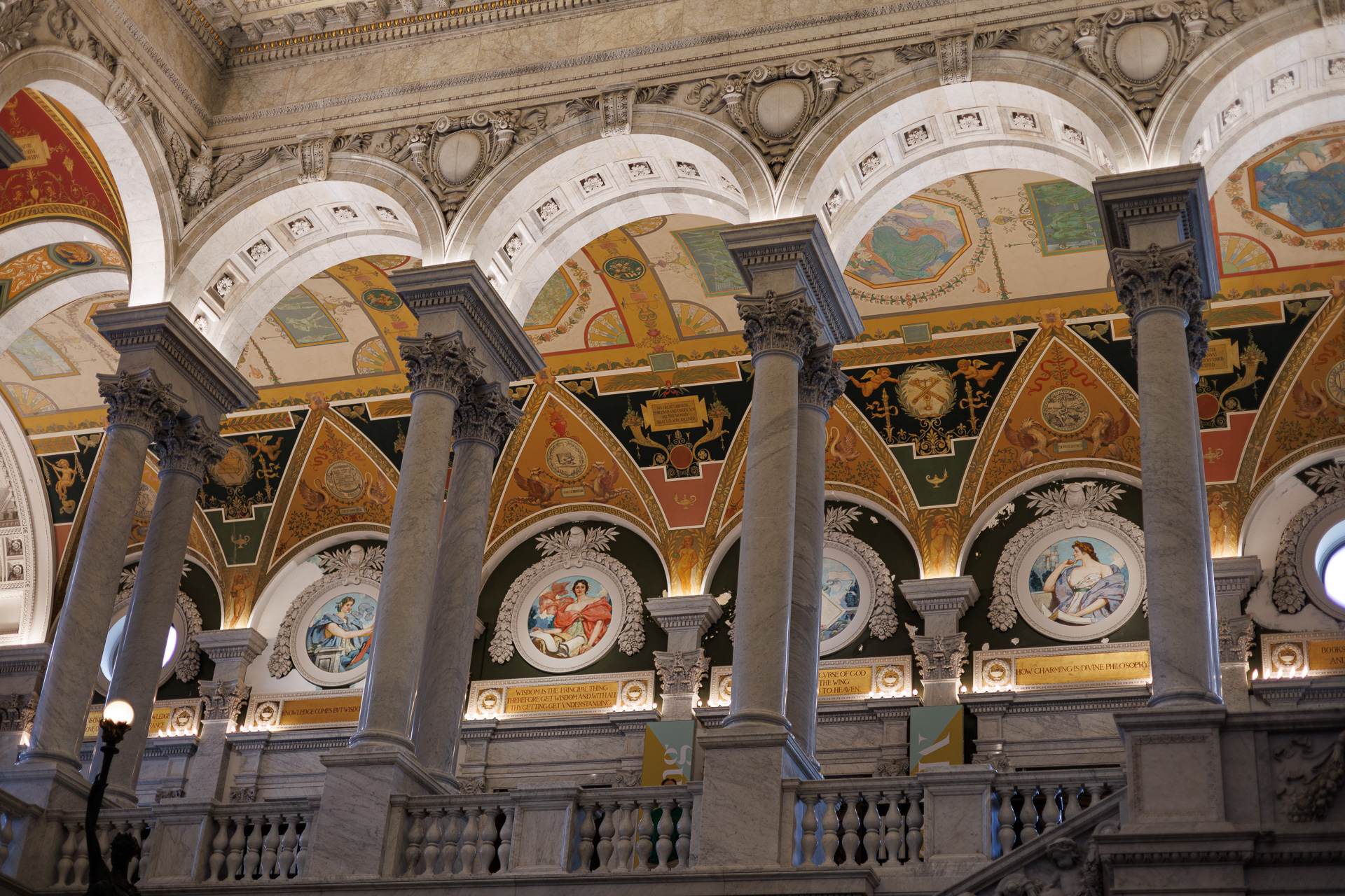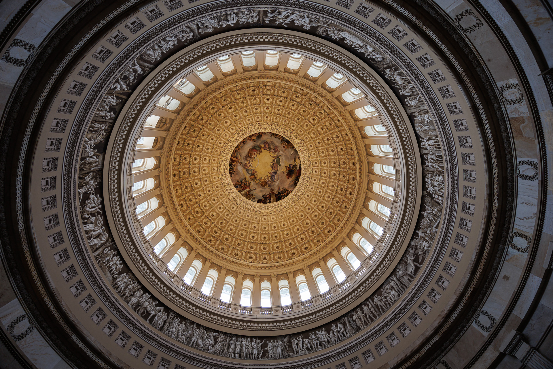 La frise décorée de fresques dans la ceinture située juste en-dessous des 36 fenêtres a été peinte pour donner l’illusion d’un relief sculpté. Les scènes conçues par Brumidi retracent l’histoire de l’Amérique depuis sa découverte par Christophe Colomb jusqu’à la découverte de l’or en Californie, en mettant l’accent sur les explorateurs espagnols et la guerre d’indépendance.