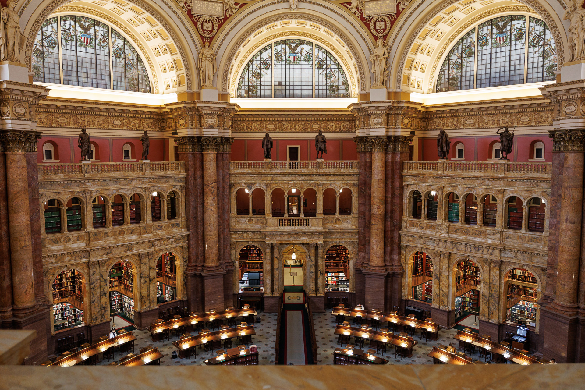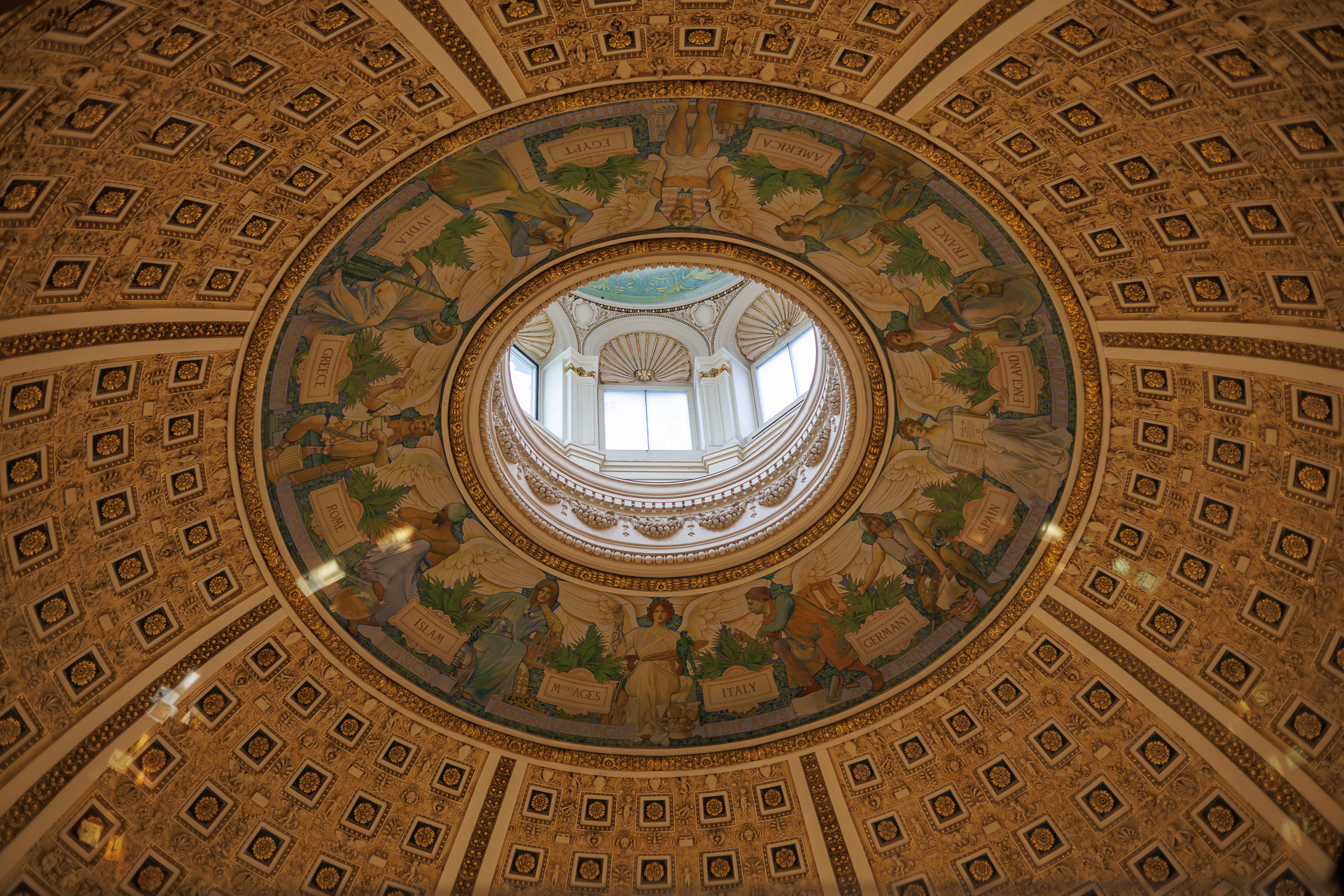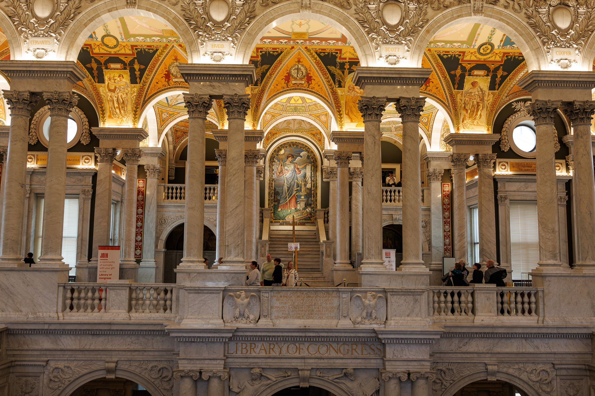 Le Thomas Jefferson building que nous allons visiter a donc ouvert ses portes en 1897 pour abriter la Bibliothèque du Congrès et c’est le plus ancien des 3 bâtiments. La conception grandiose du bâtiment s’inspire de l’Opéra de Paris et compte parmi les plus grandes réalisations architecturales des États-Unis. C’est en 1980 que le bâtiment pris le nom de Thomas Jefferson Library en hommage au 3ème Président des États-Unis. Il s’agit de la bibliothèque fédérale la plus ancienne du pays. La taille et la diversité de ses collections font de la Bibliothèque du Congrès la plus grande bibliothèque du monde. Contenant environ 164 millions d’articles dans pratiquement tous les formats, langues et sujets, ces collections constituent l’accumulation la plus complète d’expressions humaines jamais assemblées.