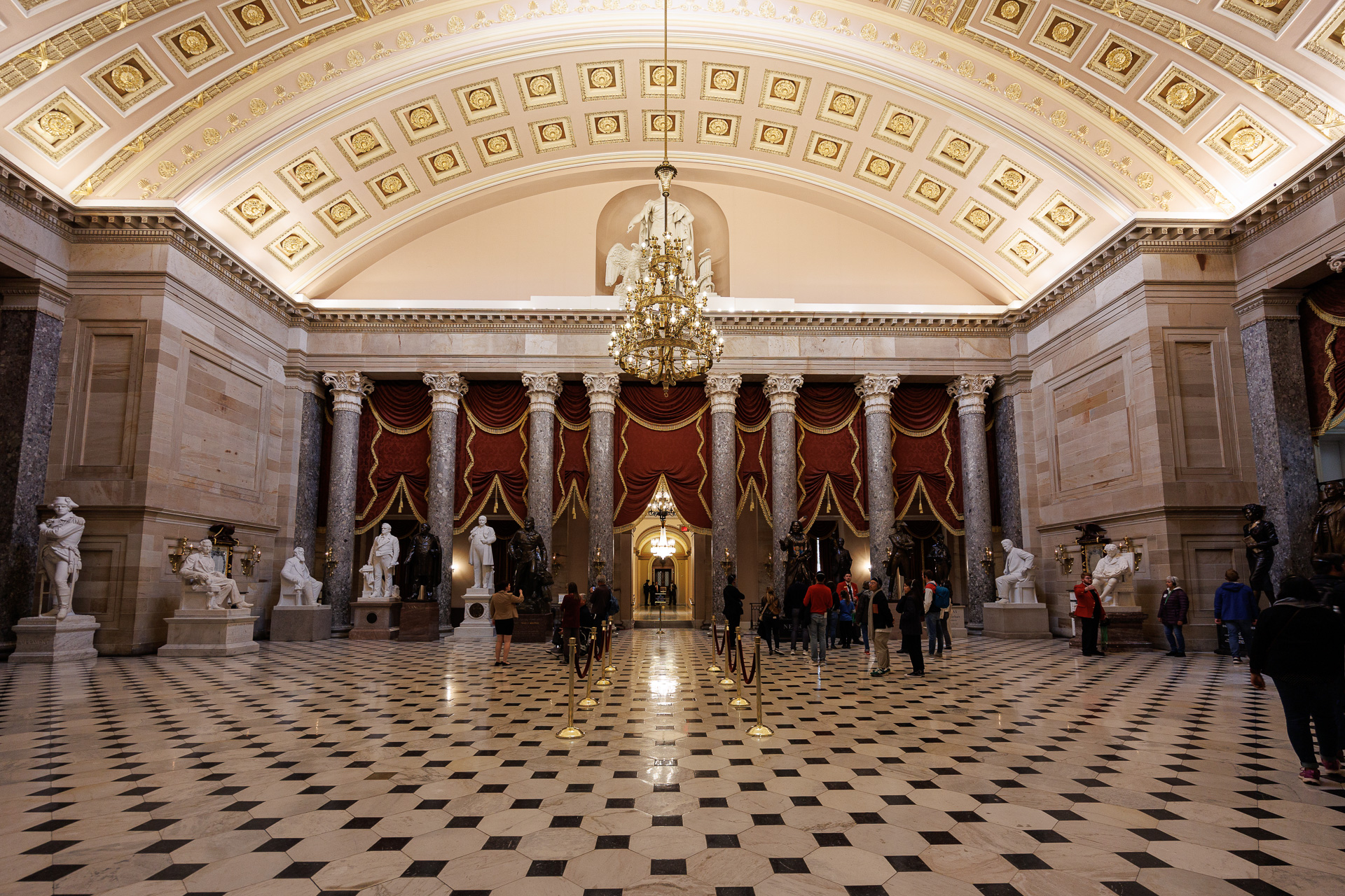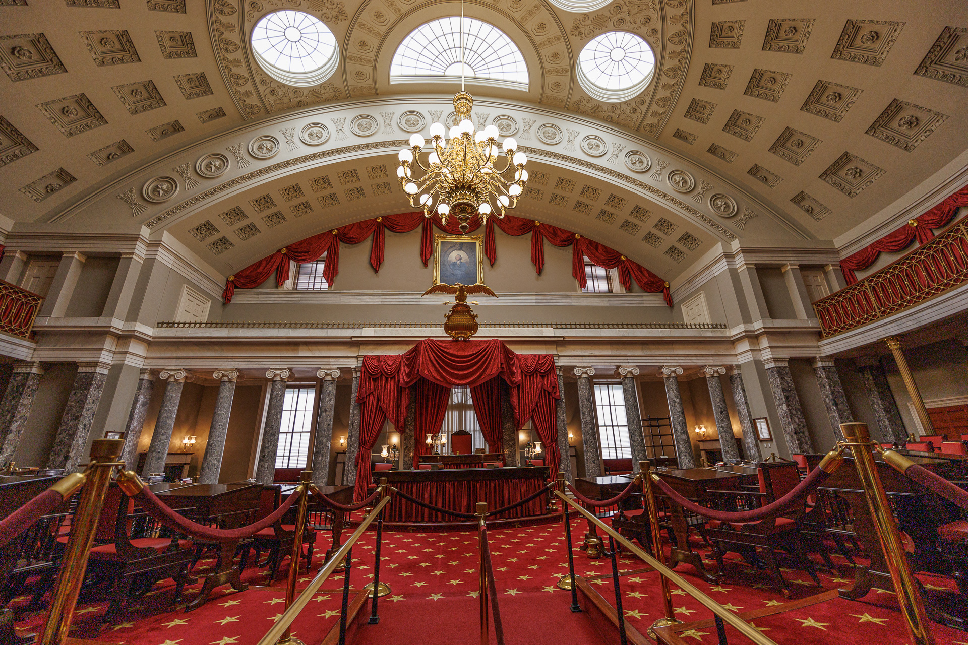 Au nord de la rotonde du Capitole se trouve l’ancienne salle du Sénat, richement décorée. Conçue par Benjamin Henry Latrobe, cette salle abritait le Sénat américain de 1819 à 1859, puis la Cour suprême des États-Unis de 1860 à 1935. Aujourd’hui, la salle restaurée est principalement utilisée comme musée, recréant la scène de nombreux moments importants de l’évolution du Sénat américain et de l’histoire législative du pays.