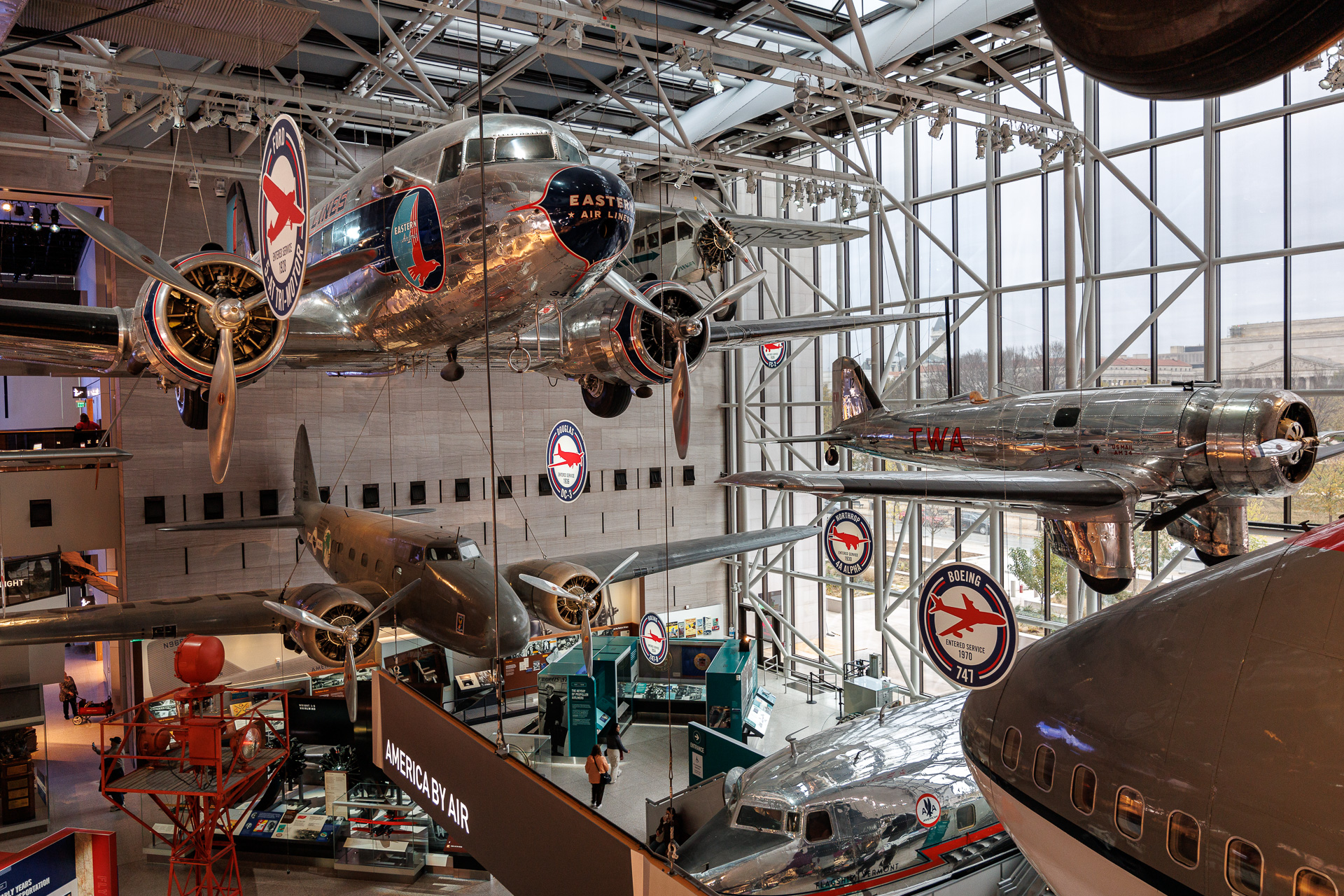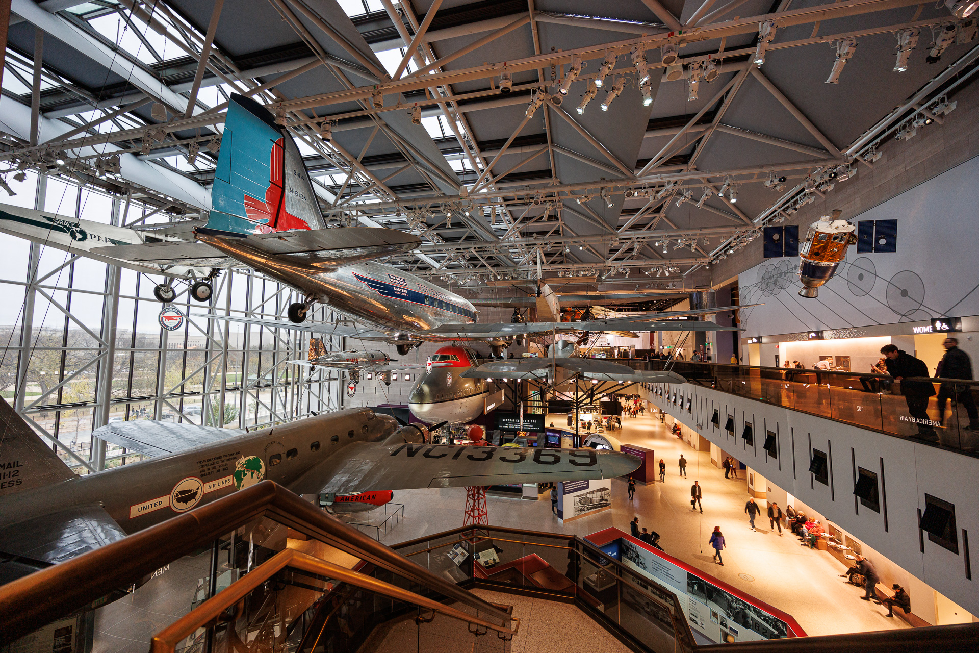 Nous voilà arrivés au National Air and Space Museum. Depuis son ouverture sur le National Mall en 1976, ce musée présente au travers de huit halls d’exposition les incroyables avancées technologiques qui ont fait progresser l’aviation et l’exploration spatiale. Certains halls sont en travaux mais ce n’est pas grave car nous avons prévu d’aller visiter le 2ème site le  » Steven F. Udvar-Hazy Center » qui se trouve à quelques dizaines de kilomètres de Washington.