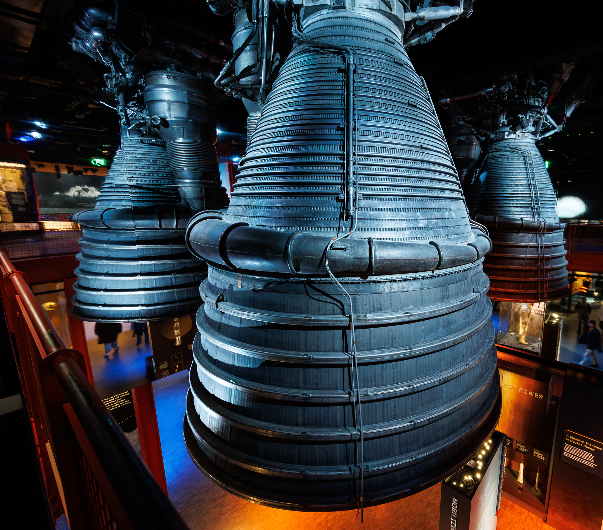 Il s’agit d’un des 4 moteurs qui sert à propulser la fusée. Le moteur F-1 fut construit en 1963 comme moteur- test. Il a fait 4 tests et a fonctionné au total 192,6 secondes. Il n’y a qu’un seul moteur de présenté mais les glaces qui l’entourent donnent un bel effet de groupe !