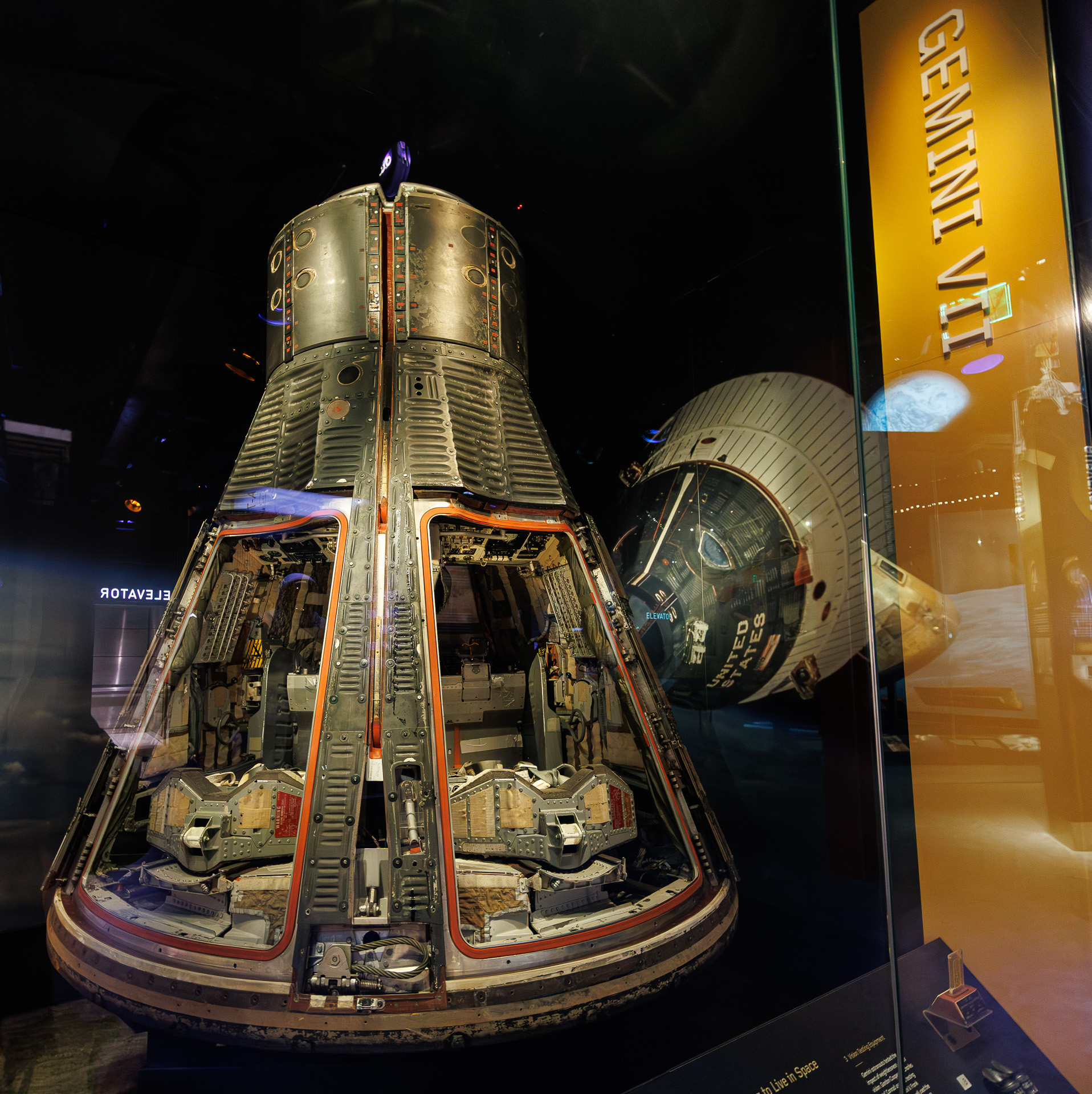 Les astronautes Frank Borman et James Lovell furent lancés en orbite à bord de ce vaisseau spatial, Gemini VII, le 4 décembre 1965. Leur mission première était de démontrer que l’homme pouvait vivre en apesanteur pendant 14 jours, un record qui tiendra jusqu’en 1970. Ce module est la seule partie de Gemini qui soit revenue sur Terre. La section du nez a été abandonnée au dessus de l’océan lors du déploiement du parachute.