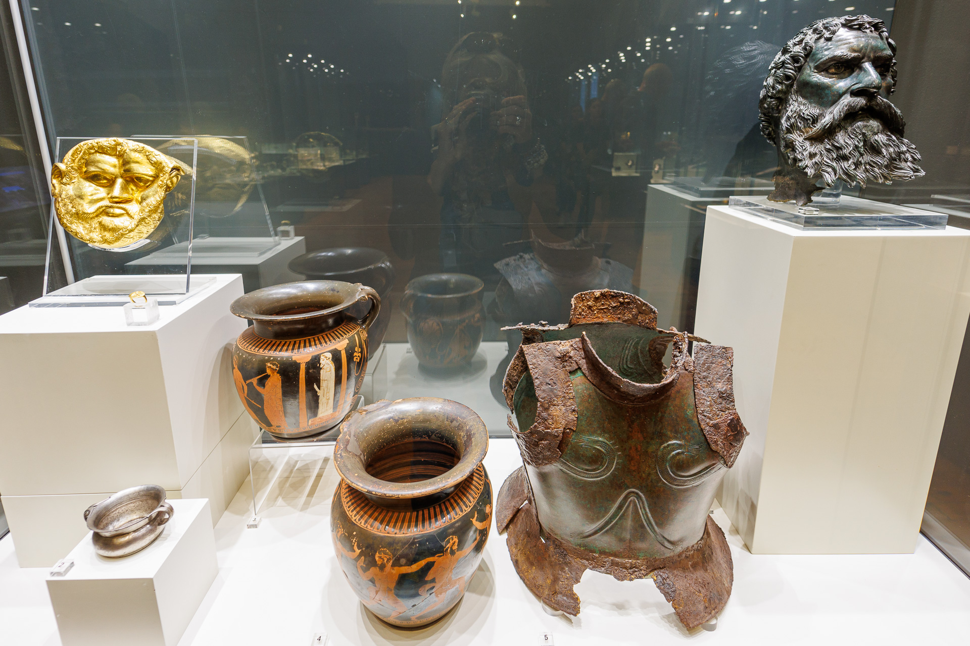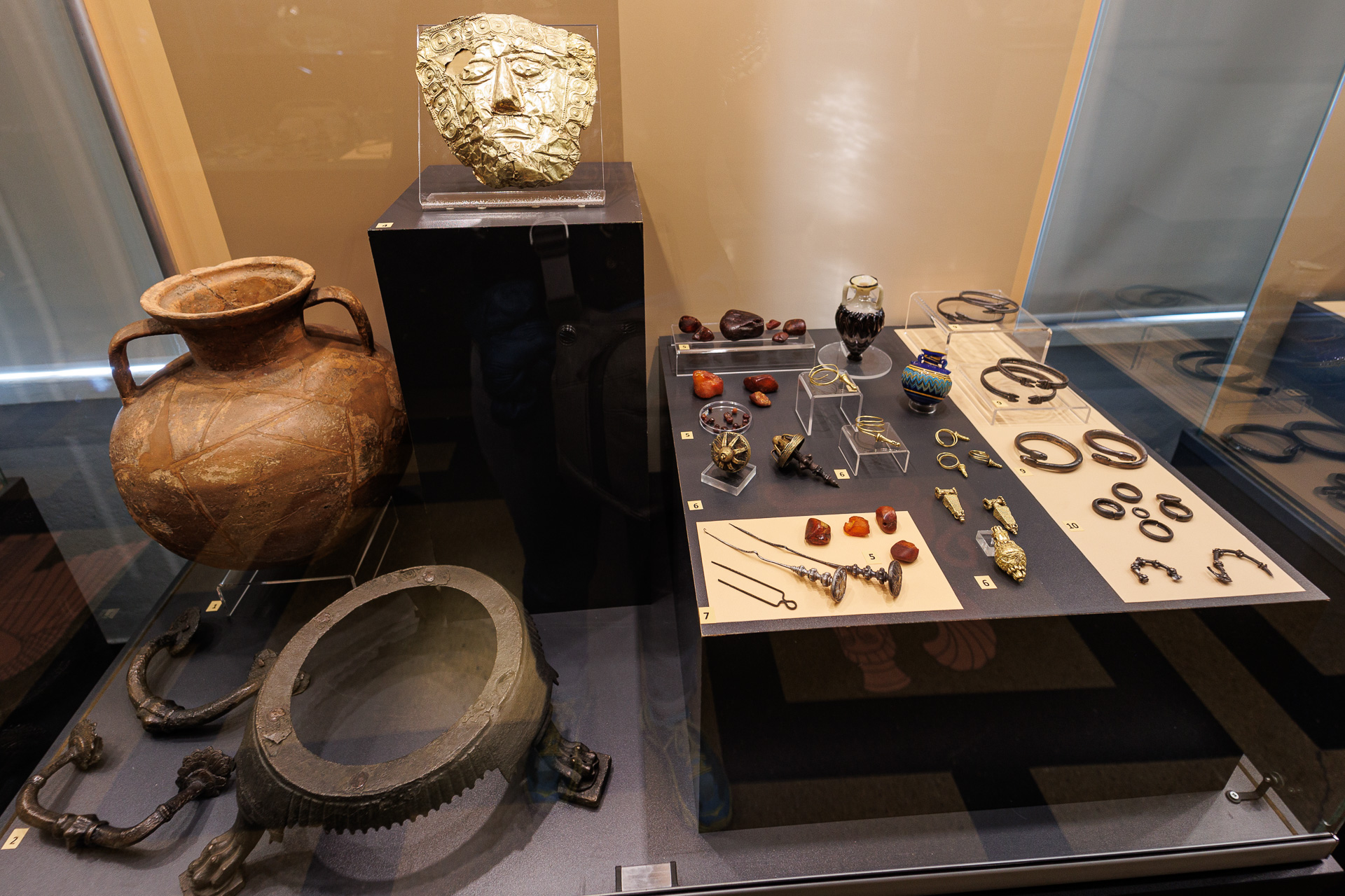 Une autre partie de la salle est consacrée à la nécropole de Trebenichta qui date du 7ème siècle avant JC. Elle fut découverte en 1918. Les archéologues y ont découvert plusieurs tombes princières. Celles-ci contenaient notamment des bijoux, des armes et des masques mortuaires en or très particuliers qui rappellent les usages mycéniens. Ce panneau explique la disposition et la liste des objets accompagnant le défunt dans son voyage dans l’au-delà. Compte-tenu de la valeur de certains objets qui y étaient déposés, certaines tombes ne sont pas parvenus intactes jusqu’à nous…