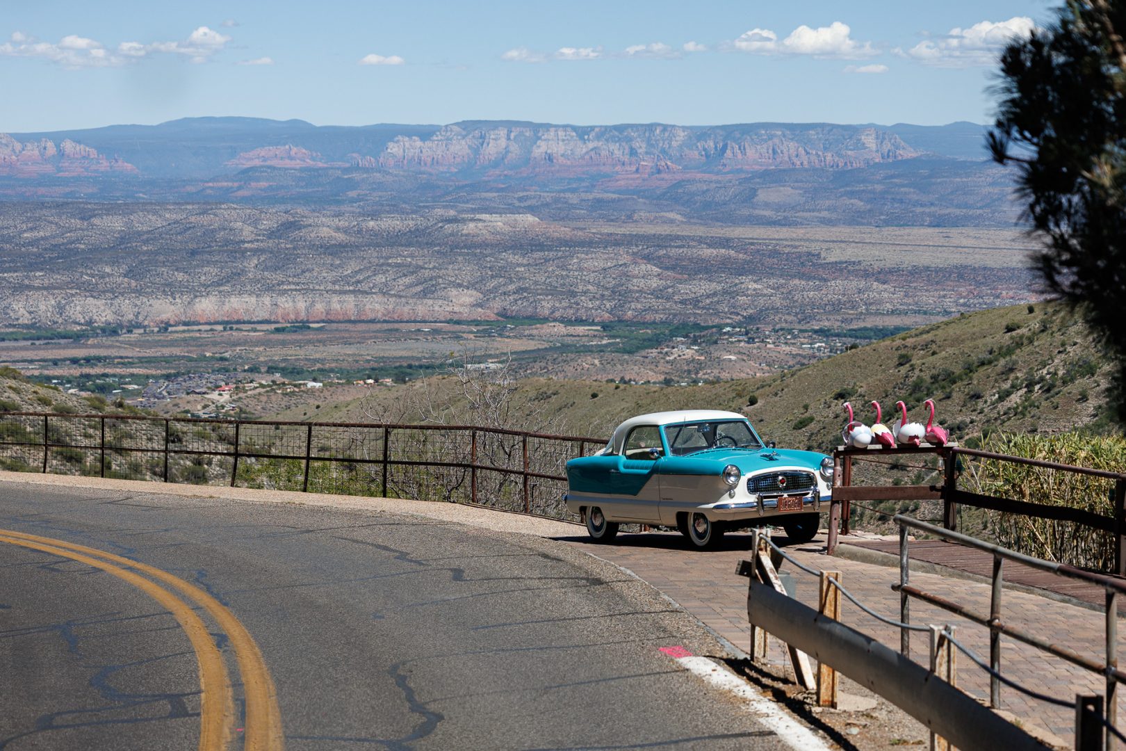 Après déjeuner, nous reprenons la route. A la sortie de la ville, nous apercevons cette jolie voiture bien gardée par 4 flamants roses 🤣 !