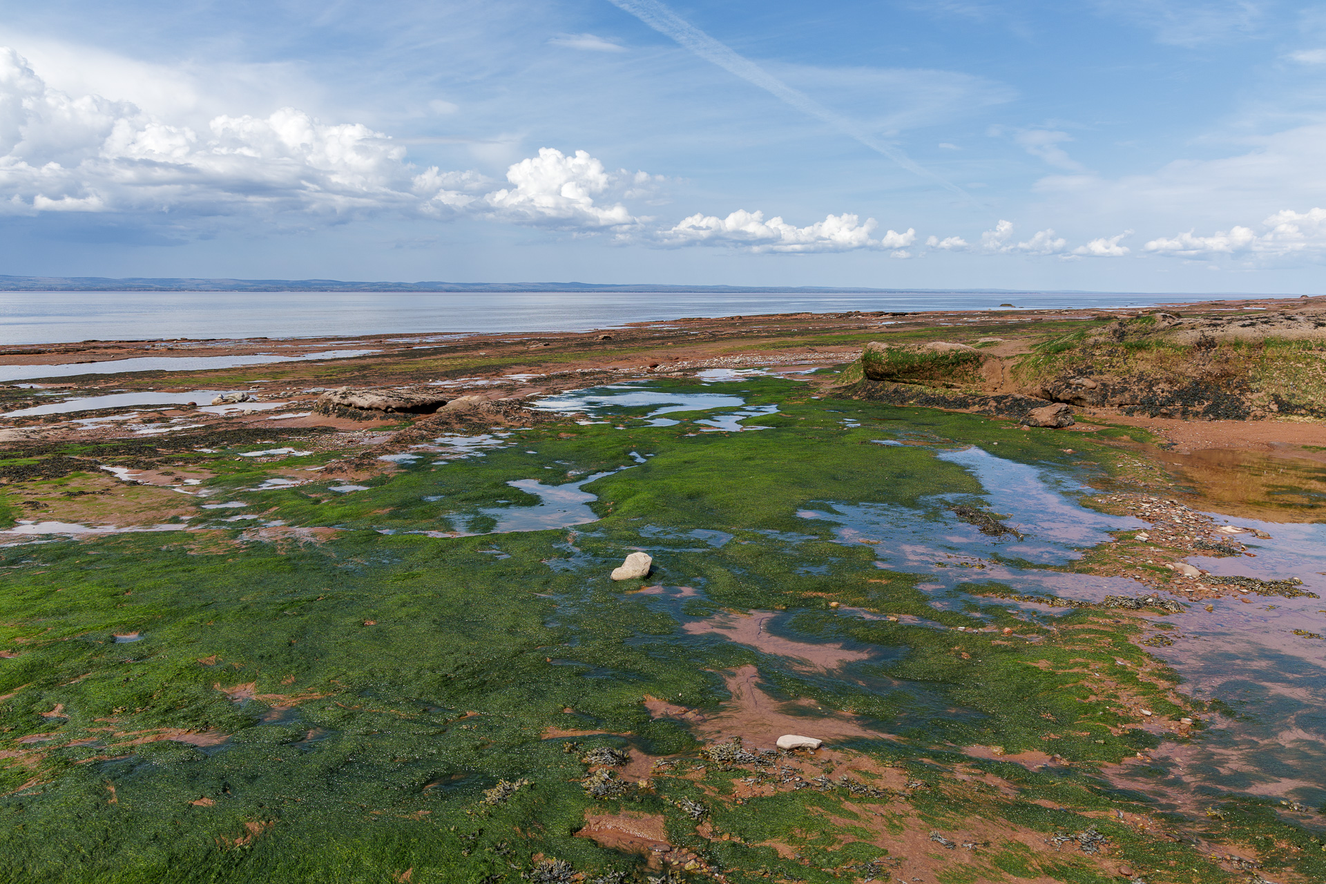Nous arrivons à marée basse et c’est donc l’occasion de parcourir le pied des falaises et le lit de l’océan découvert (= l’estran). Avec un tel marnage, c’est grand !