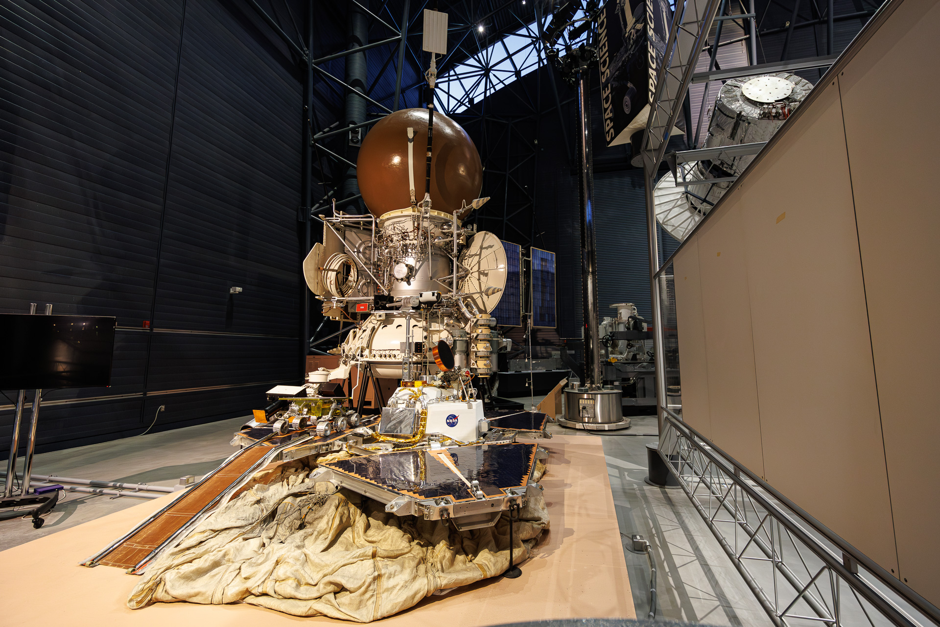 Mars Pathfinder est le premier engin spatial à atterrir sur la planète rouge depuis la mission Viking en 1976. L’objet présenté est un prototype d’ingénierie grandeur nature de l’engin spatial lancé le 4 décembre 1996. En atteignant Mars le 4 juillet 1997, l’engin spatial est entré dans la fine atmosphère de la planète, a été ralenti par un parachute, puis par des fusées, puis a atterri en rebondissant sur des coussins gonflables. La coque de protection s’est ensuite dépliée pour fournir les trois plates-formes plates, dont l’une contenait un rover (Sojourner).
