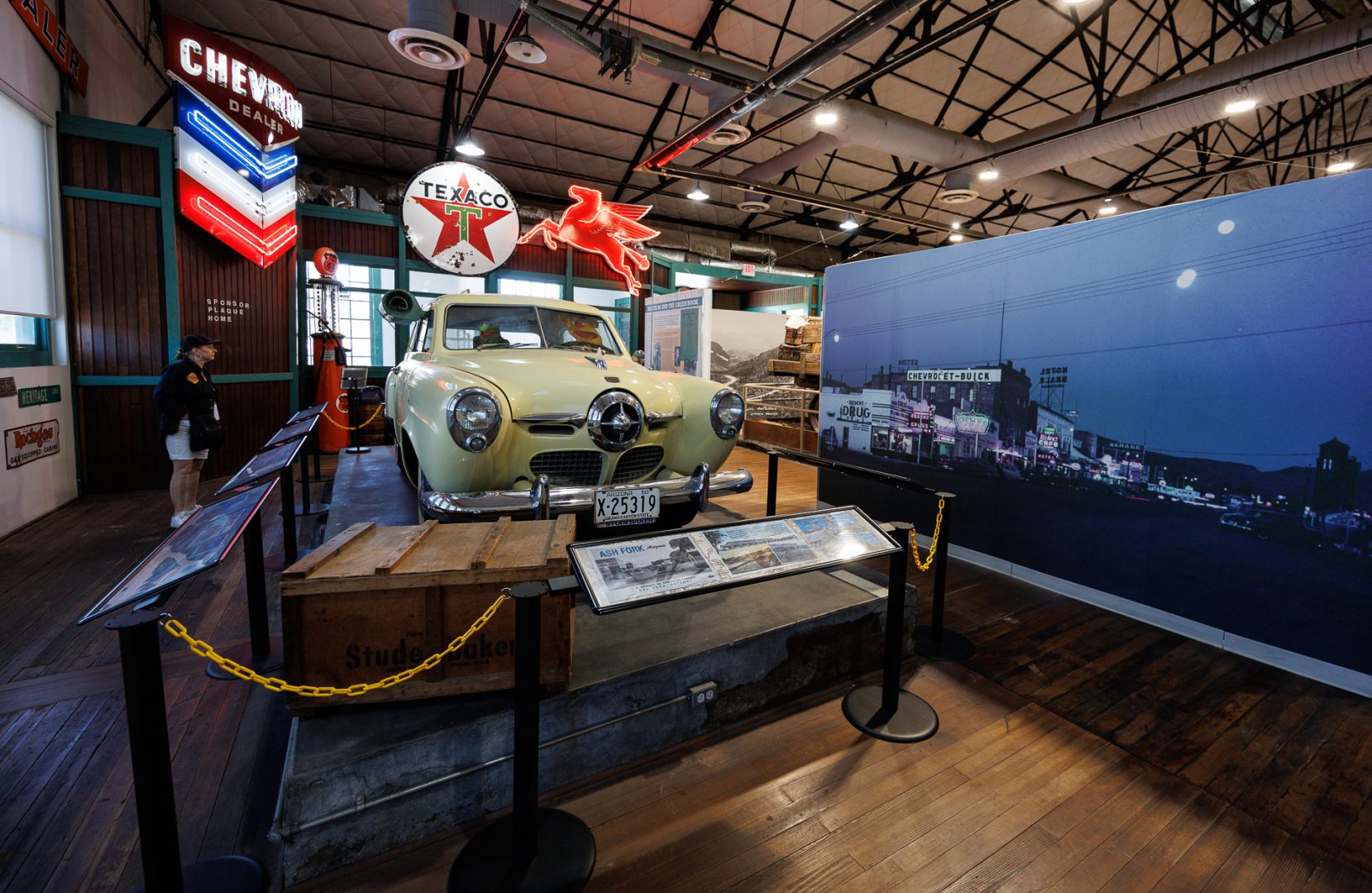 Après la seconde guerre mondiale, la Route 66 est devenue un lieu de villégiature et de liberté recherché par les amoureux des grands espaces et des voitures. Cette voiture est une Studebaker Champion Coupée de 1950. Cette voiture emblématique, surnommée « Bullet Nose » pour sa calandre en forme de nez d’avion, est la pièce maîtresse du musée. Créée par Raymond Loewy, elle symbolisait l’optimisme de l’après-guerre et l’ère du jet. Le modèle exposé arbore un jaune typique des années 50. Elle illustre l’évolution du style automobile américain sur la « Mother Road », passant de formes carrées à des lignes aérodynamiques. Elle reste l’un des objets les plus photographiés de Kingman pour son look futuriste rétro et nous ne l’avons pas loupé 😉.