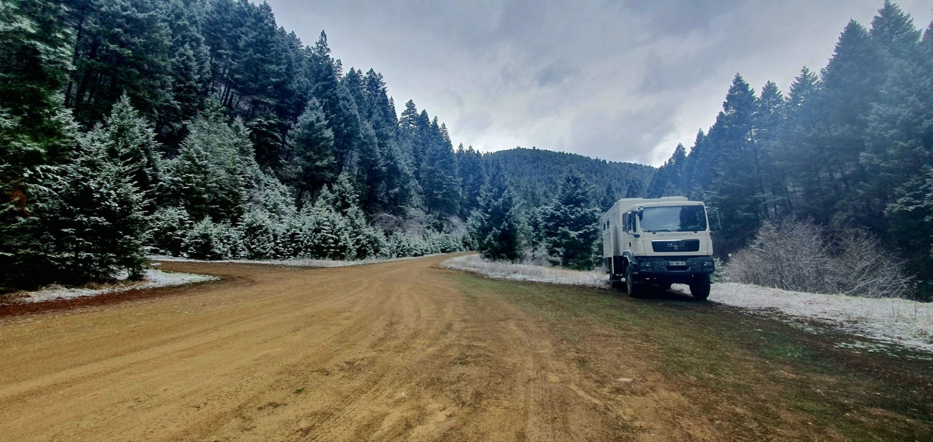201114 km : Ce matin, nous nous réveillons dans un environnement recouvert de quelques flocons de neige… C’est beau 🤩 ! Heureusement, la route en terre est dégagée et nous pouvons redescendre dans la vallée sans crainte de glisser 😉 !