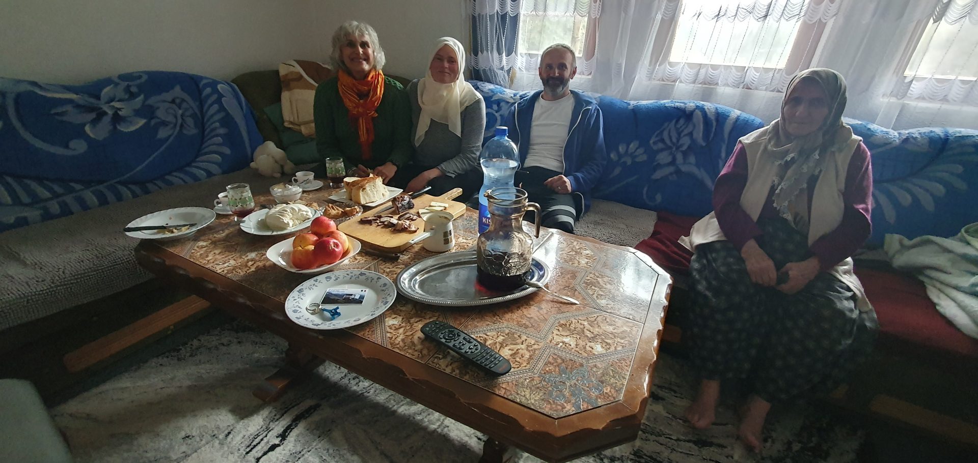 Nous passerons 1h30 avec Joleta, Avdibašić et sa maman, leurs 3 enfants étant à l’école. Nous avons reçu un accueil vraiment très chaleureux. Ils nous ont fait goûter leur production maison de fromage, de viande fumée de bœuf, de jus de myrtilles, de pommes et de confiture de cynorrhodon avec un bon café turc, sans nous accompagner car c’est le Ramadan en ce moment. Nous étions un peu gênés de manger devant eux en sachant que leur prochain repas ne serait pas avant 20h.