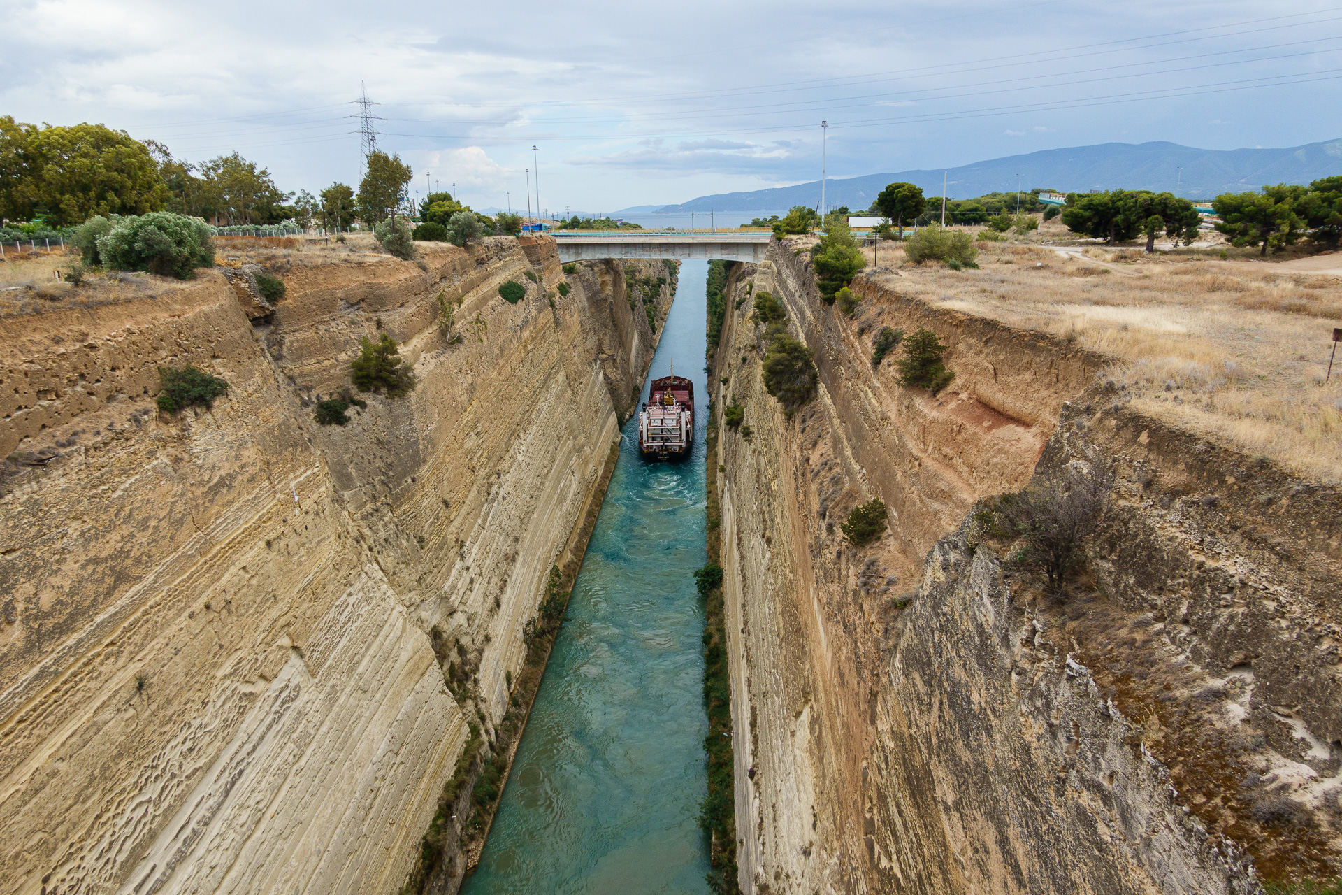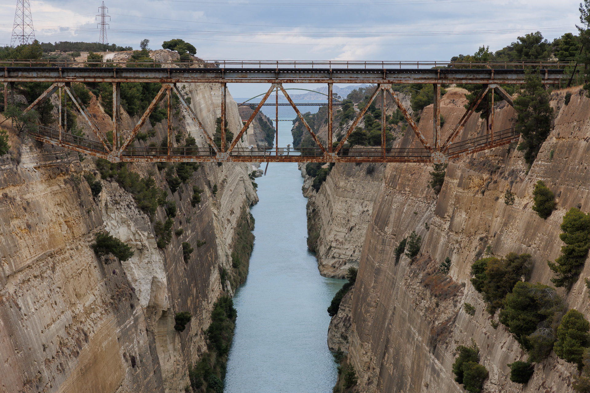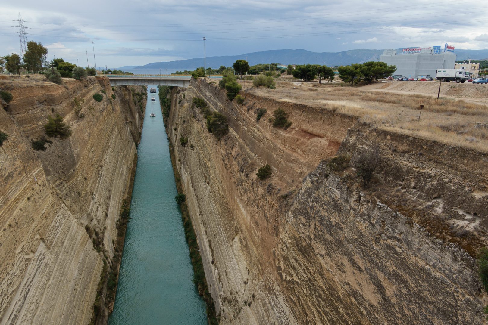 En quittant notre bivouac ce matin, nous avons l’opportunité de nous arrêter sur un parking qui va nous permettre de voir le canal de Corinthe sous un autre angle.